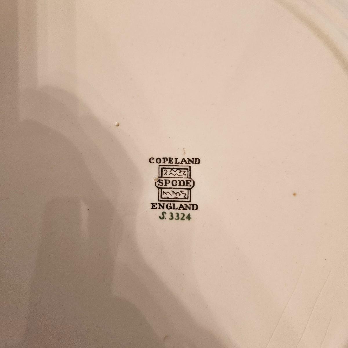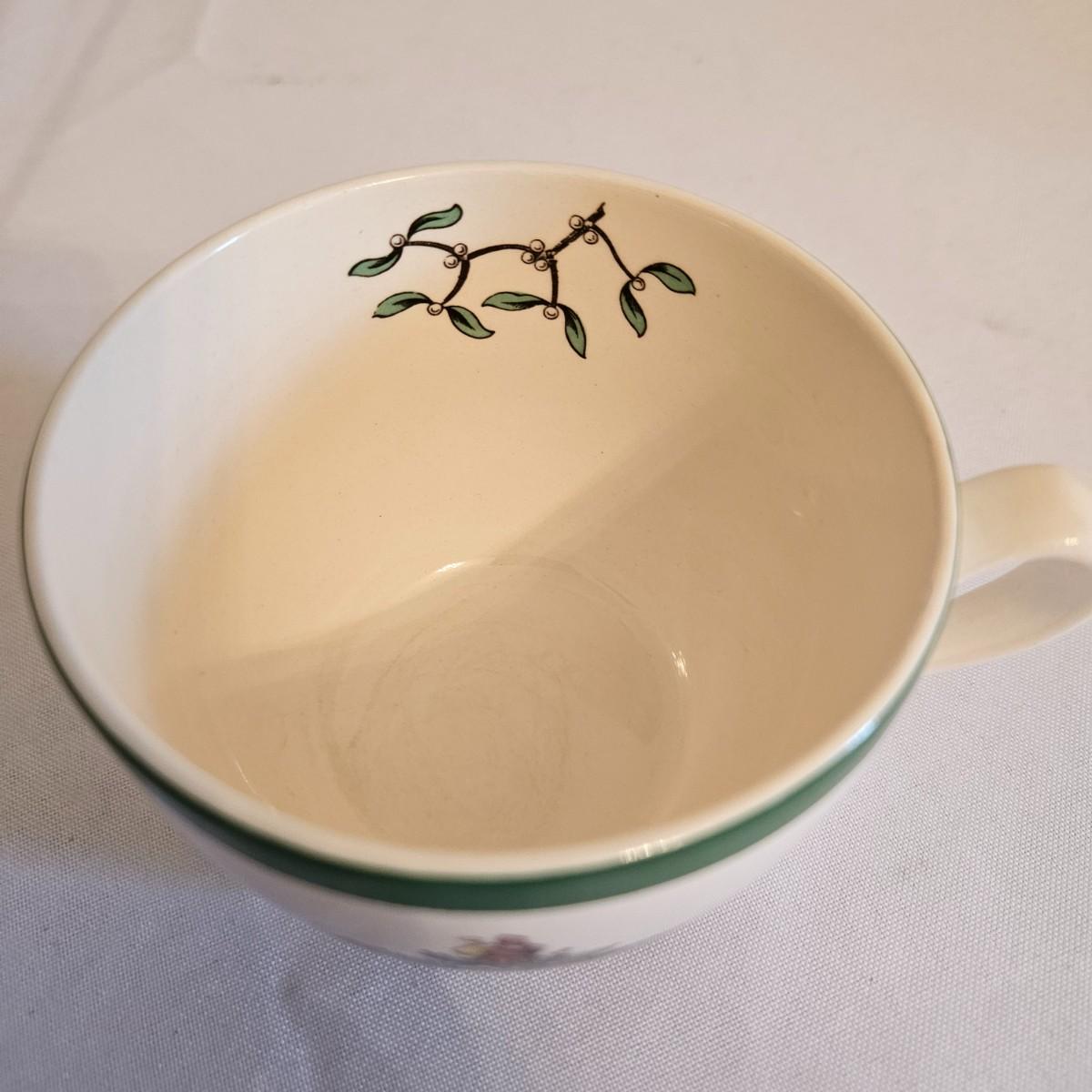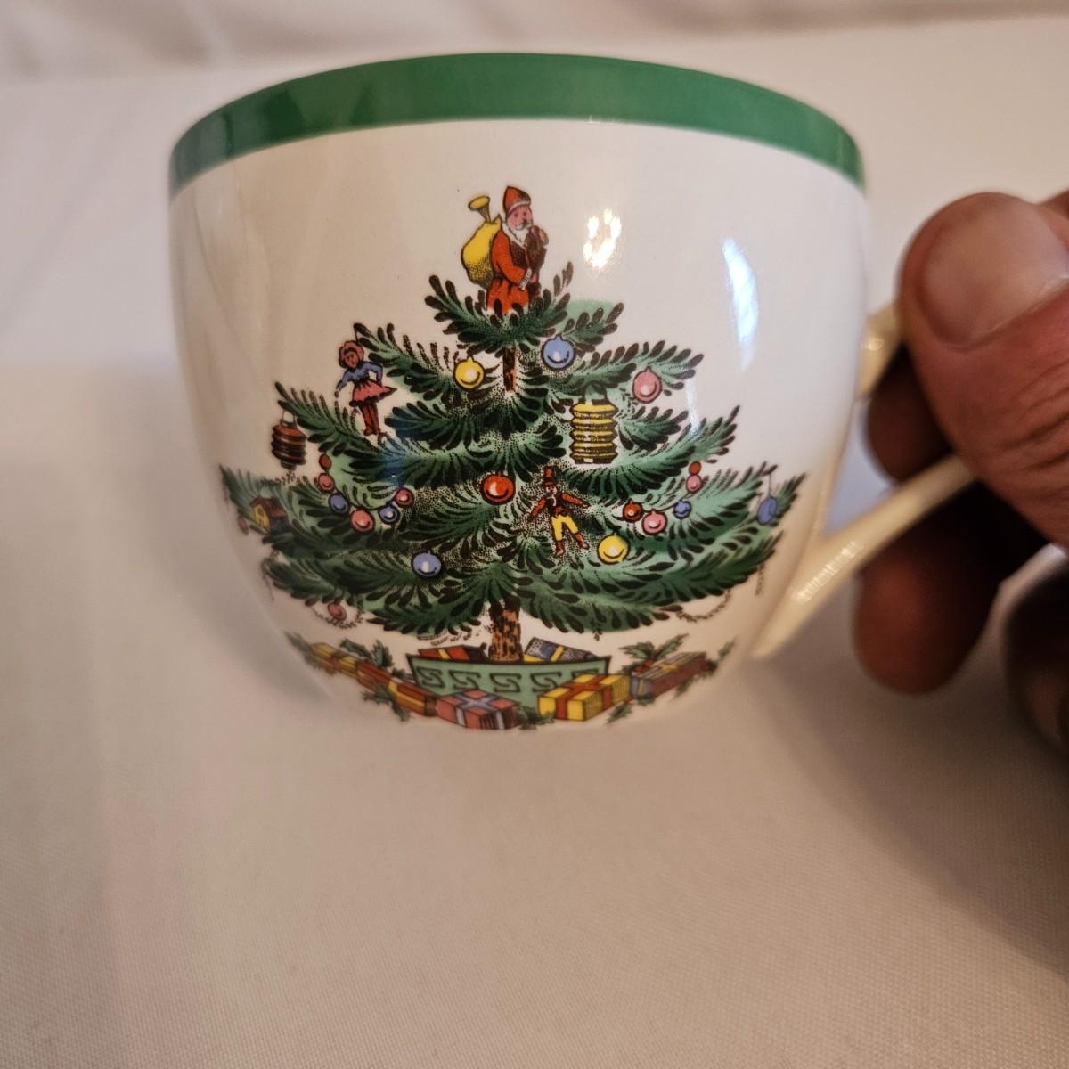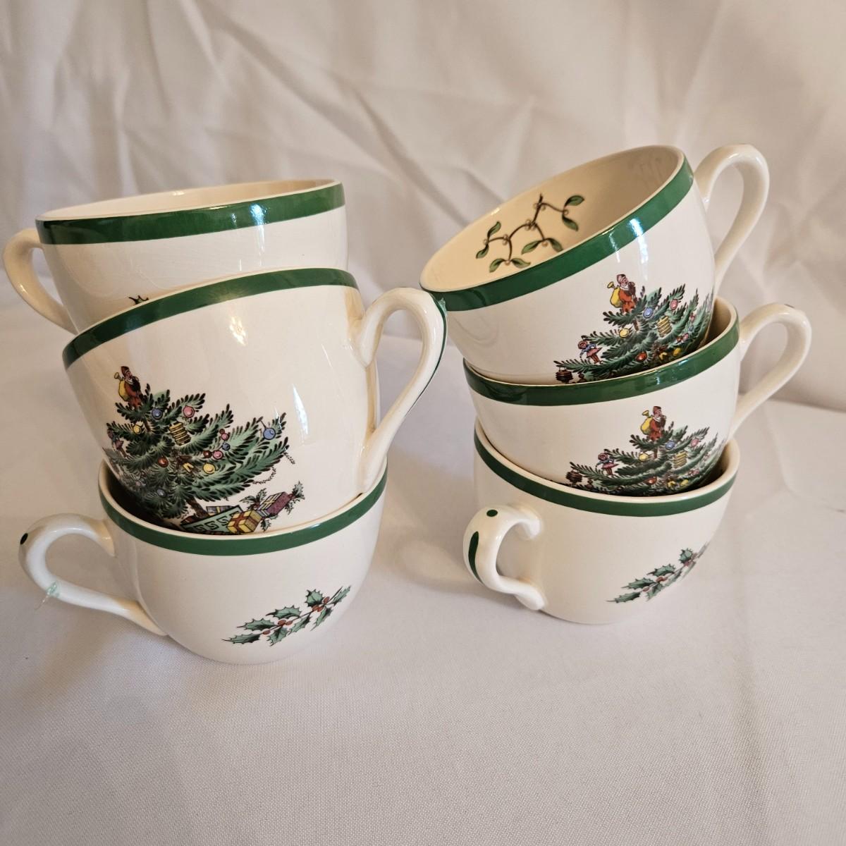 A six place setting Spoke Christmas china set that includes a large serving platter. There are six dinner plates, saucers and coffee cups, in addition to ten salad plates. The serving platter measures approximately 16" x 13". Shipping available.