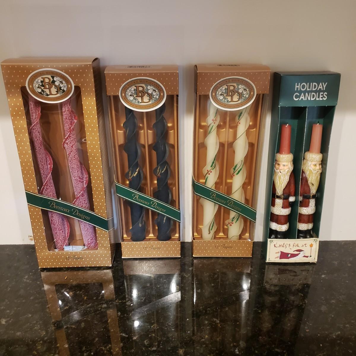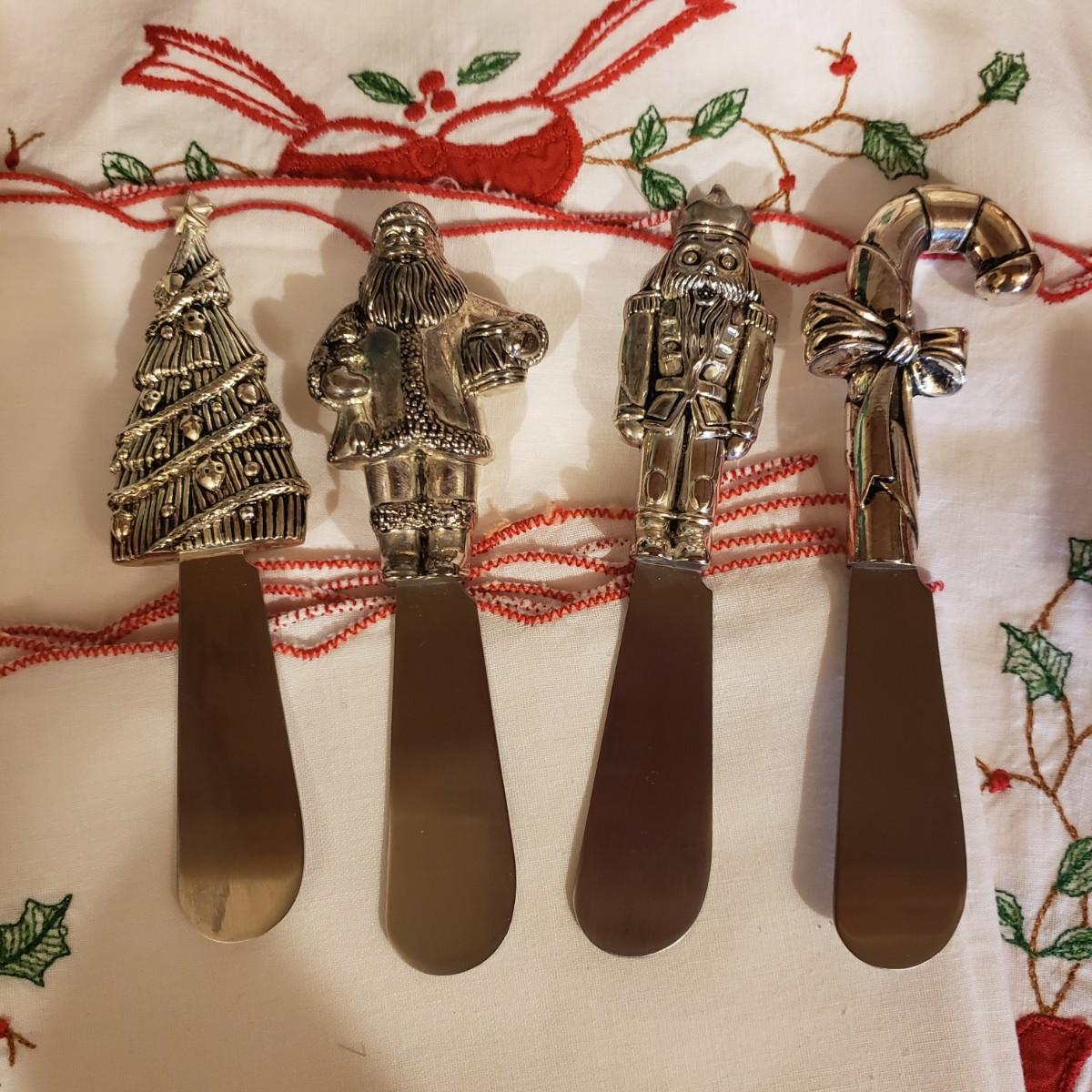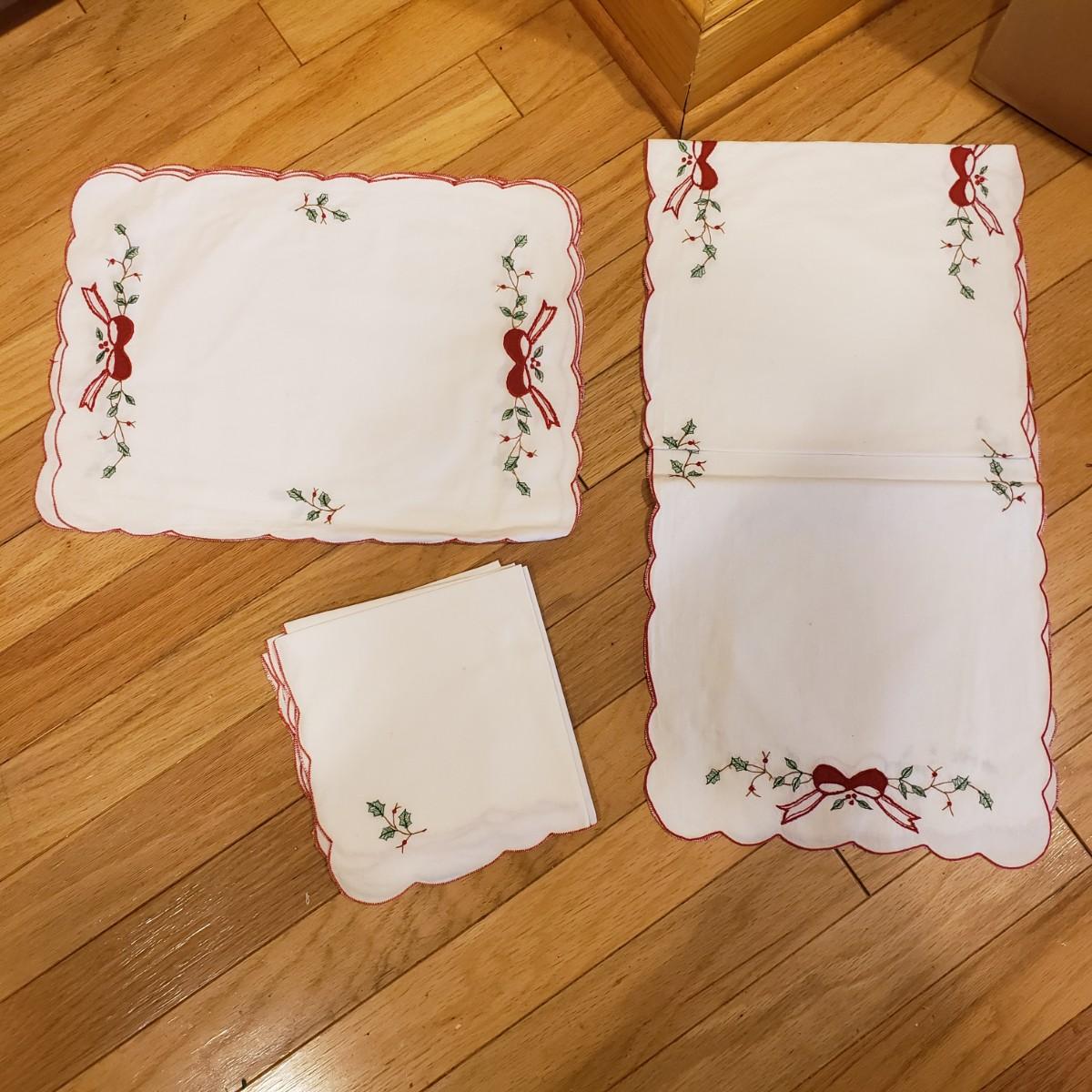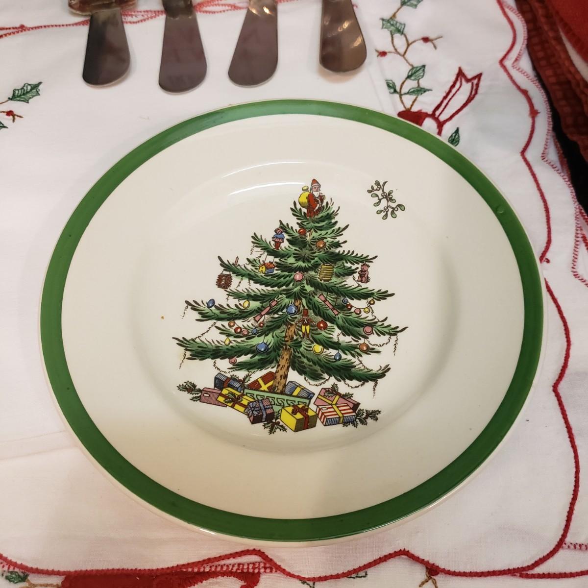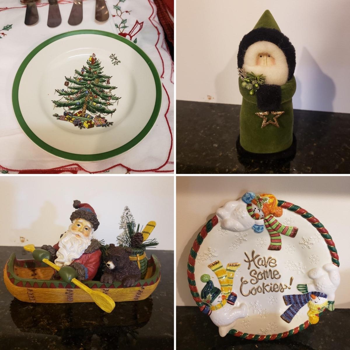 This Christmas lot features a Spode Christmas plate (6"), two Santa stockings, four small knives that are heavy, and a four piece linen, white placemat/napkin/table runner set. The Basic Spirt sets are pewter and hand crafted in Nova Scotia. They come in a blue velet bag. The only piece that had a marking was the tree, see picture. The Fitz and Floyd plate measures 10". There are eight red/gold cloth napkins. The green/red/gold rectangular table cloth measures 112" x 84". There are multiple Crate and Barrel candles. If the bottoms were not pictured, they did not have any markings. There are three NIB tapered 12" beeswax candles. See pictures for more details.