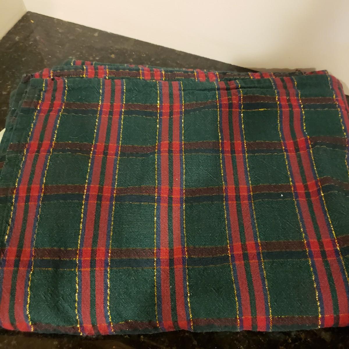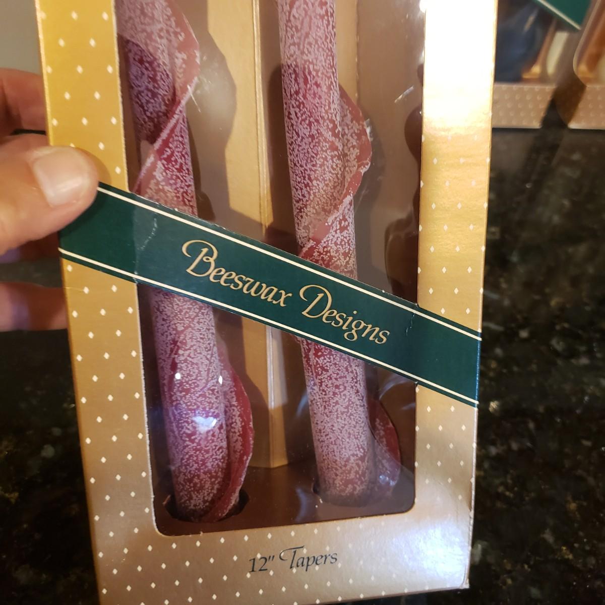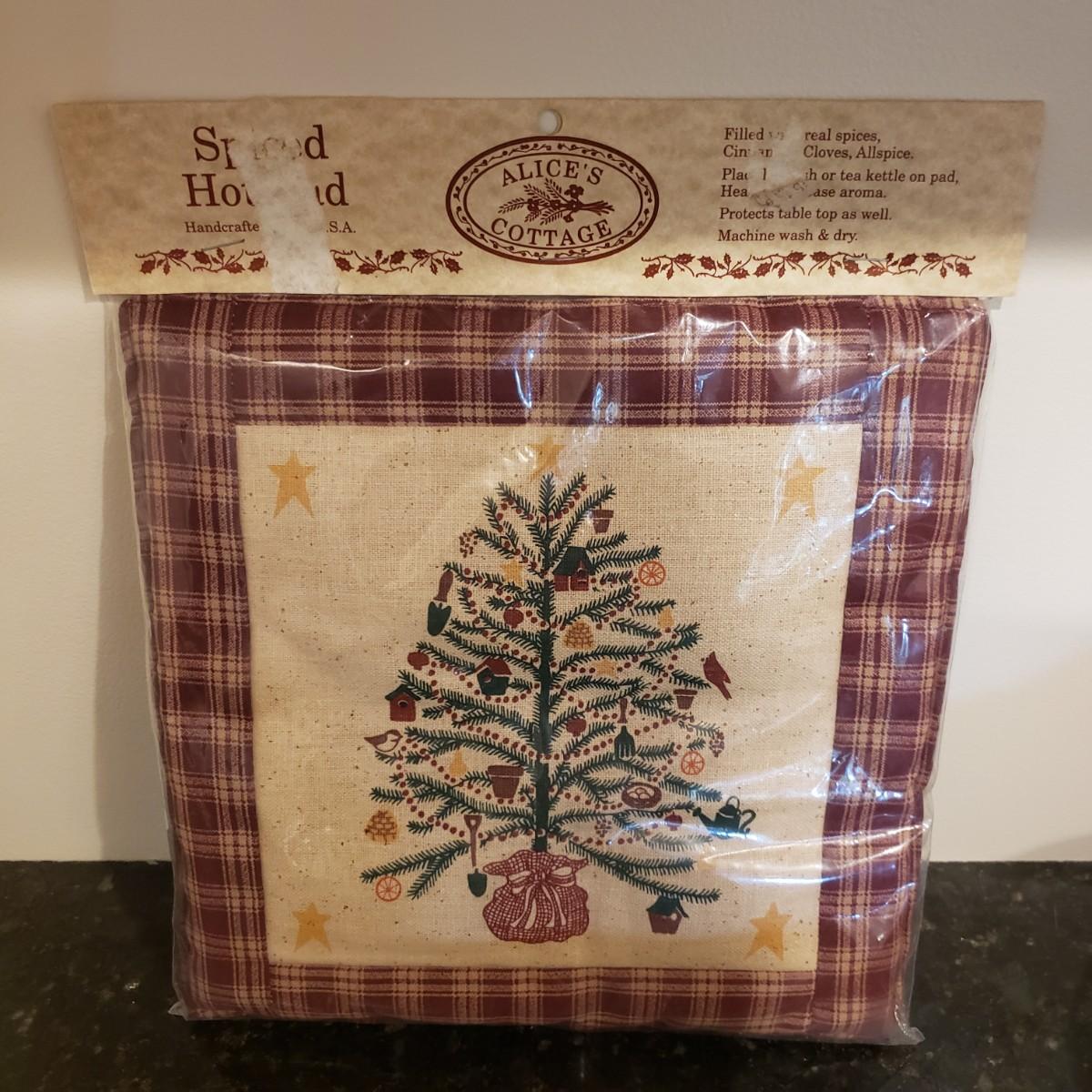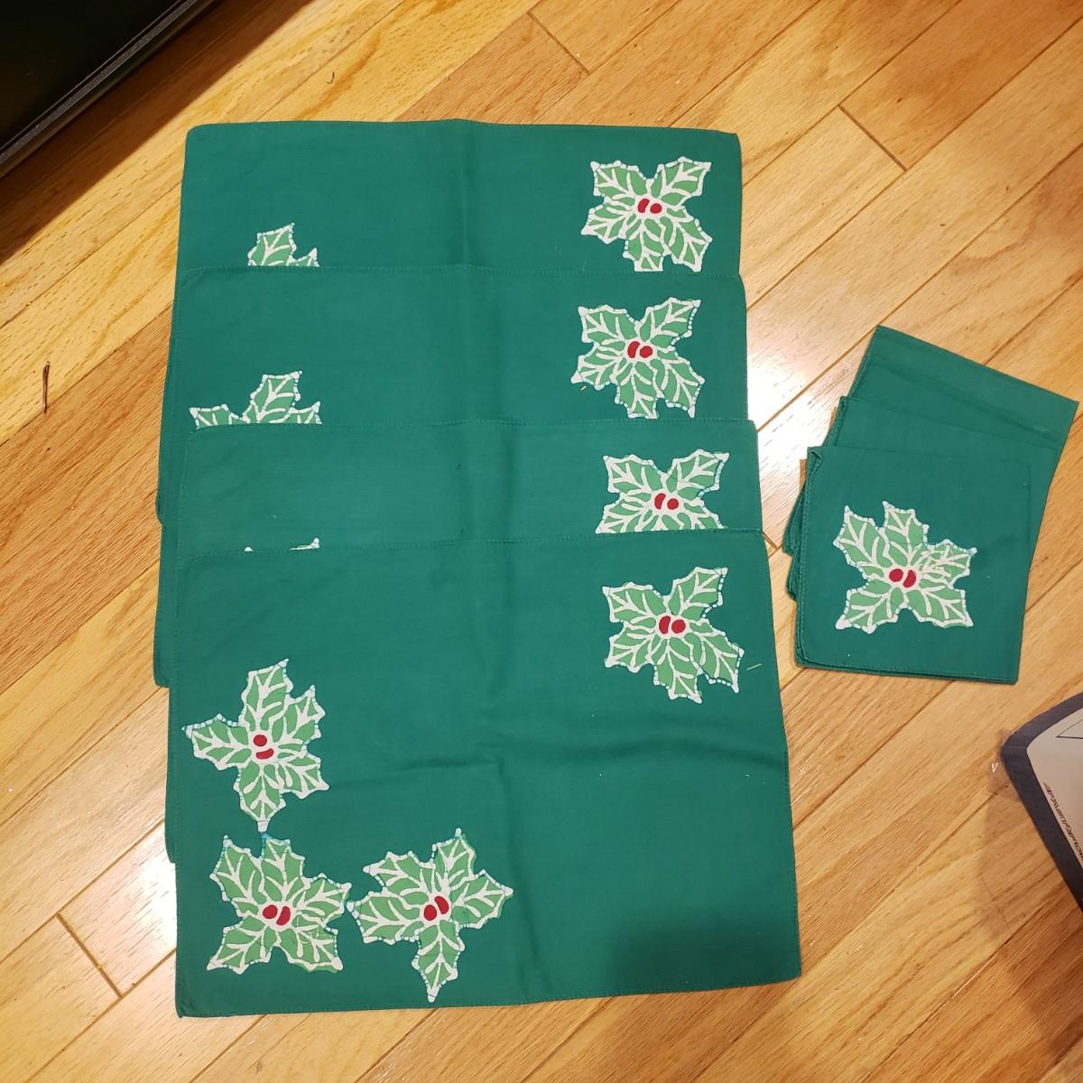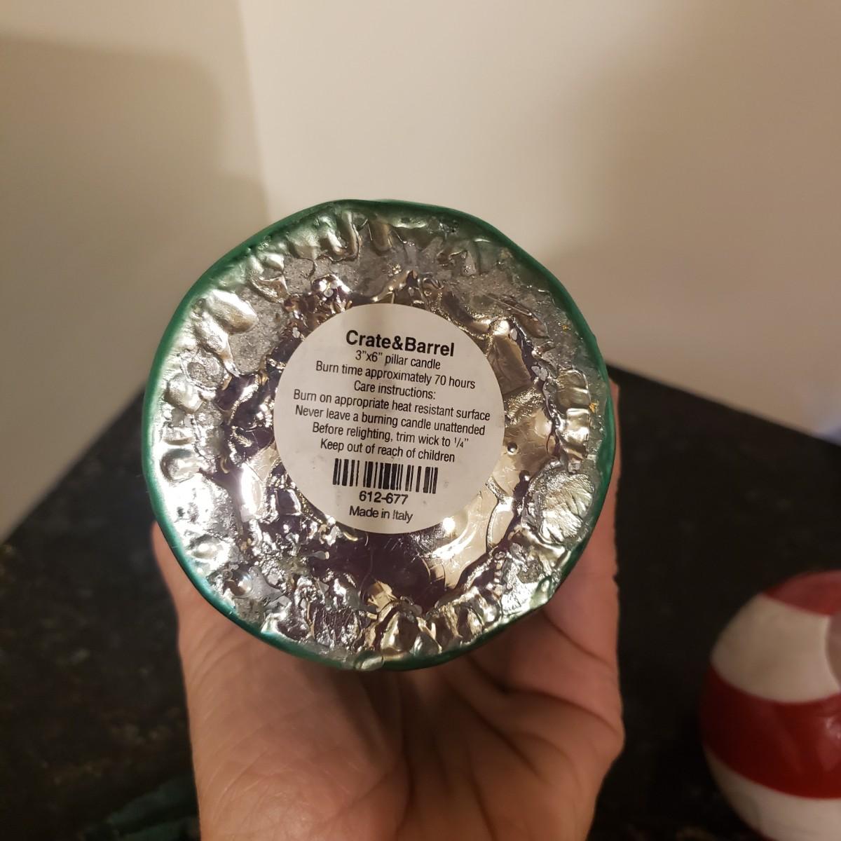 This Christmas lot features a Spode Christmas plate (6"), two Santa stockings, four small knives that are heavy, and a four piece linen, white placemat/napkin/table runner set. The Basic Spirt sets are pewter and hand crafted in Nova Scotia. They come in a blue velet bag. The only piece that had a marking was the tree, see picture. The Fitz and Floyd plate measures 10". There are eight red/gold cloth napkins. The green/red/gold rectangular table cloth measures 112" x 84". There are multiple Crate and Barrel candles. If the bottoms were not pictured, they did not have any markings. There are three NIB tapered 12" beeswax candles. See pictures for more details.