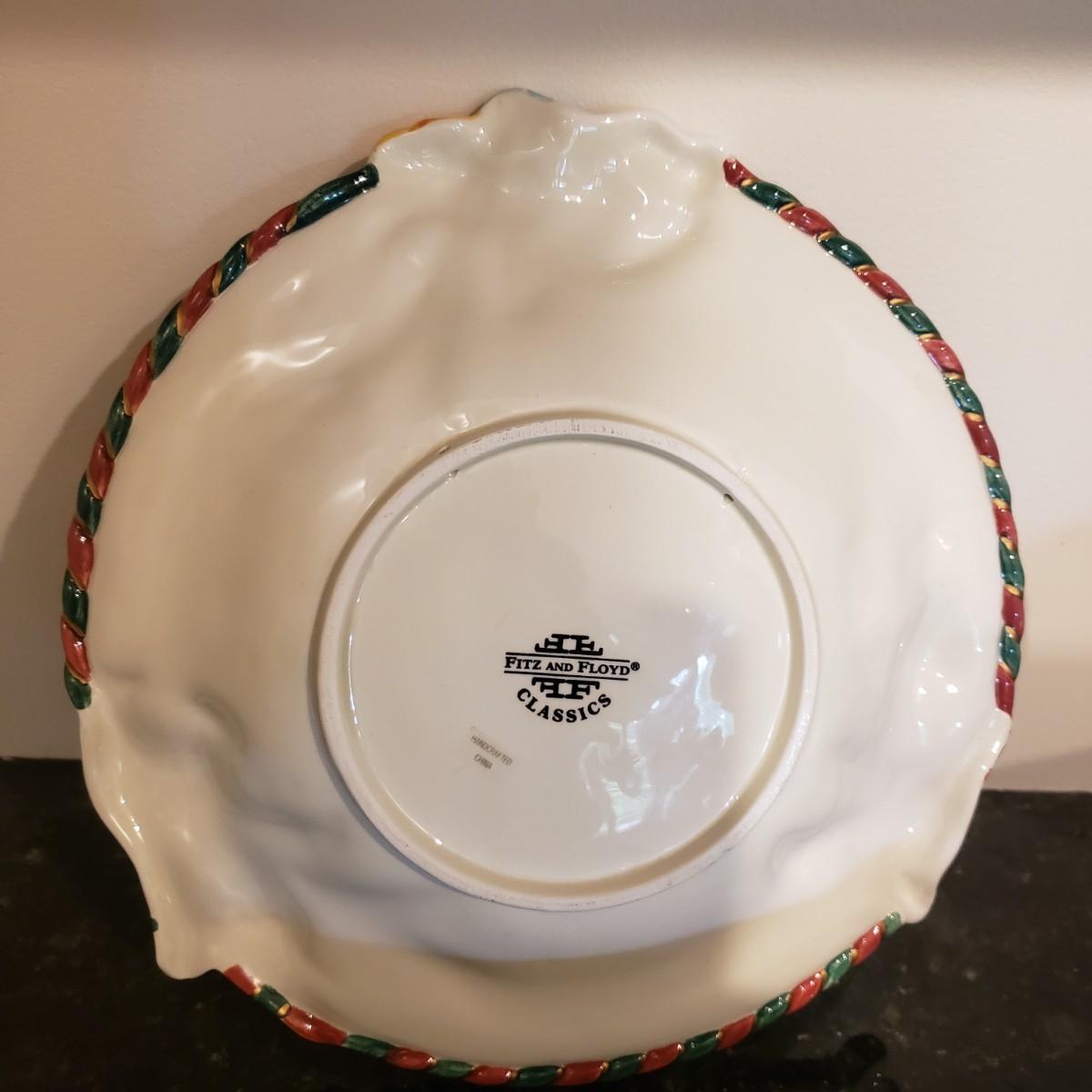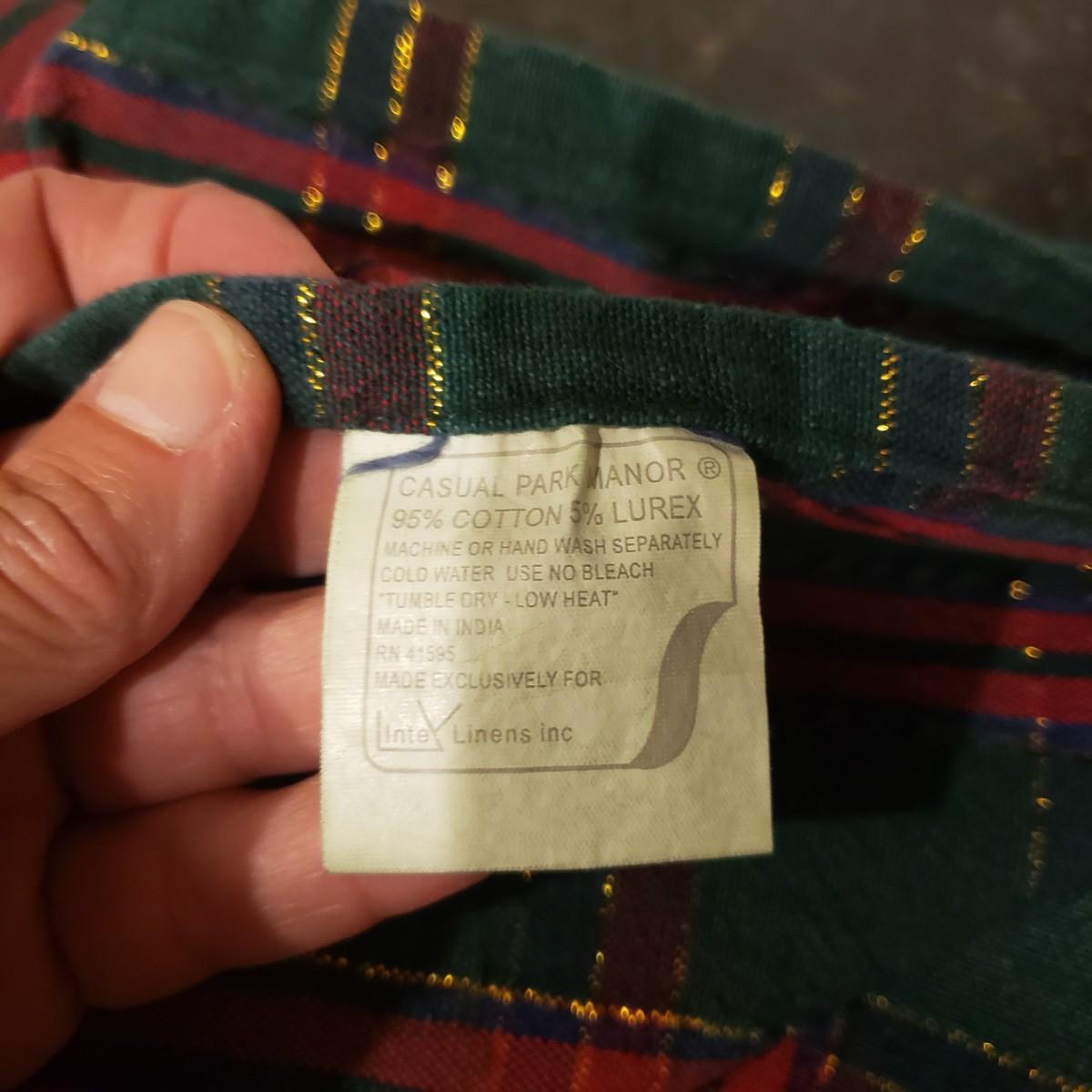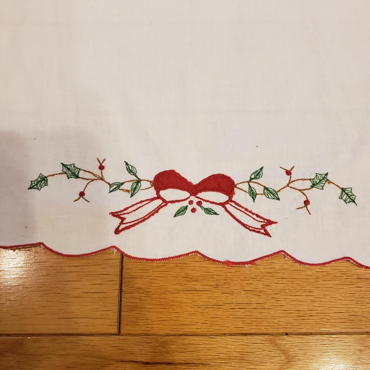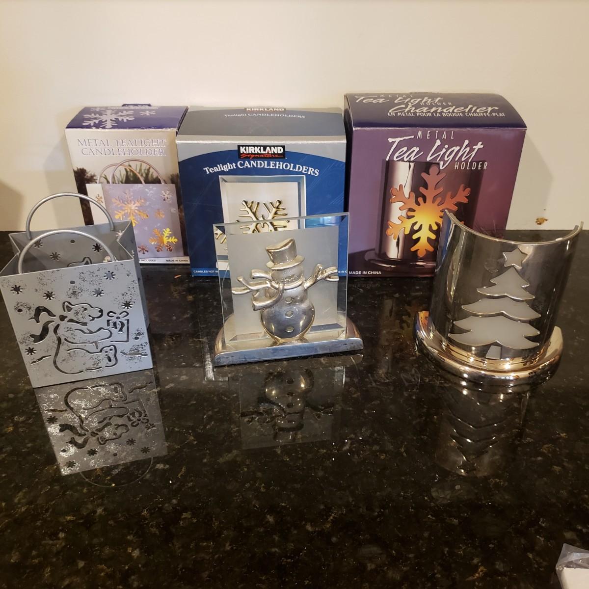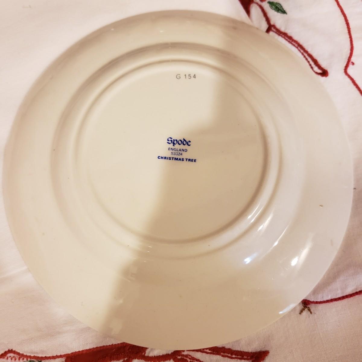 This Christmas lot features a Spode Christmas plate (6"), two Santa stockings, four small knives that are heavy, and a four piece linen, white placemat/napkin/table runner set. The Basic Spirt sets are pewter and hand crafted in Nova Scotia. They come in a blue velet bag. The only piece that had a marking was the tree, see picture. The Fitz and Floyd plate measures 10". There are eight red/gold cloth napkins. The green/red/gold rectangular table cloth measures 112" x 84". There are multiple Crate and Barrel candles. If the bottoms were not pictured, they did not have any markings. There are three NIB tapered 12" beeswax candles. See pictures for more details.