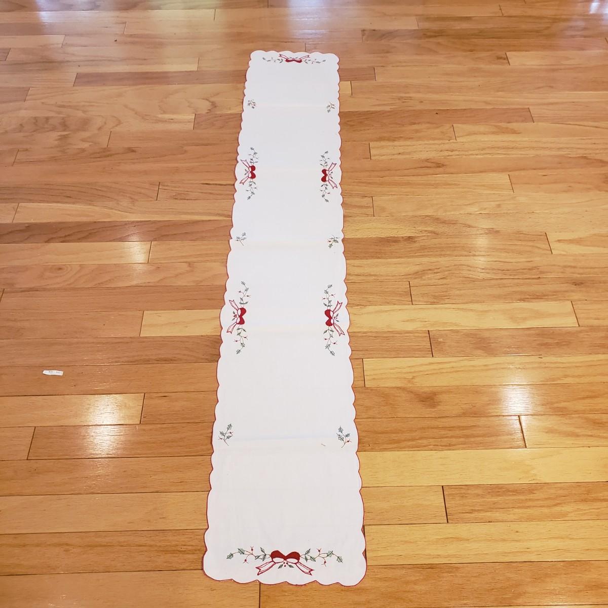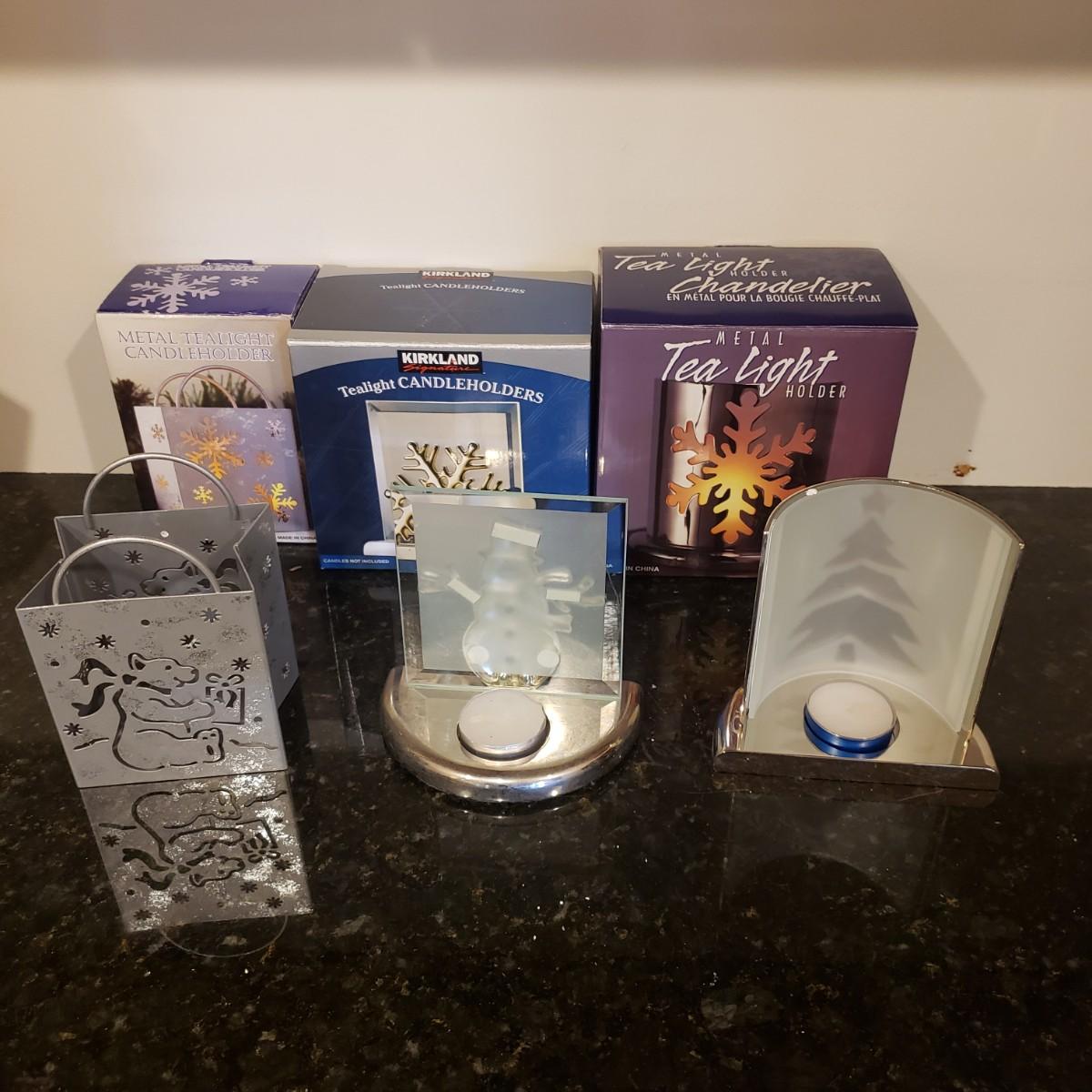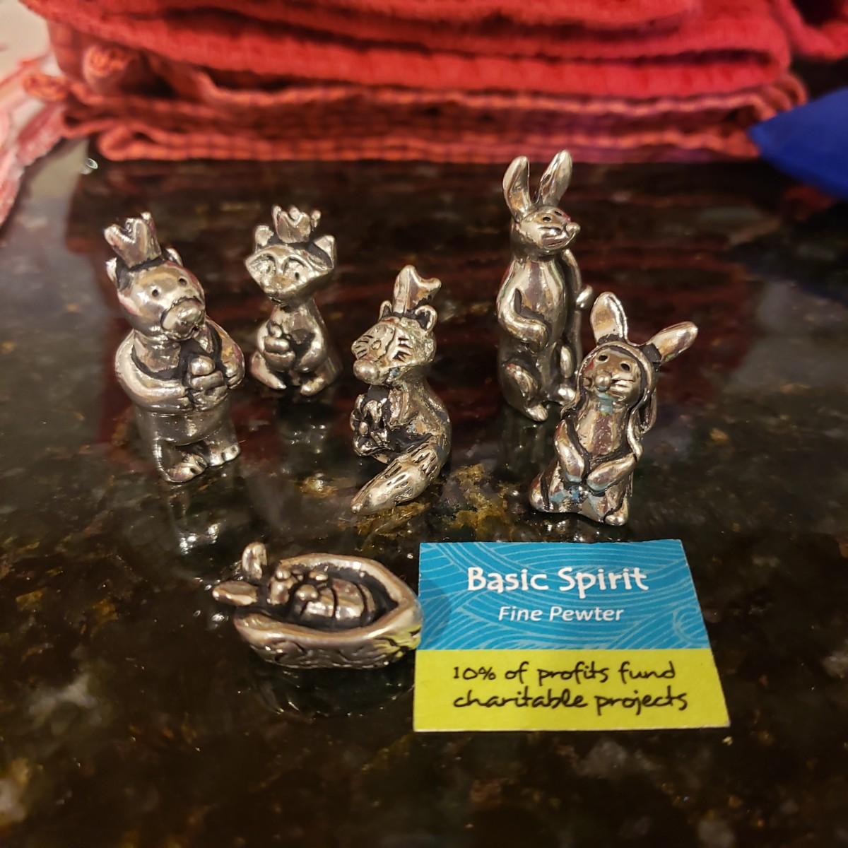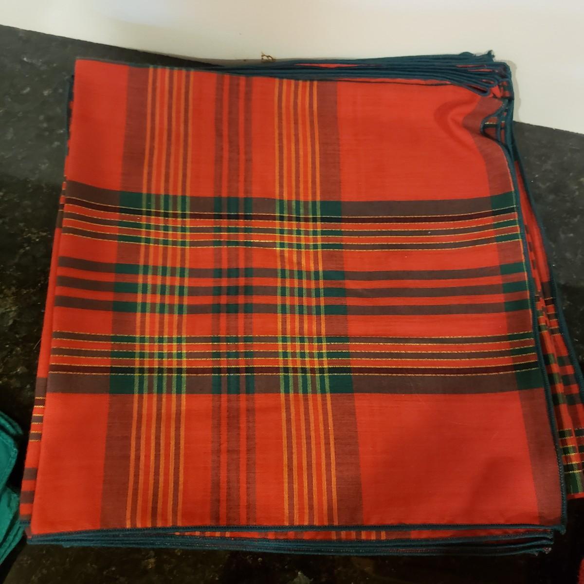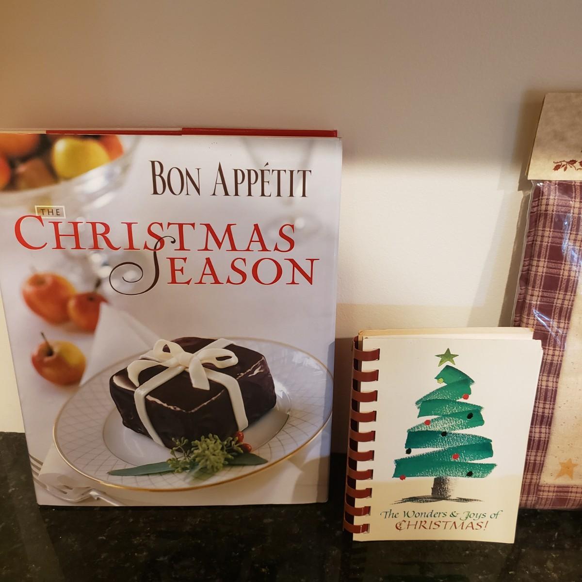 This Christmas lot features a Spode Christmas plate (6"), two Santa stockings, four small knives that are heavy, and a four piece linen, white placemat/napkin/table runner set. The Basic Spirt sets are pewter and hand crafted in Nova Scotia. They come in a blue velet bag. The only piece that had a marking was the tree, see picture. The Fitz and Floyd plate measures 10". There are eight red/gold cloth napkins. The green/red/gold rectangular table cloth measures 112" x 84". There are multiple Crate and Barrel candles. If the bottoms were not pictured, they did not have any markings. There are three NIB tapered 12" beeswax candles. See pictures for more details.