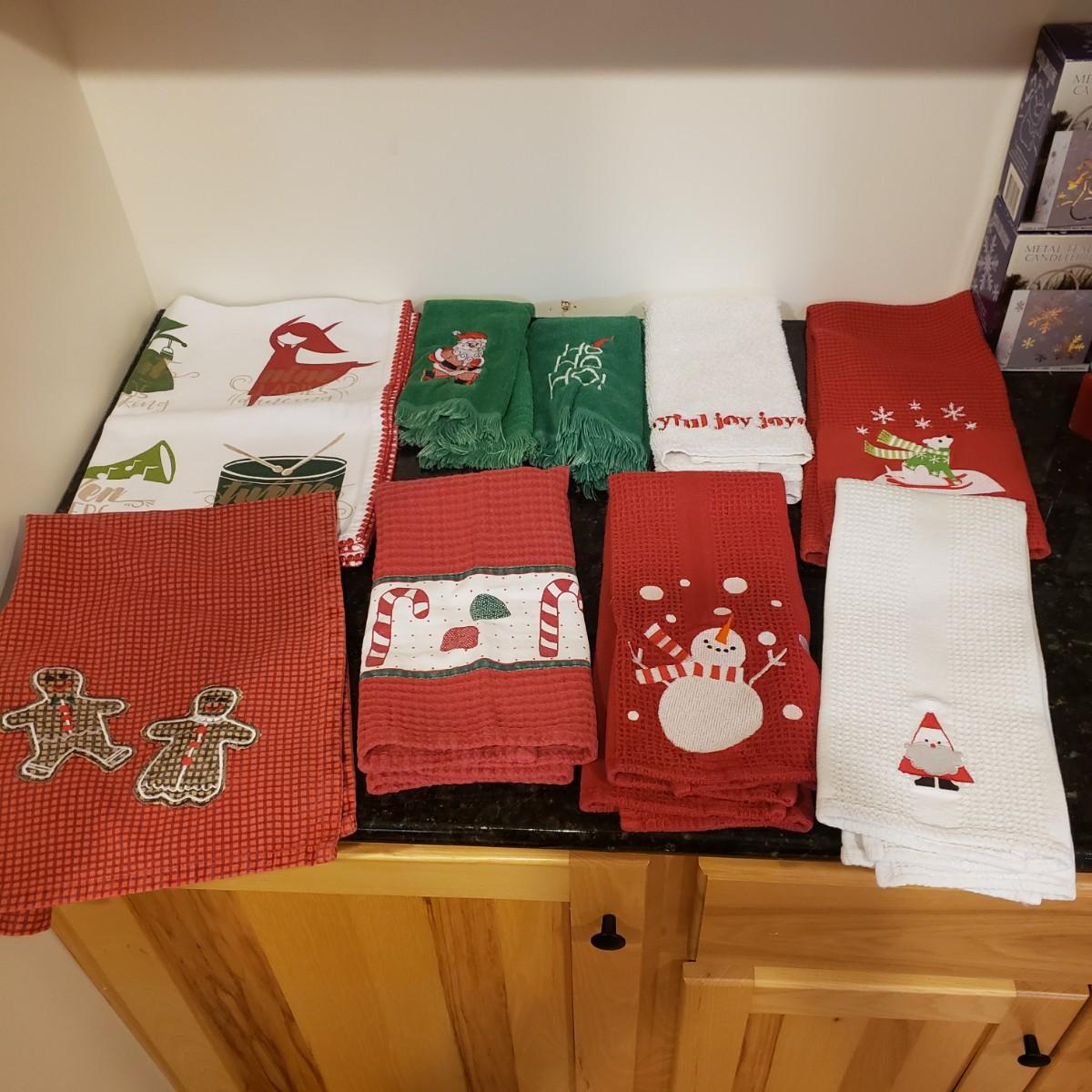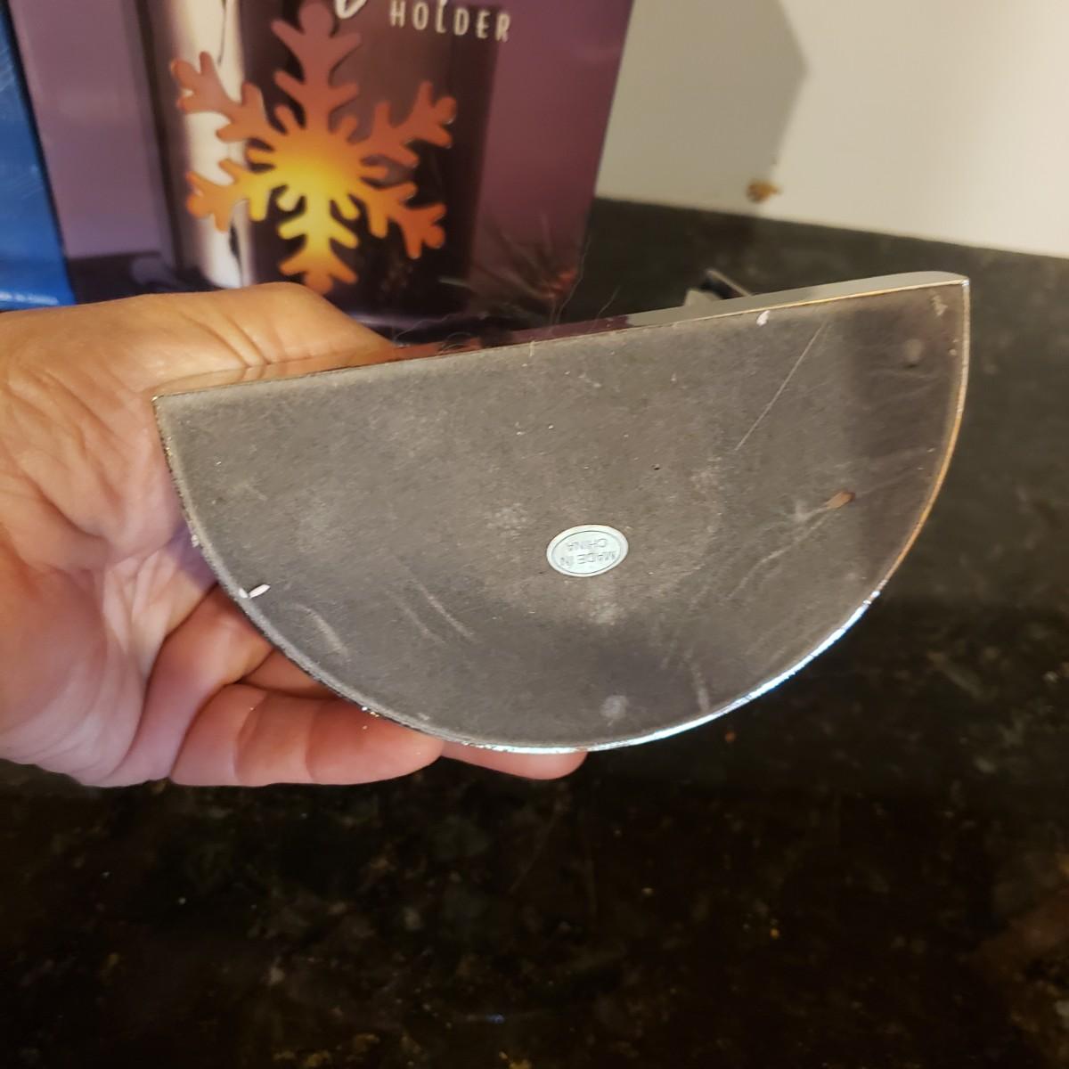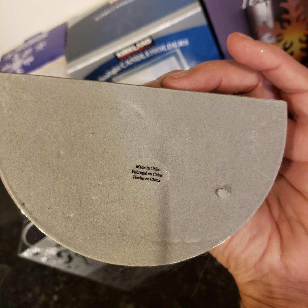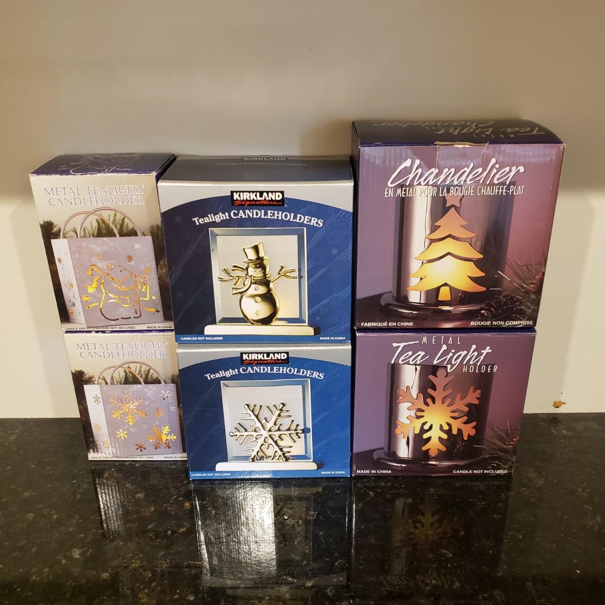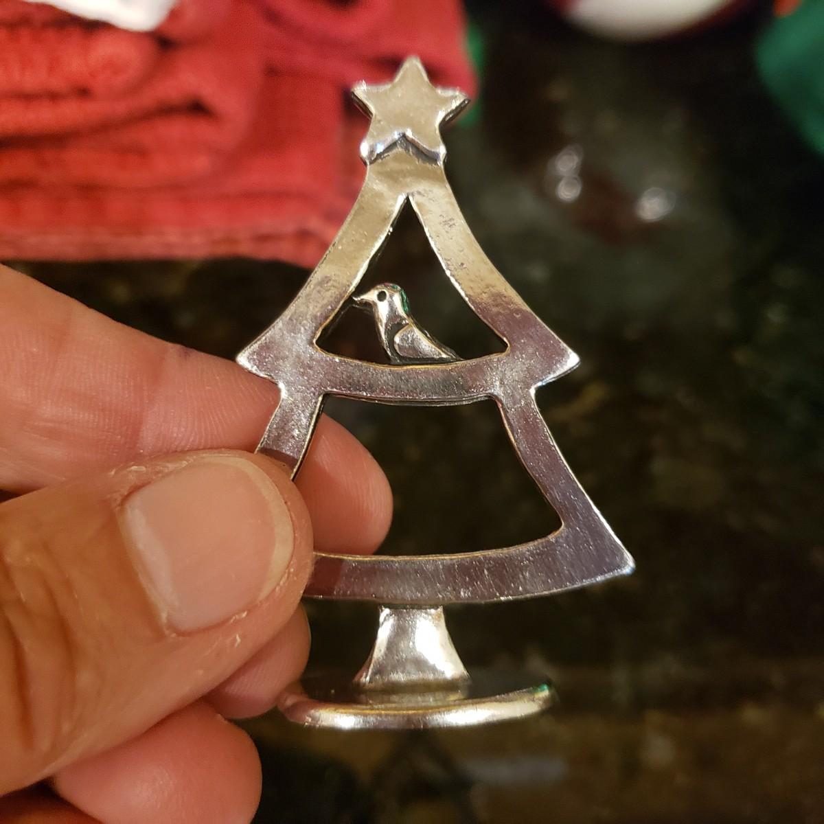 This Christmas lot features a Spode Christmas plate (6"), two Santa stockings, four small knives that are heavy, and a four piece linen, white placemat/napkin/table runner set. The Basic Spirt sets are pewter and hand crafted in Nova Scotia. They come in a blue velet bag. The only piece that had a marking was the tree, see picture. The Fitz and Floyd plate measures 10". There are eight red/gold cloth napkins. The green/red/gold rectangular table cloth measures 112" x 84". There are multiple Crate and Barrel candles. If the bottoms were not pictured, they did not have any markings. There are three NIB tapered 12" beeswax candles. See pictures for more details.