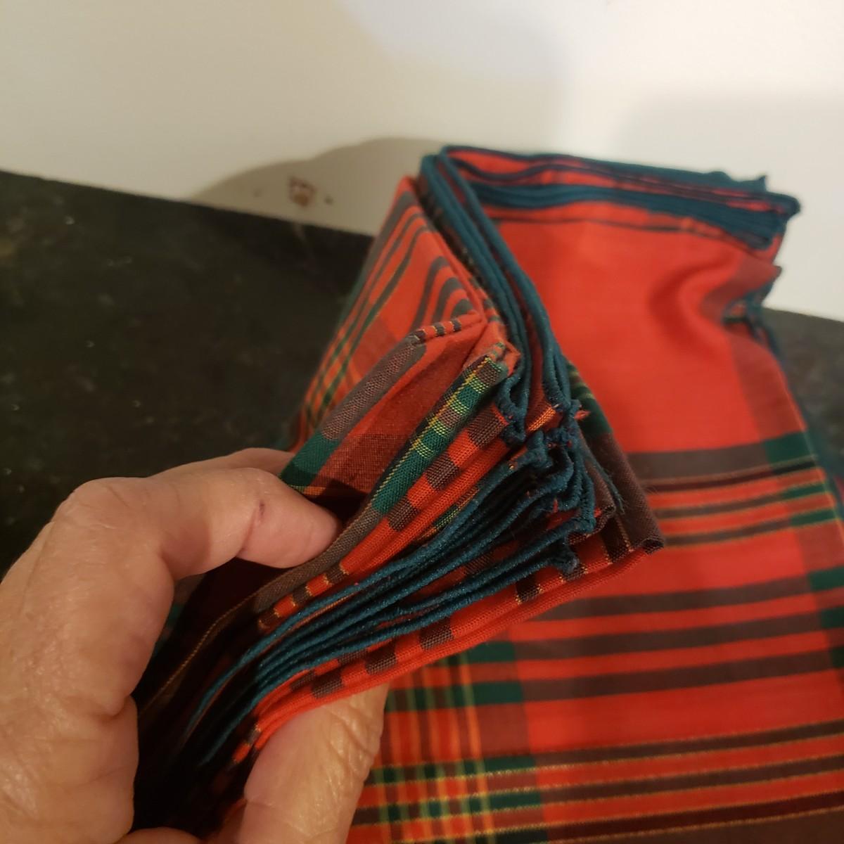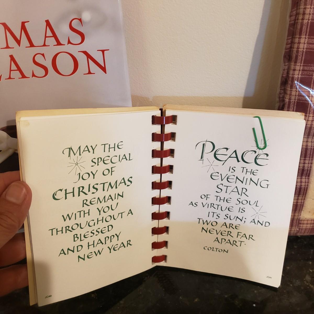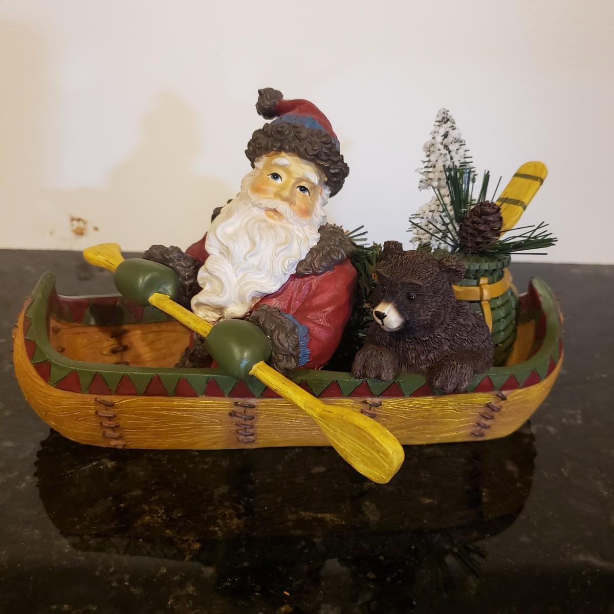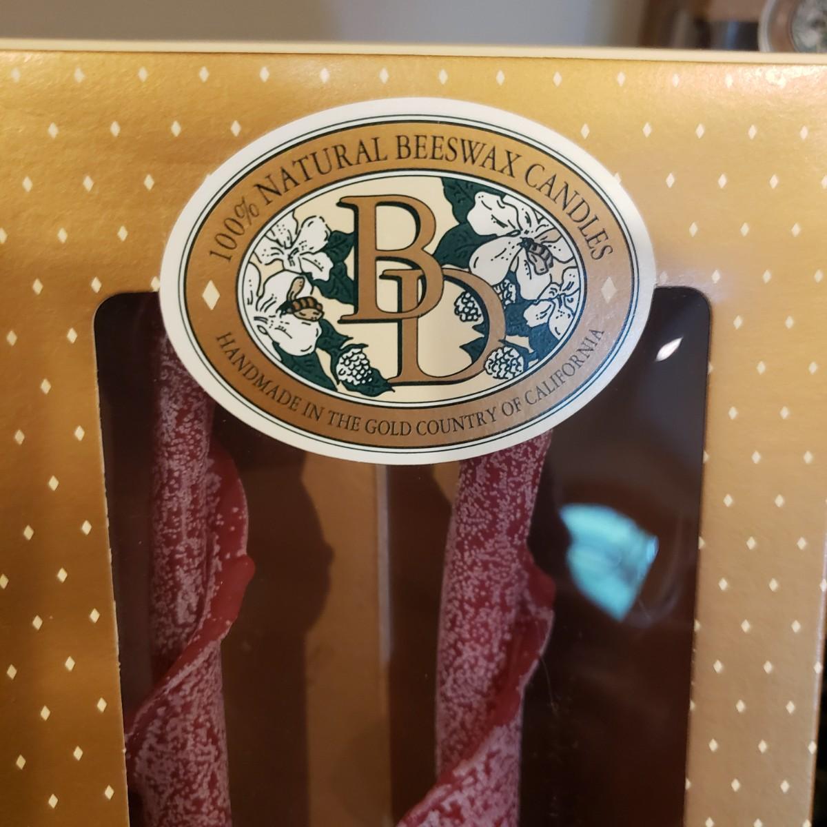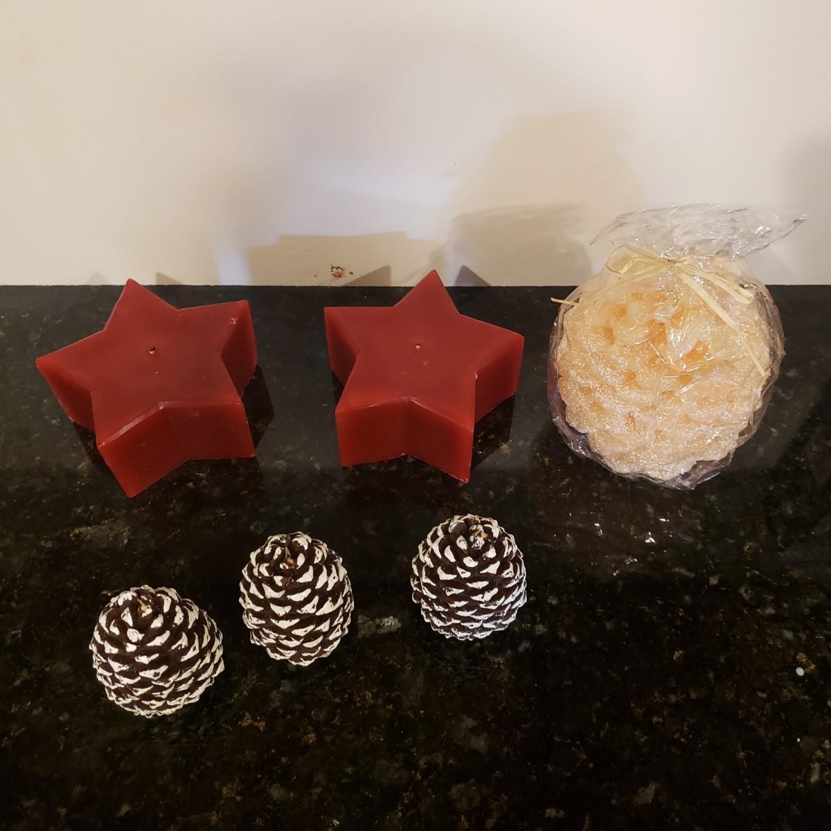 This Christmas lot features a Spode Christmas plate (6"), two Santa stockings, four small knives that are heavy, and a four piece linen, white placemat/napkin/table runner set. The Basic Spirt sets are pewter and hand crafted in Nova Scotia. They come in a blue velet bag. The only piece that had a marking was the tree, see picture. The Fitz and Floyd plate measures 10". There are eight red/gold cloth napkins. The green/red/gold rectangular table cloth measures 112" x 84". There are multiple Crate and Barrel candles. If the bottoms were not pictured, they did not have any markings. There are three NIB tapered 12" beeswax candles. See pictures for more details.