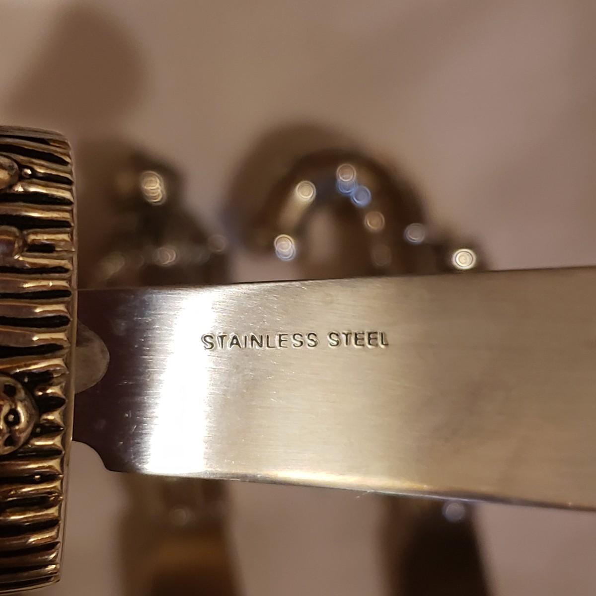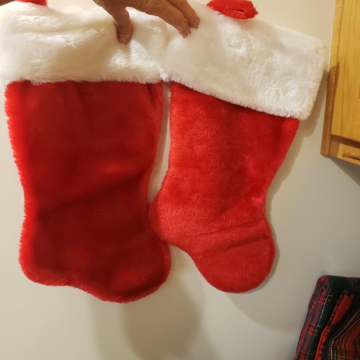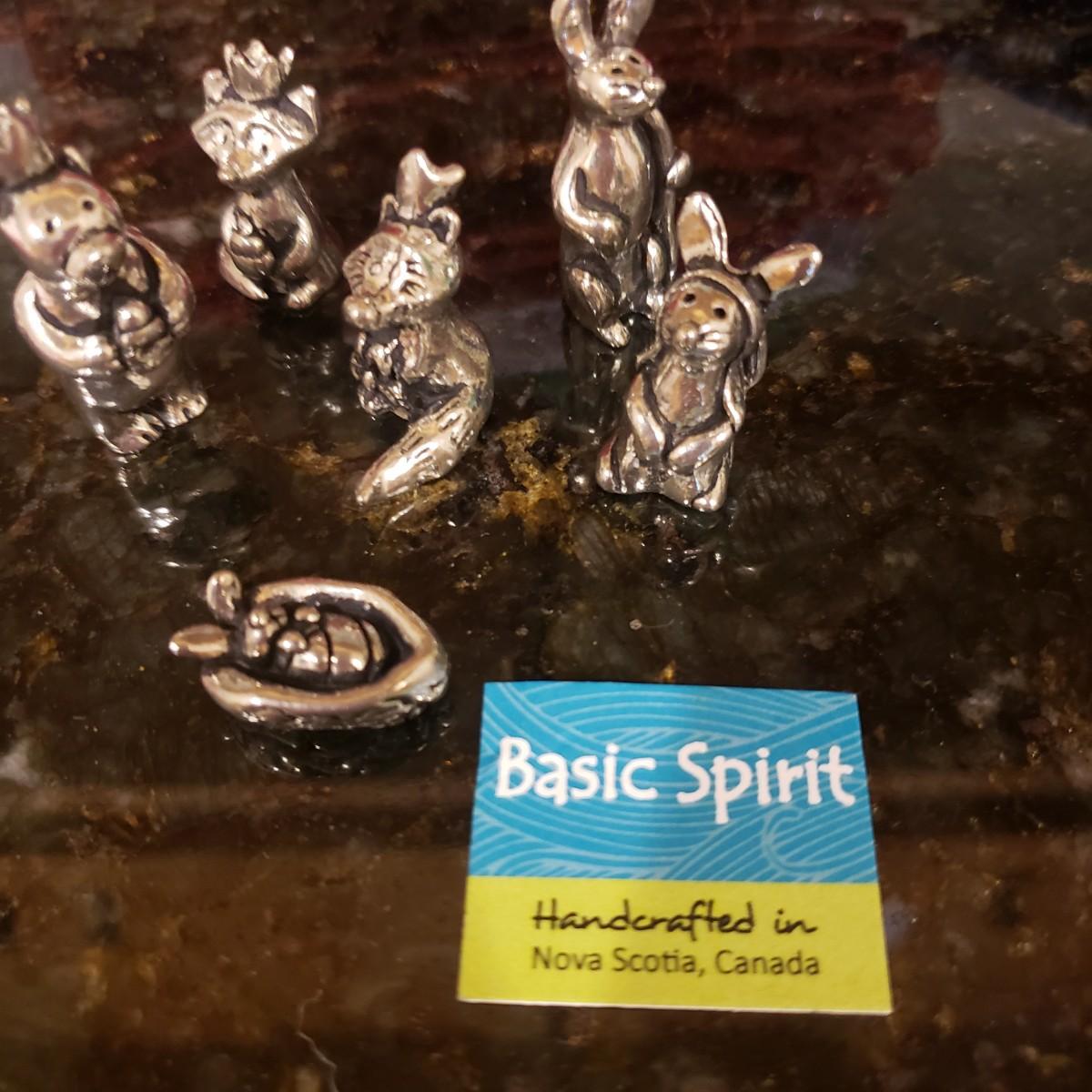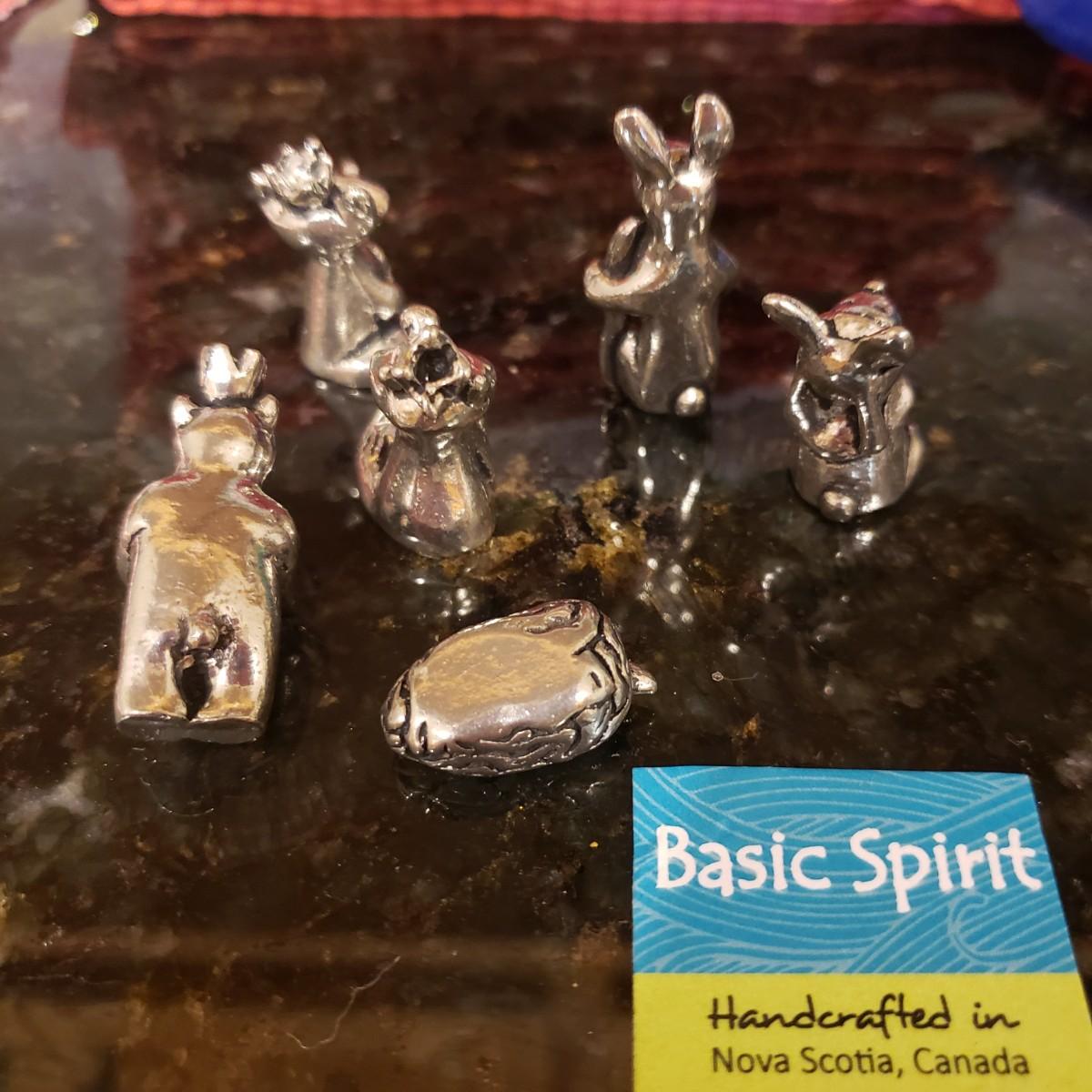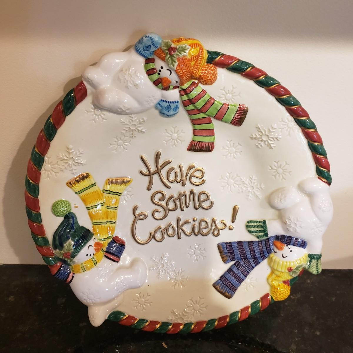 This Christmas lot features a Spode Christmas plate (6"), two Santa stockings, four small knives that are heavy, and a four piece linen, white placemat/napkin/table runner set. The Basic Spirt sets are pewter and hand crafted in Nova Scotia. They come in a blue velet bag. The only piece that had a marking was the tree, see picture. The Fitz and Floyd plate measures 10". There are eight red/gold cloth napkins. The green/red/gold rectangular table cloth measures 112" x 84". There are multiple Crate and Barrel candles. If the bottoms were not pictured, they did not have any markings. There are three NIB tapered 12" beeswax candles. See pictures for more details.