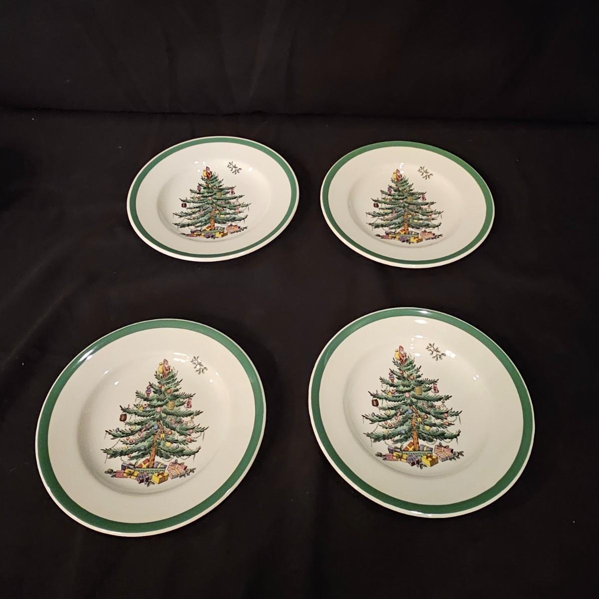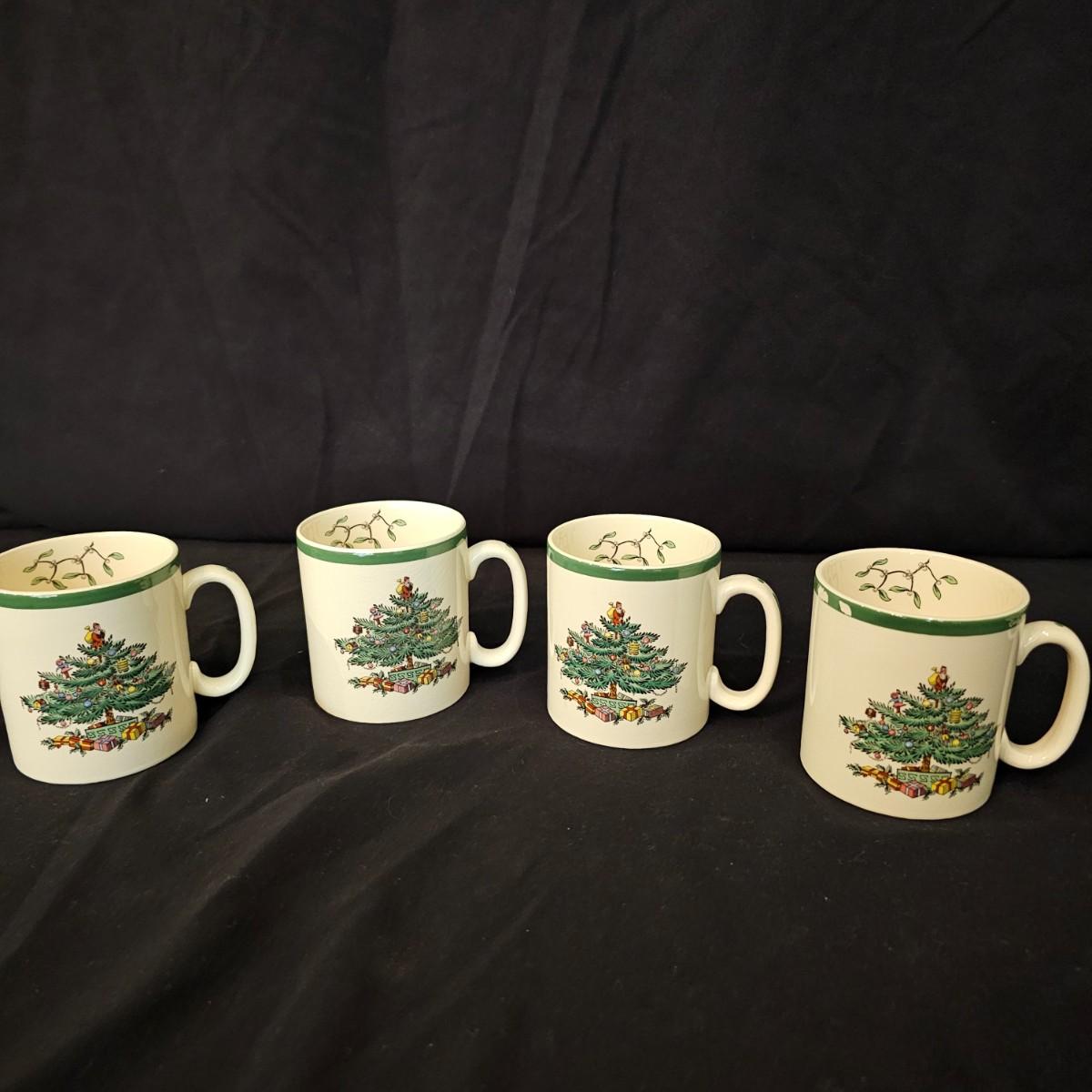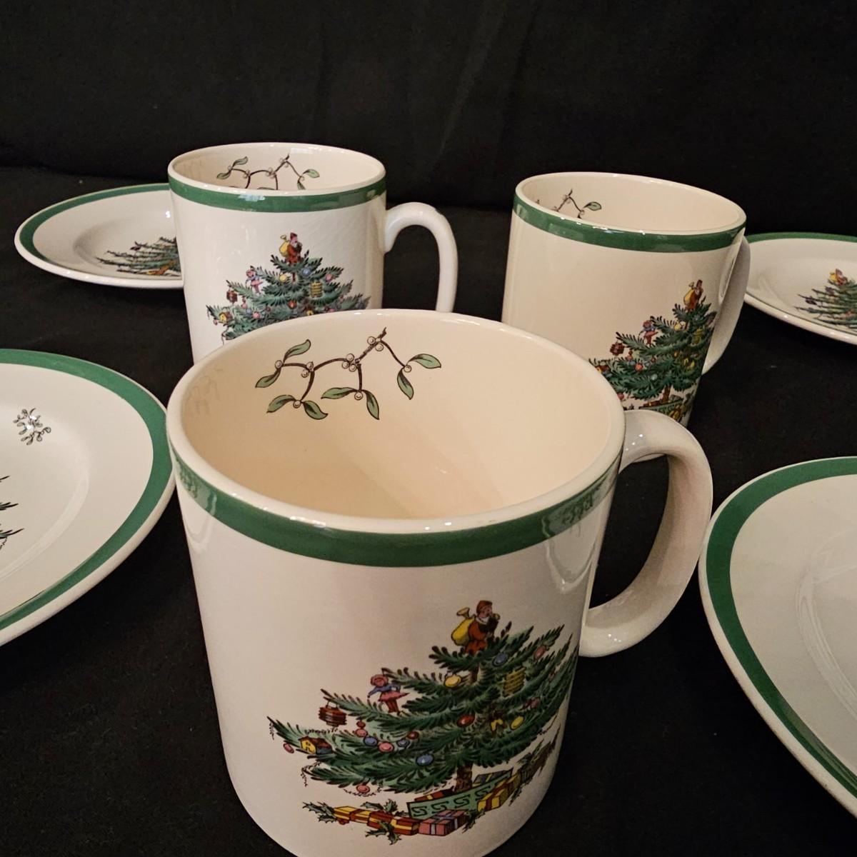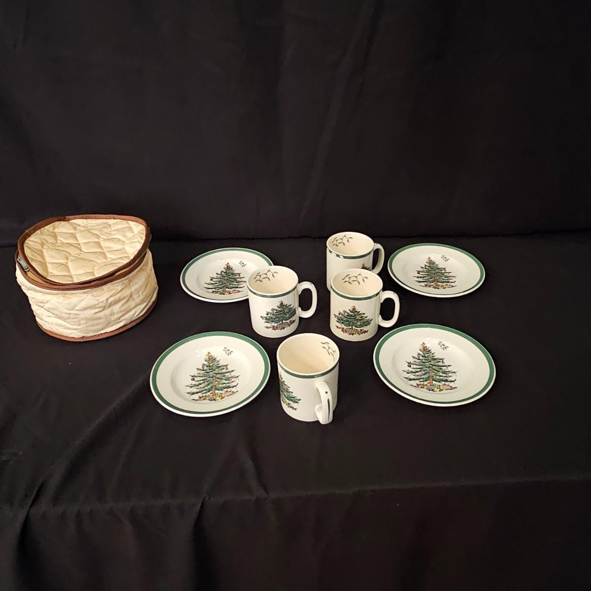 Four 6.5"D plates and four mugs in the Spode Christmas Tree pattern. Includes padded storage case for plates. Please note that one mug has minor chips in rim. See photos for details. Shipping available.