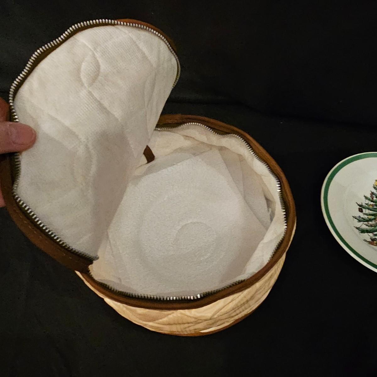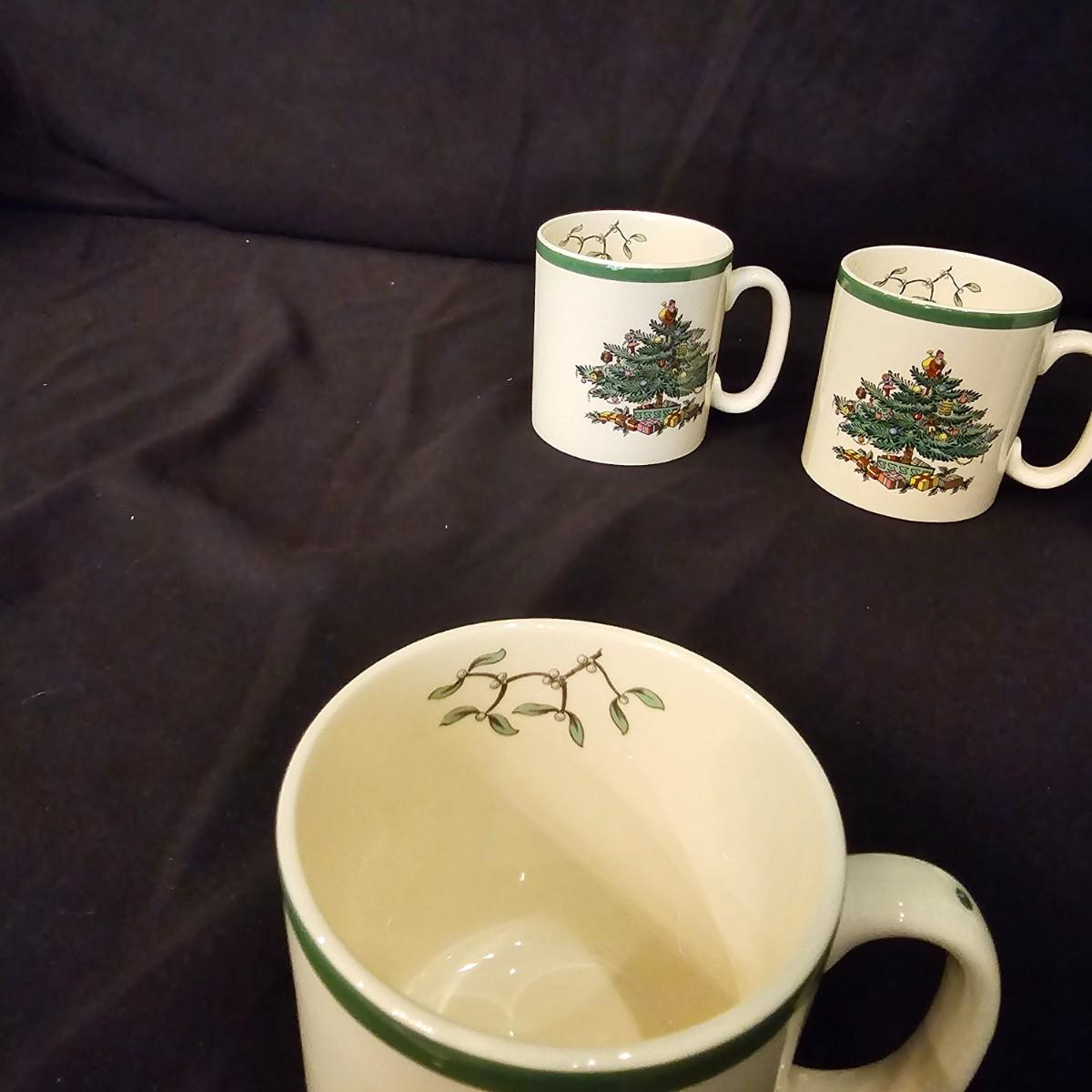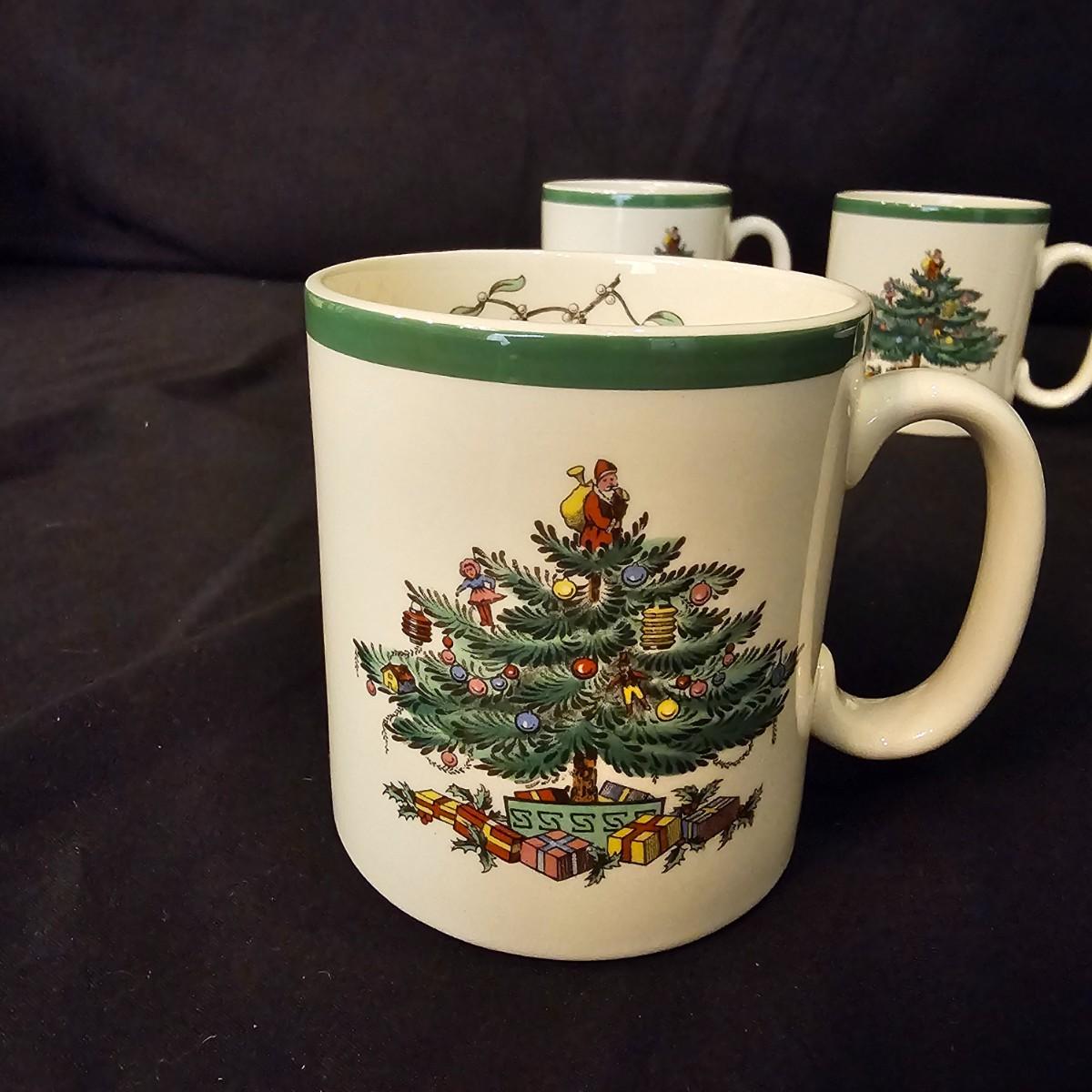 Four 6.5"D plates and four mugs in the Spode Christmas Tree pattern. Includes padded storage case for plates. Please note that one mug has minor chips in rim. See photos for details. Shipping available.