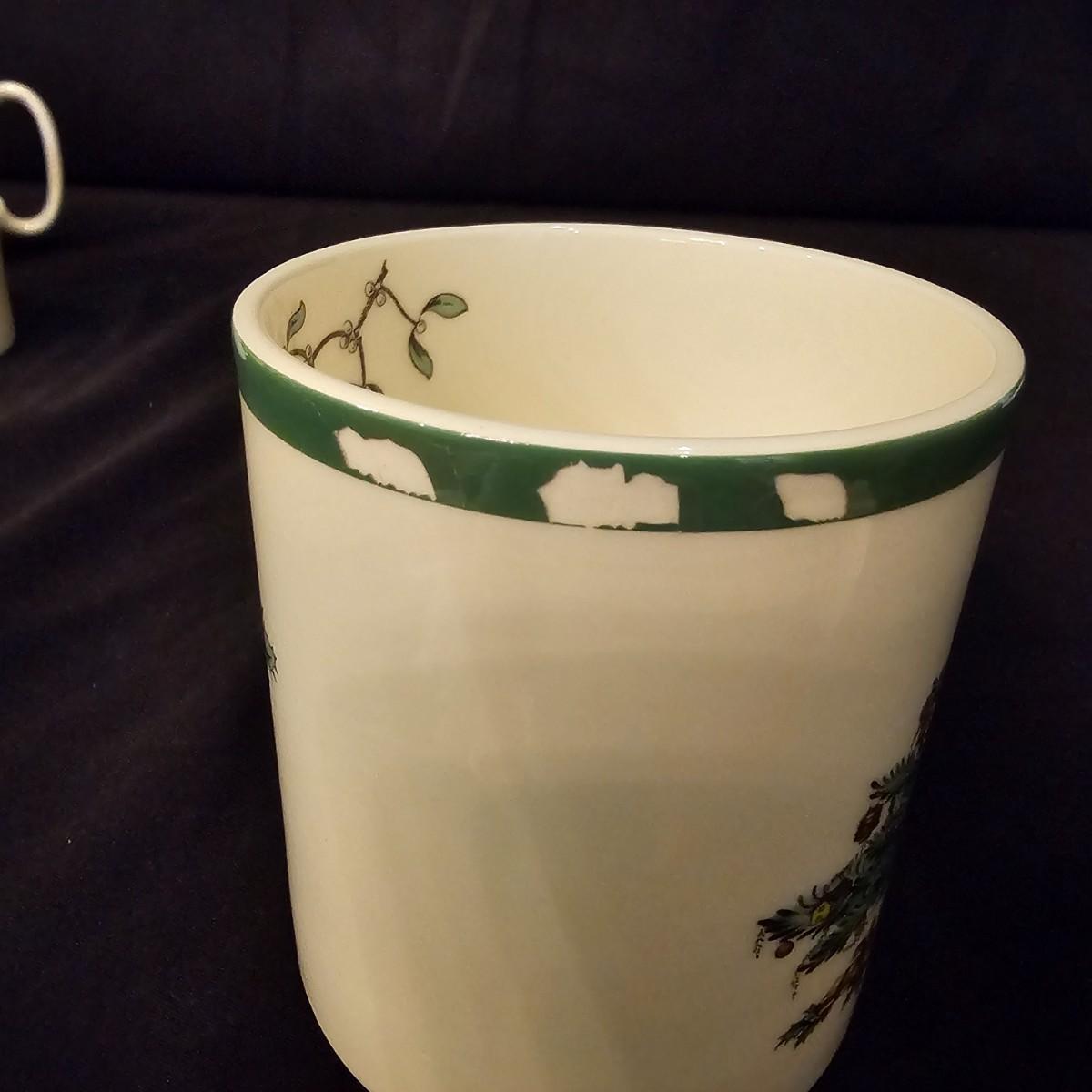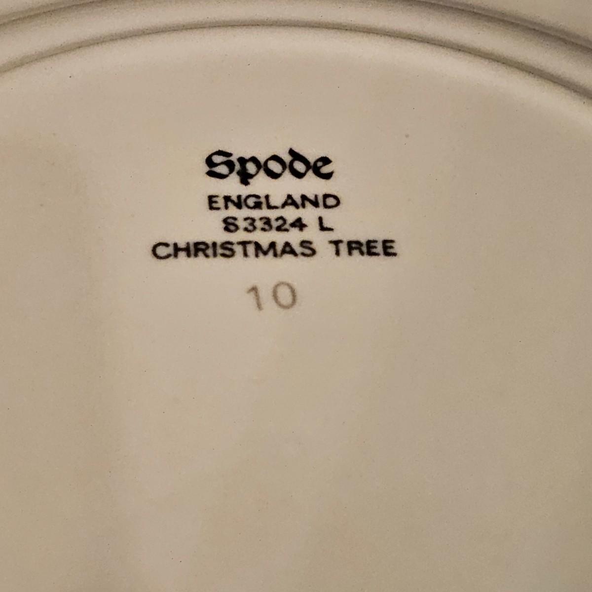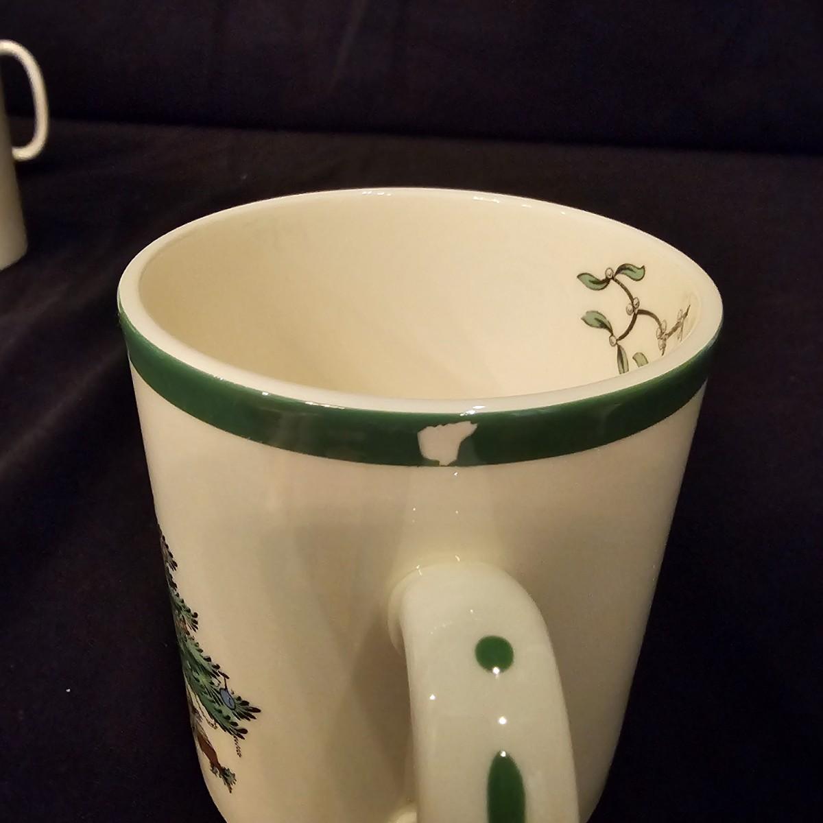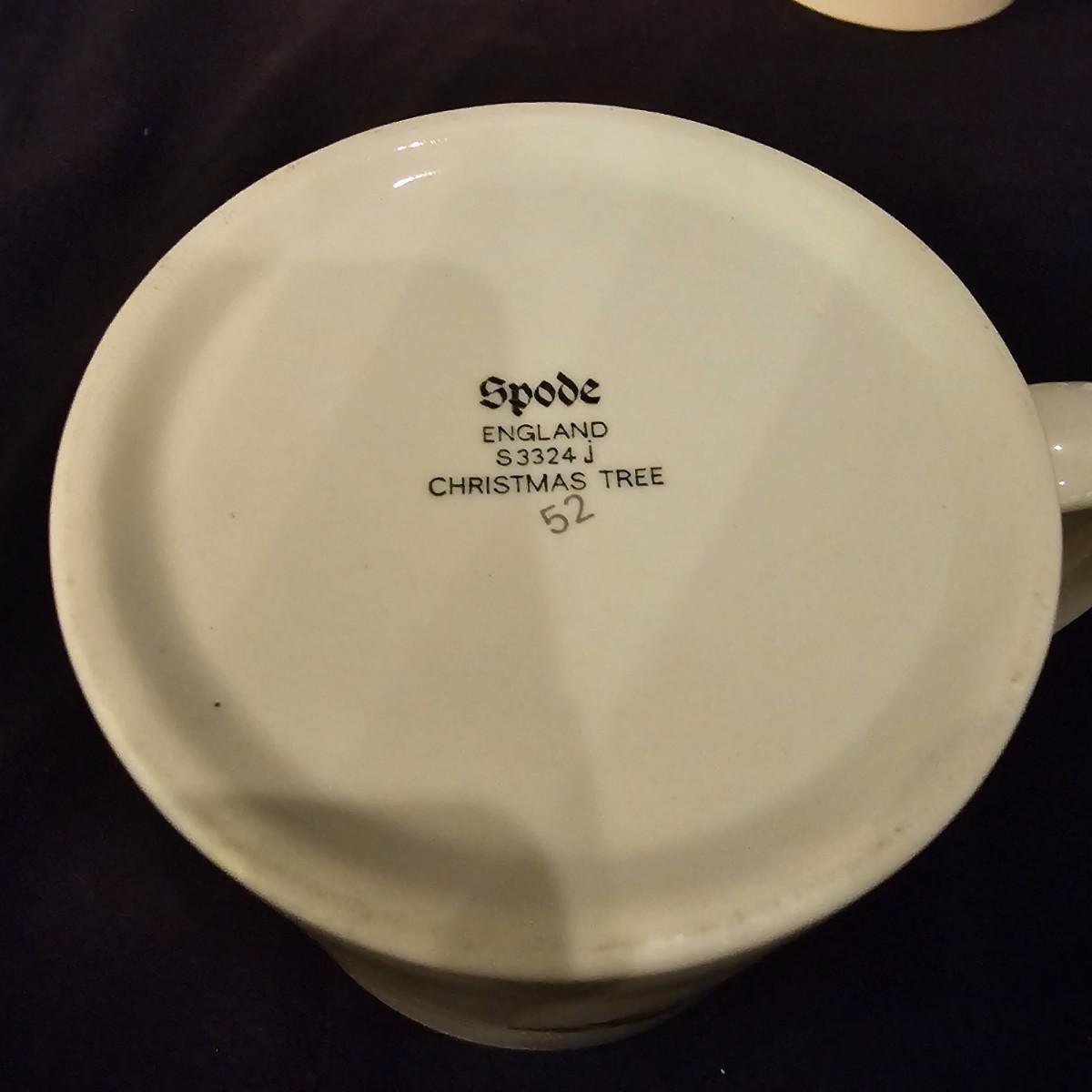 Four 6.5"D plates and four mugs in the Spode Christmas Tree pattern. Includes padded storage case for plates. Please note that one mug has minor chips in rim. See photos for details. Shipping available.