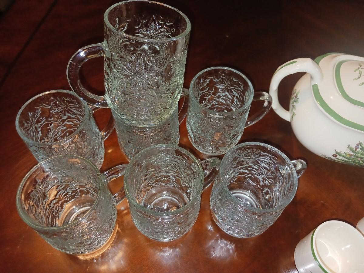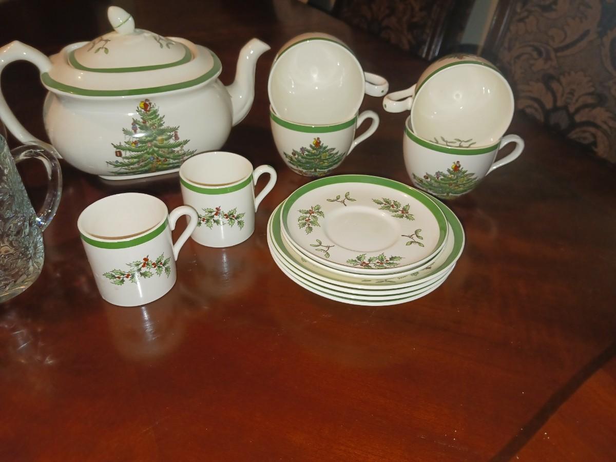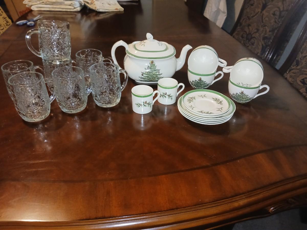 SPODE CHRISTMAS TEA SET AND GLASS MUGS