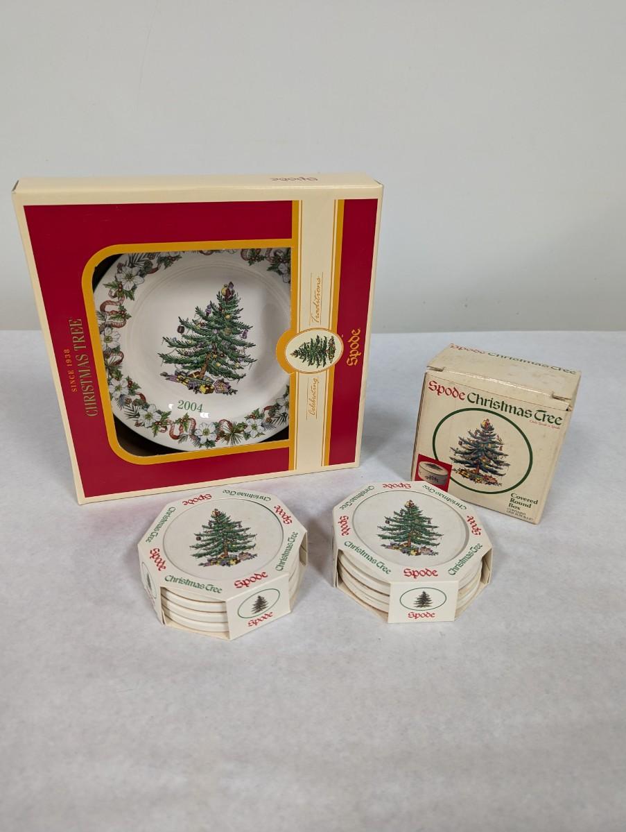 Spode Christmas Tree 2004 Plate, Coasters, & Covered Round Box