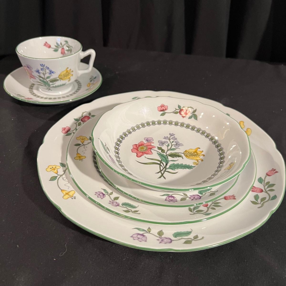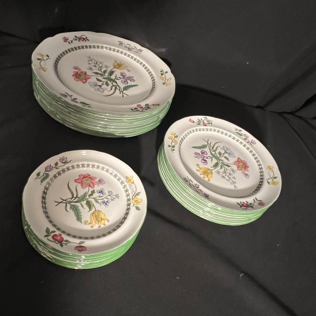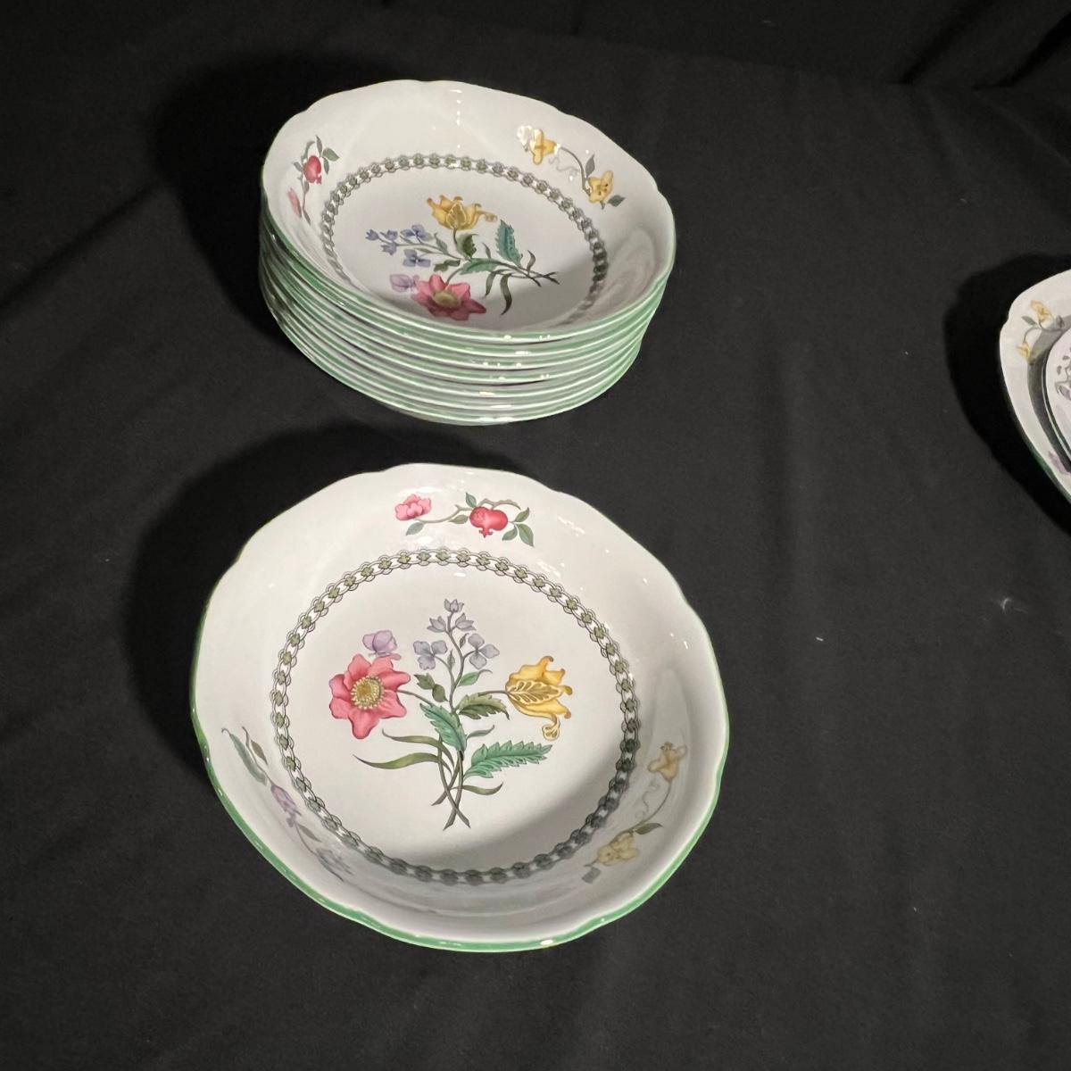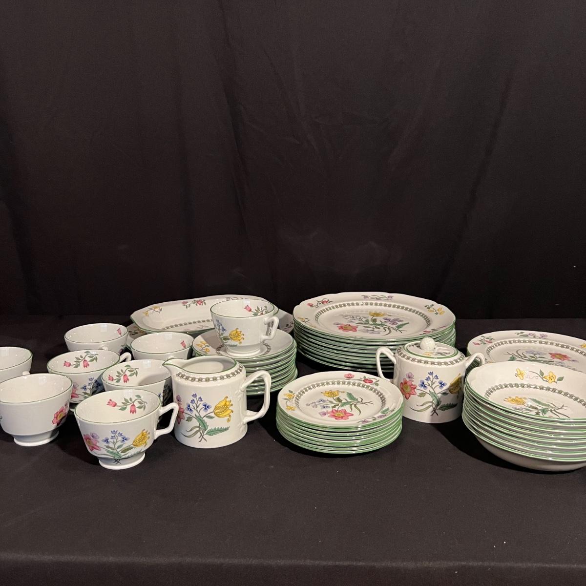 This porcelain with floral sprays Spode set has a six place setting for eight people which includes cup, saucer, dinner (10”D), bread and salad plates plus dessert bowl. Set also has a serving platter and dish and a creamer and lidded sugar bowl.
