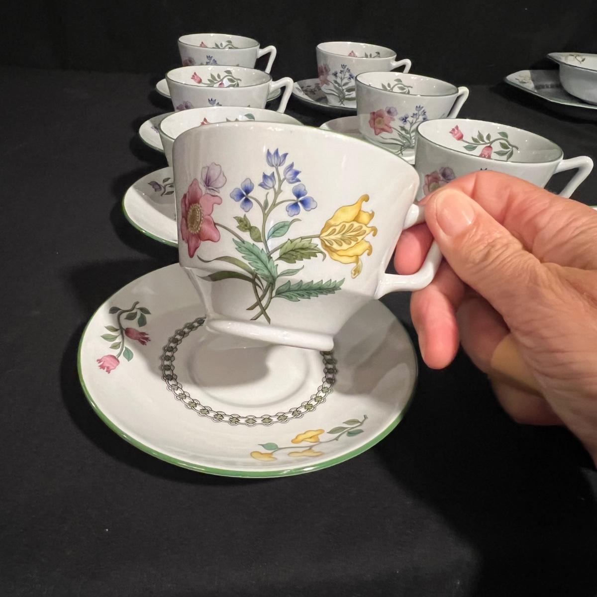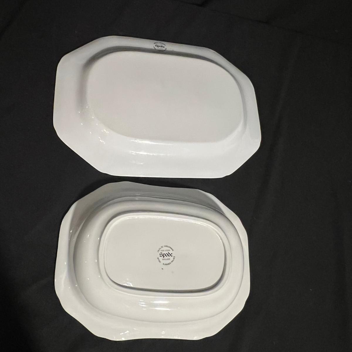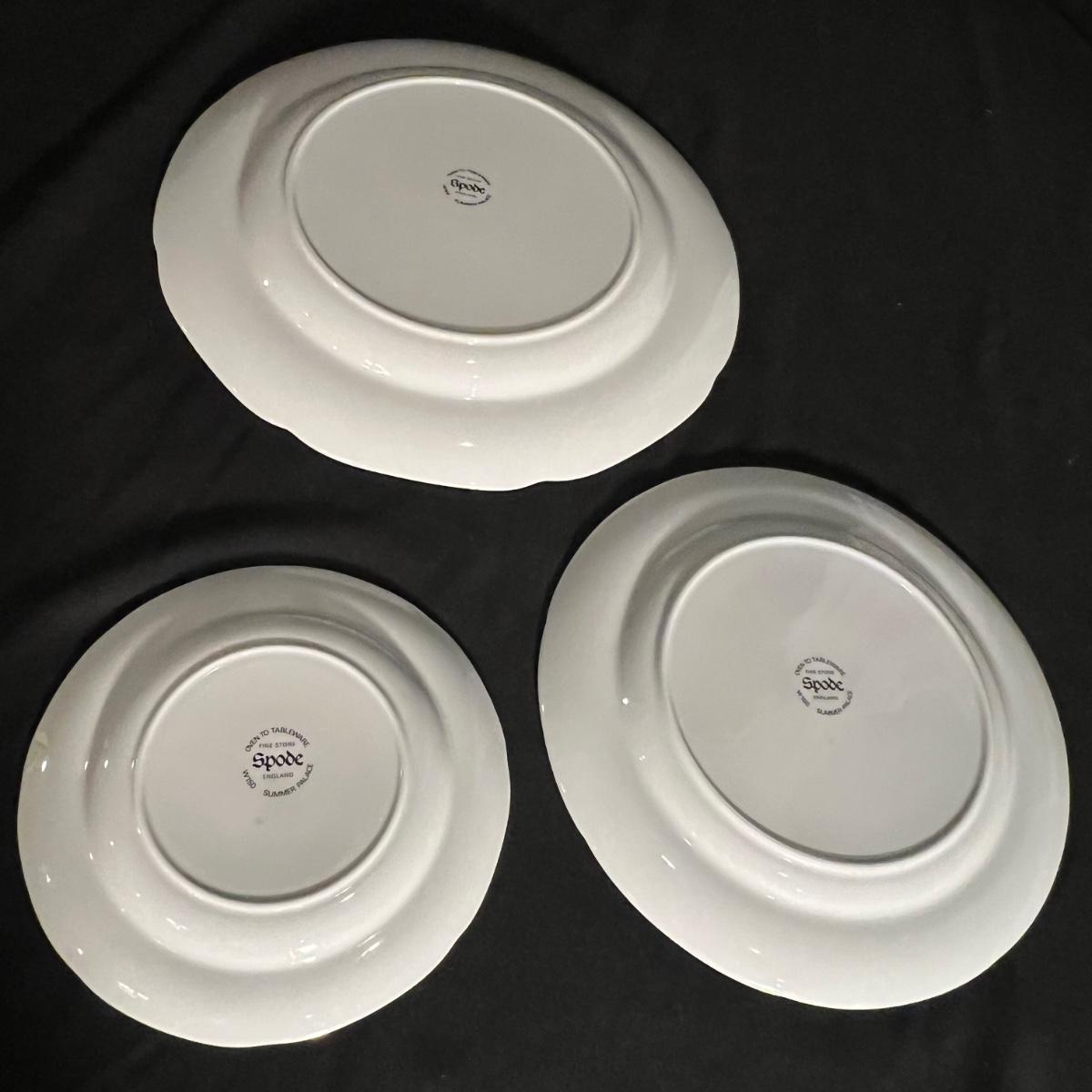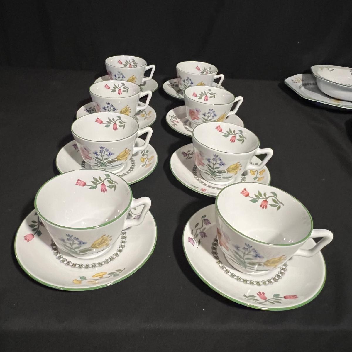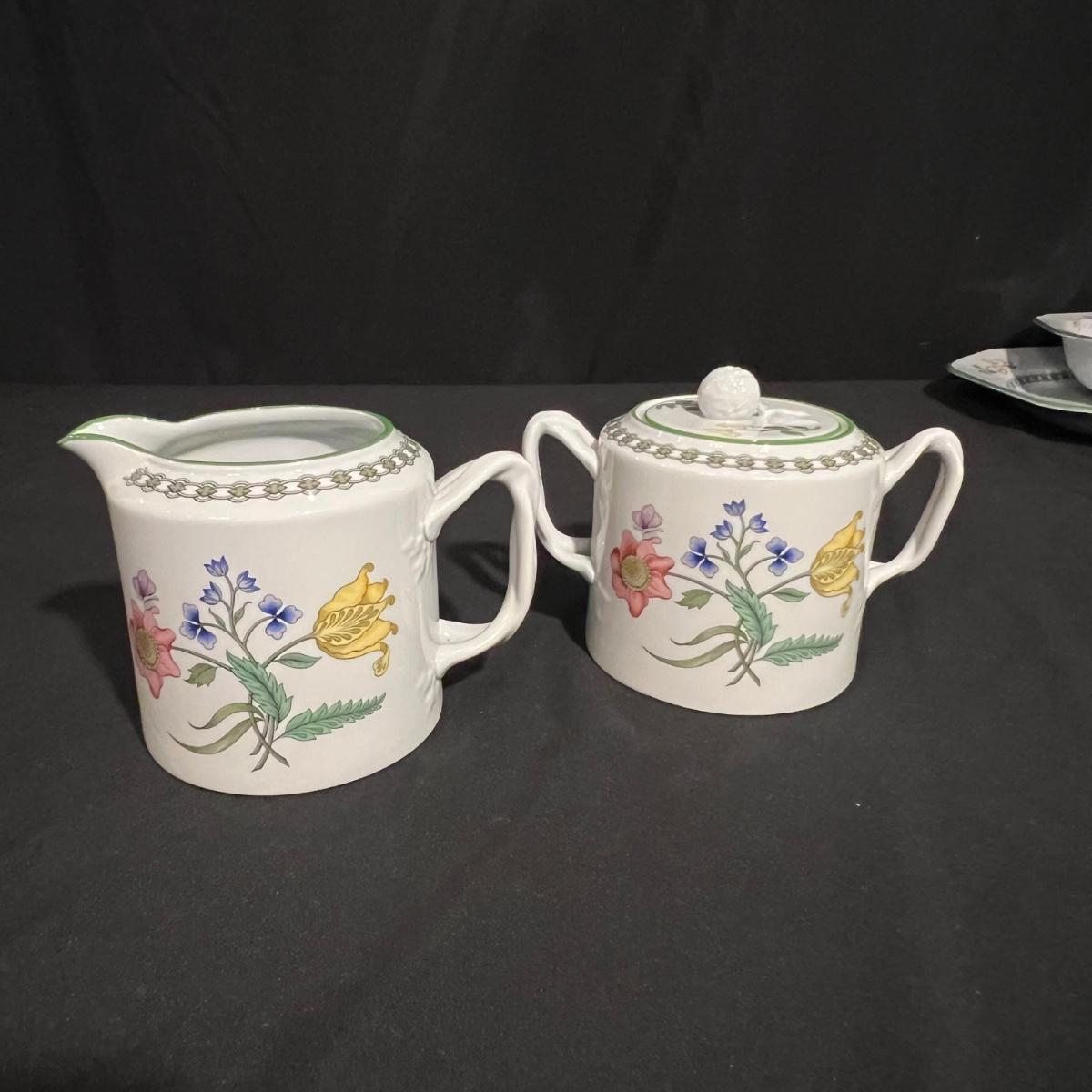 This porcelain with floral sprays Spode set has a six place setting for eight people which includes cup, saucer, dinner (10”D), bread and salad plates plus dessert bowl. Set also has a serving platter and dish and a creamer and lidded sugar bowl.