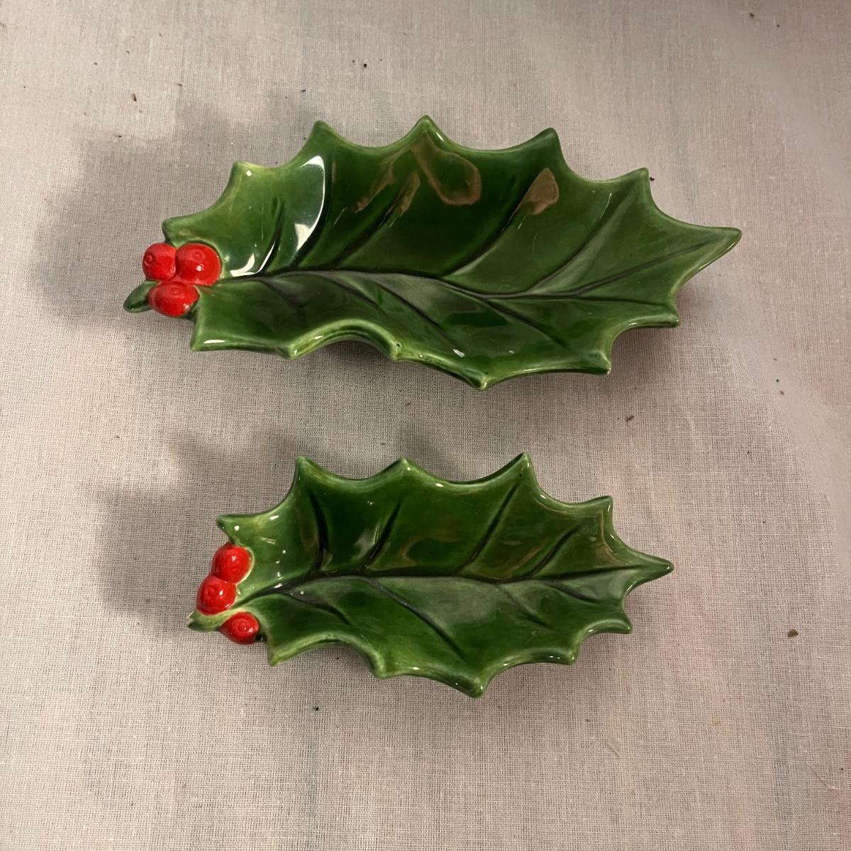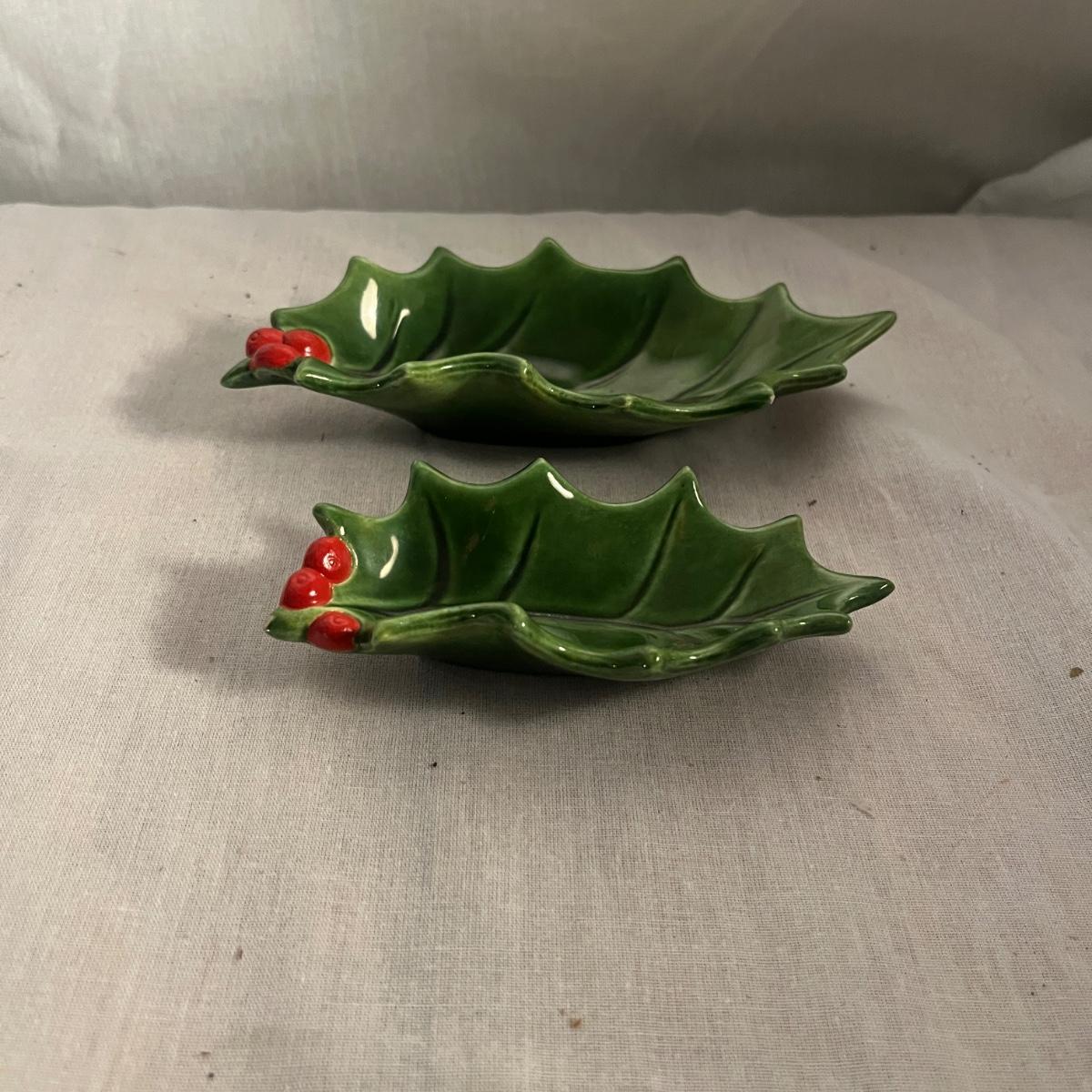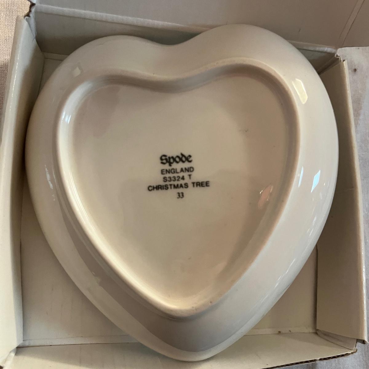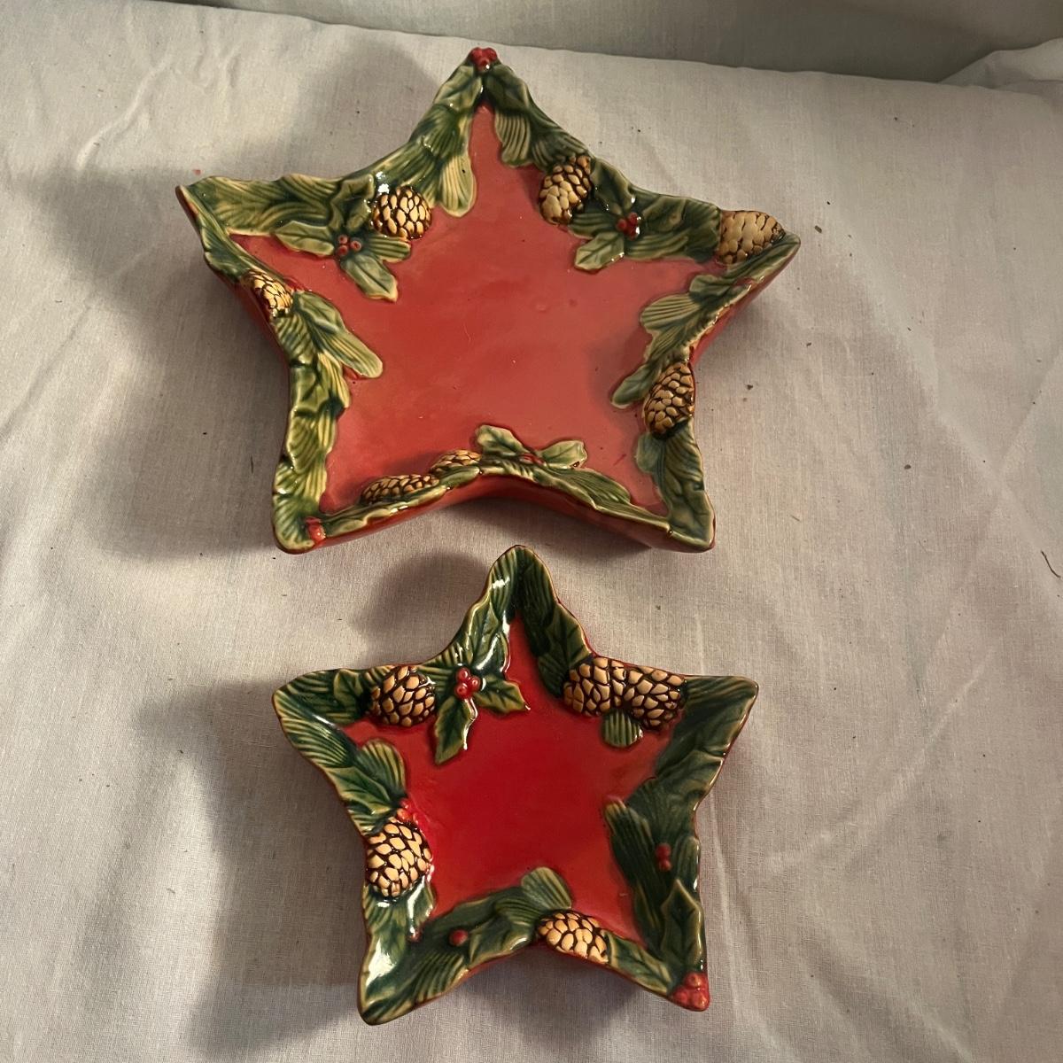 This collection of ceramic Christmas dishes that includes a Spode heart shaped dish, large bowl, two candle holders, leaf dishes and two star shaped dishes. Largest bowl measures 10”D x 5”H.