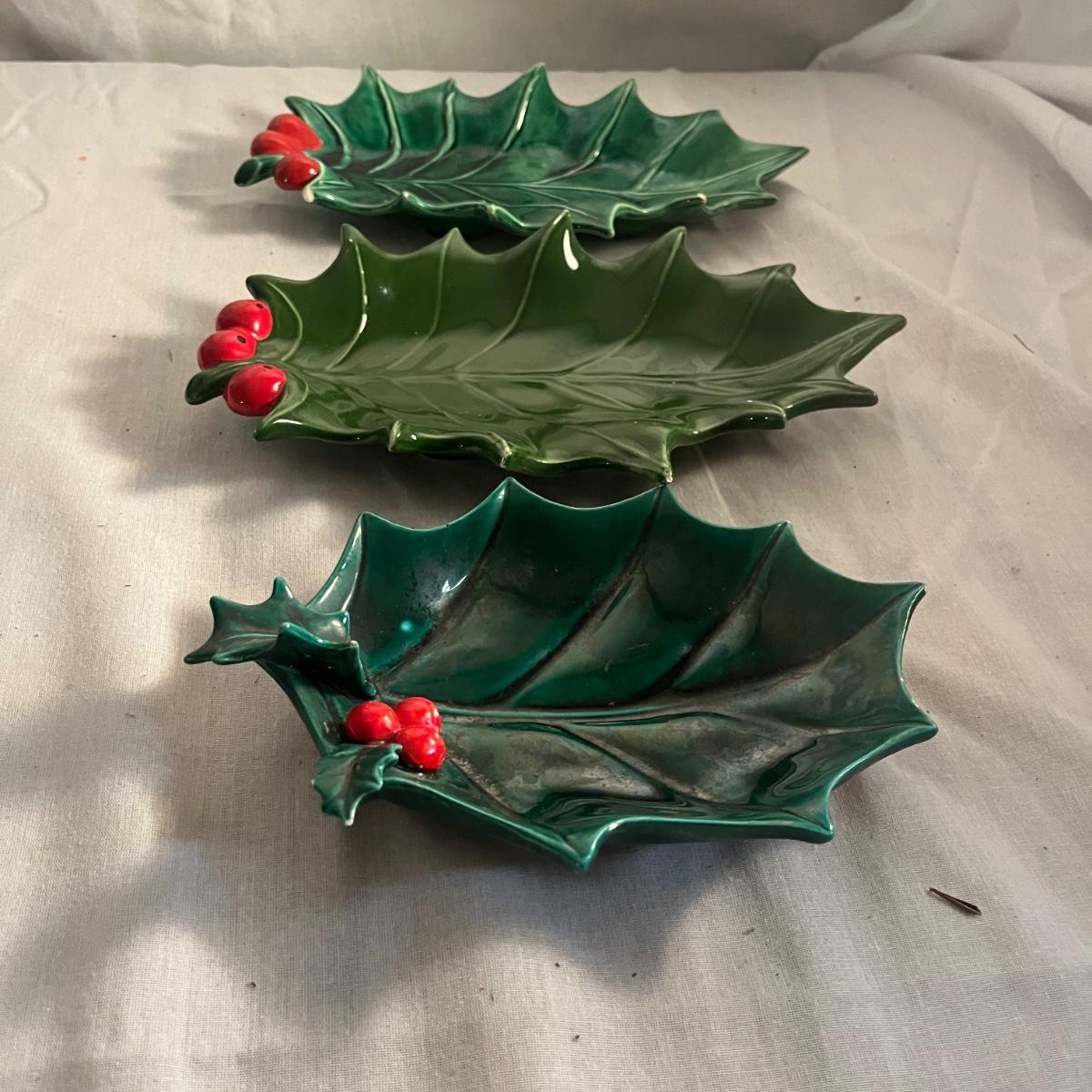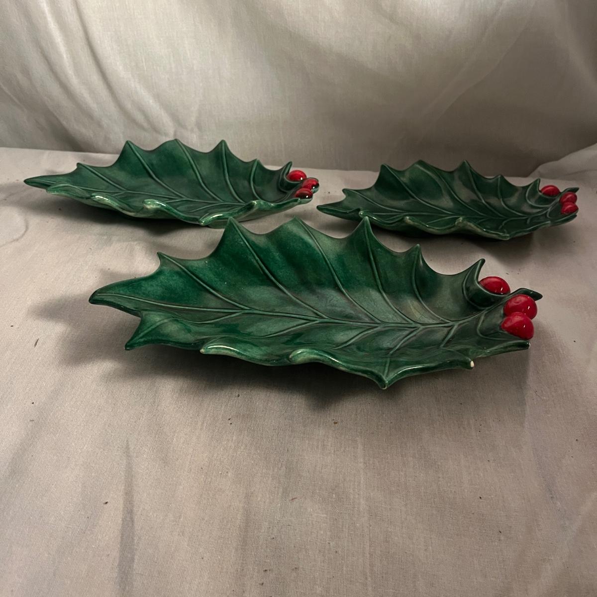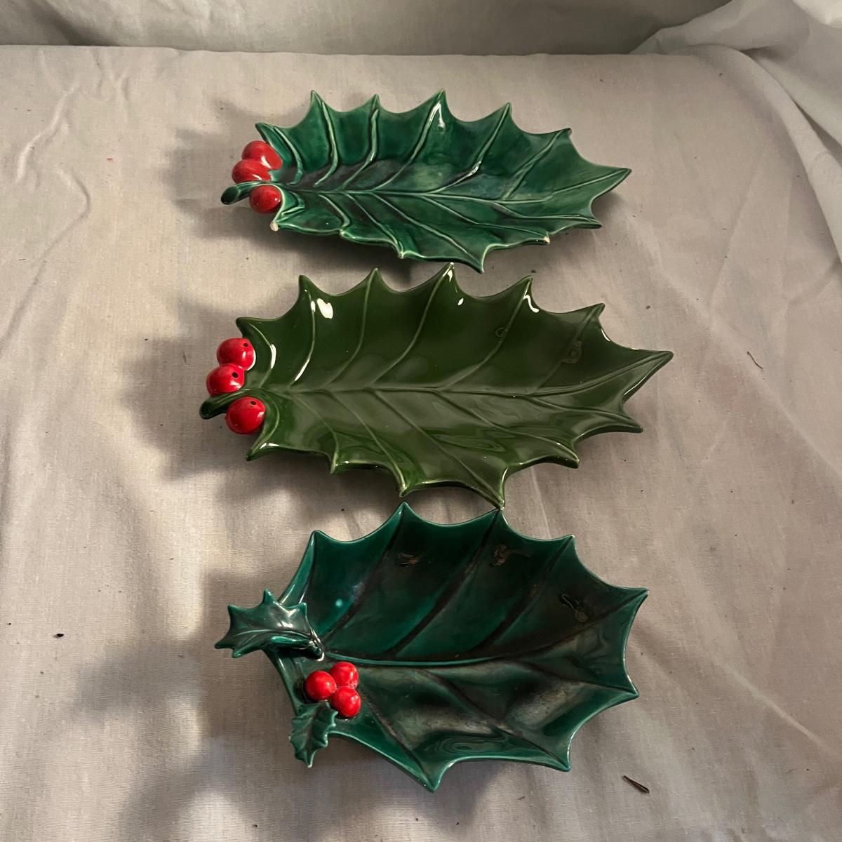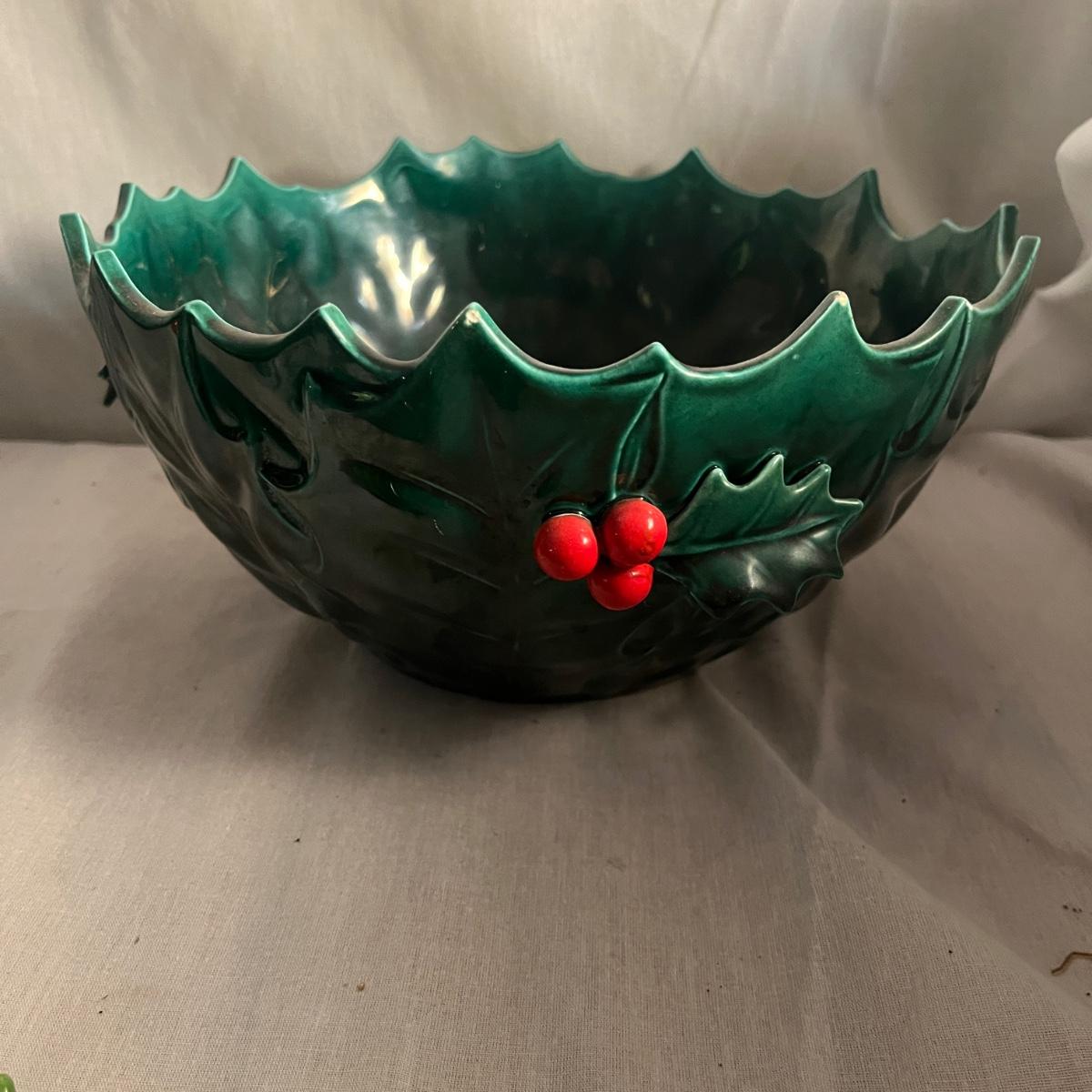This collection of ceramic Christmas dishes that includes a Spode heart shaped dish, large bowl, two candle holders, leaf dishes and two star shaped dishes. Largest bowl measures 10”D x 5”H.