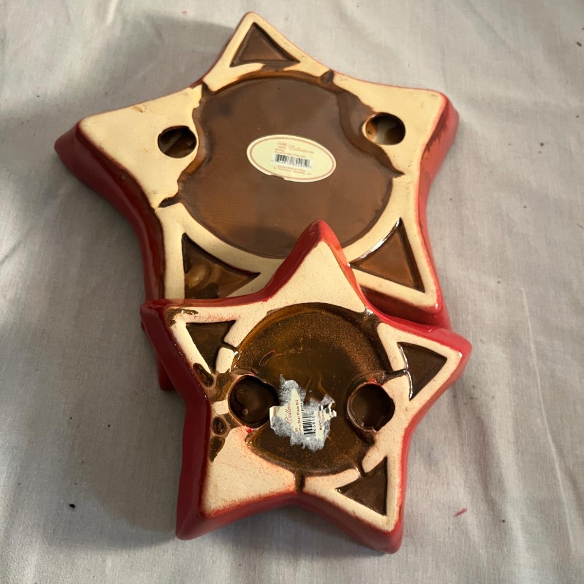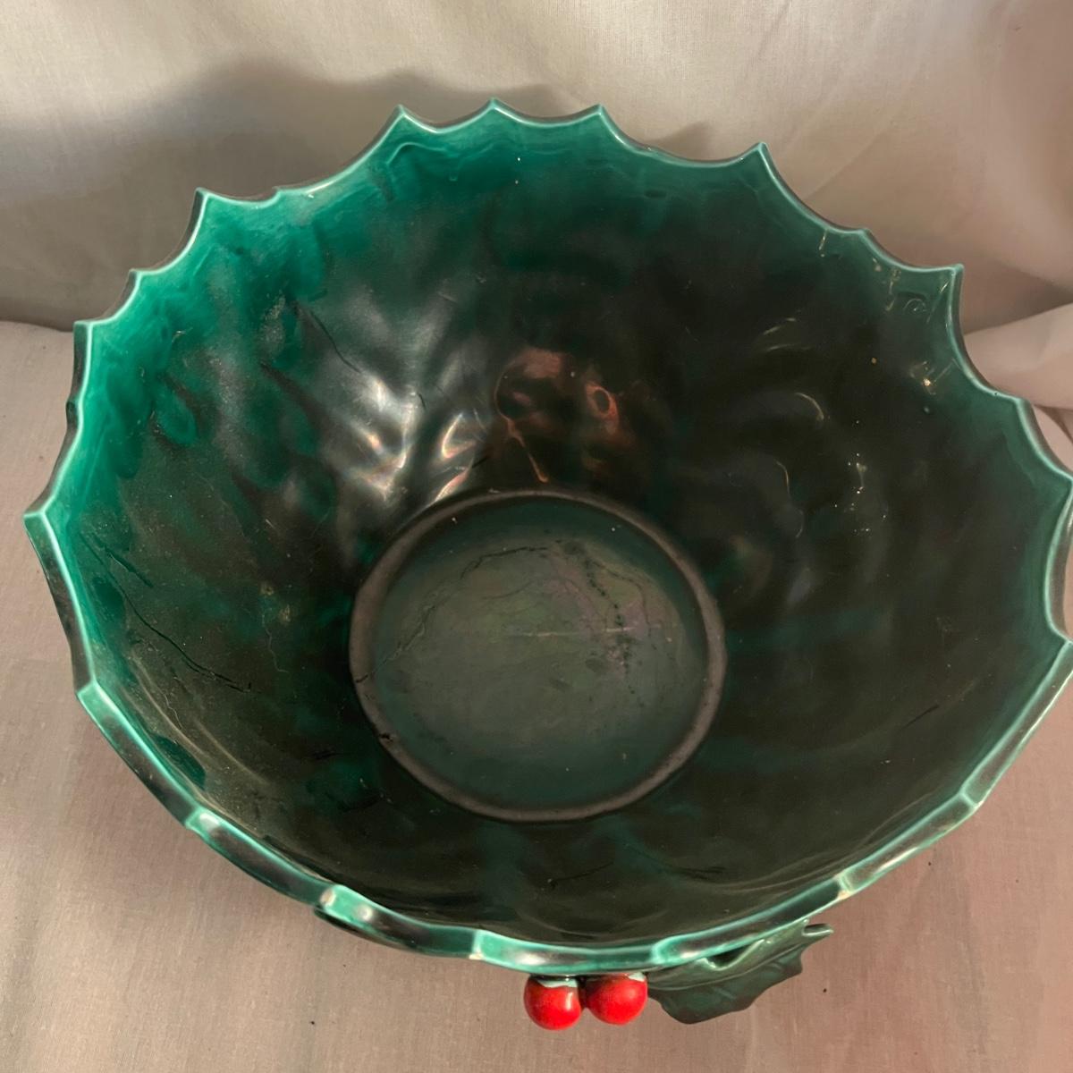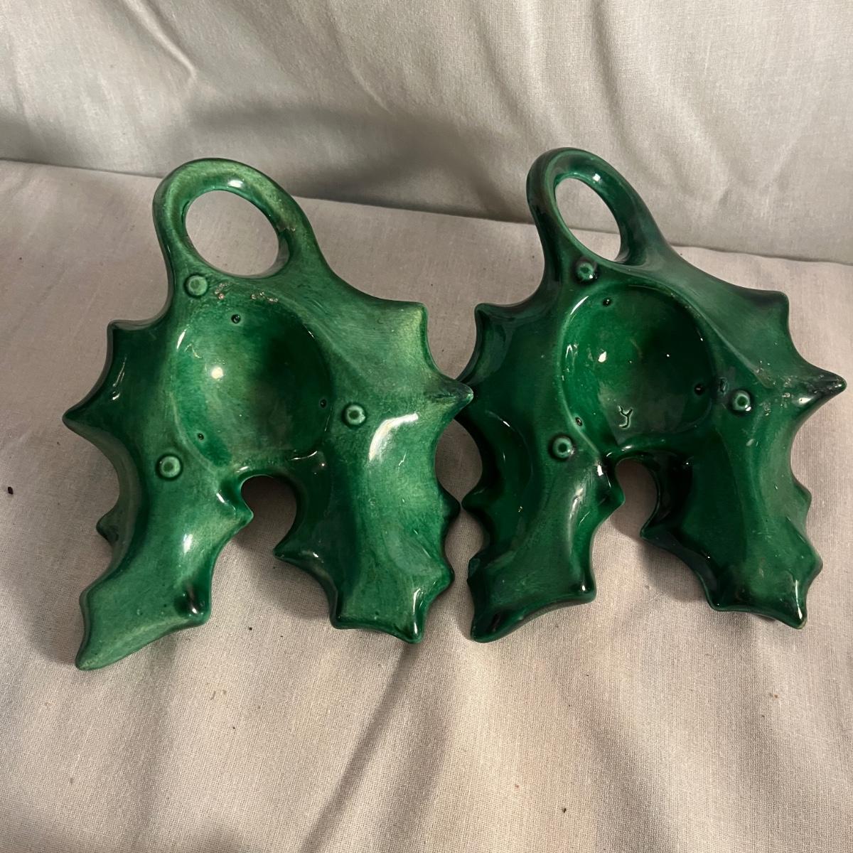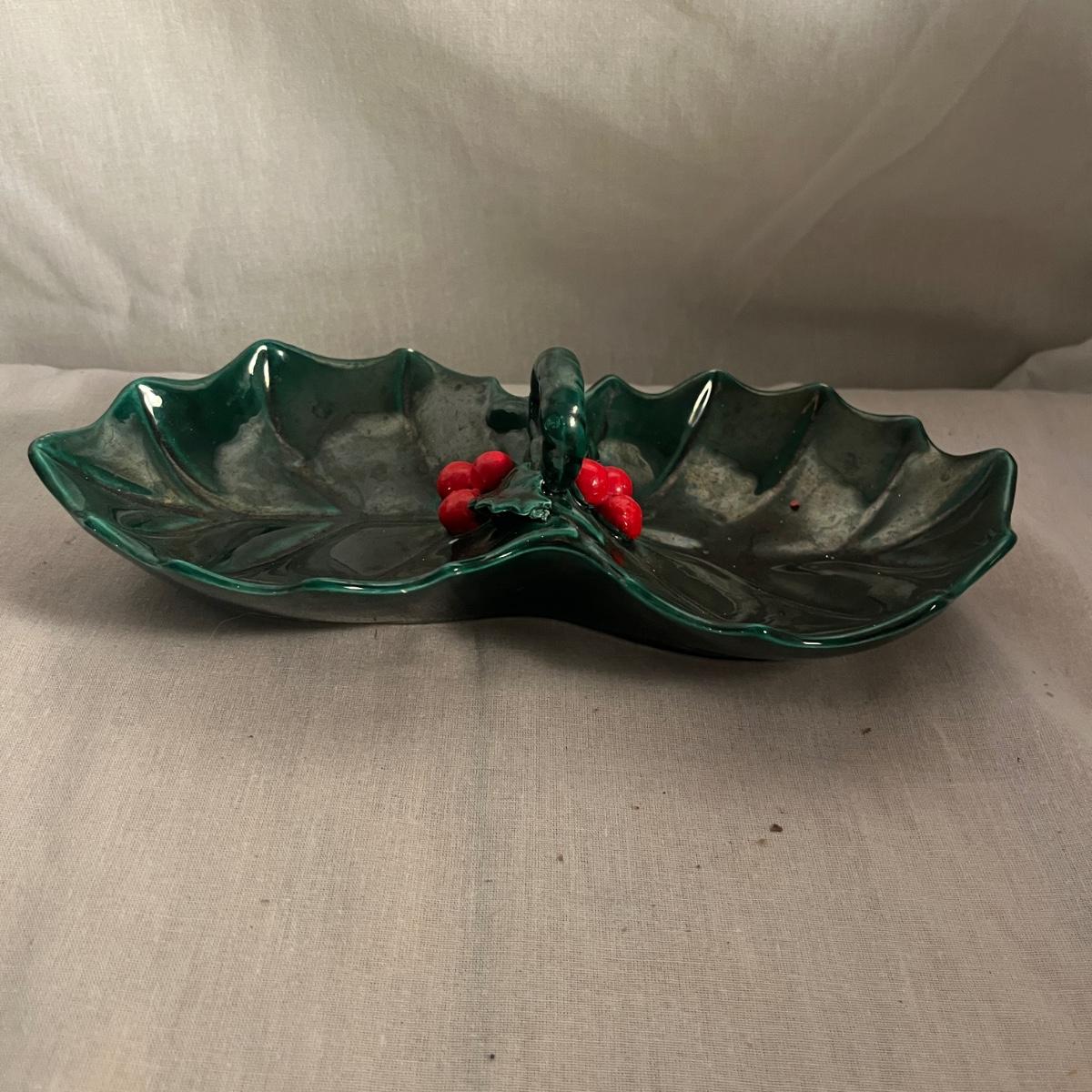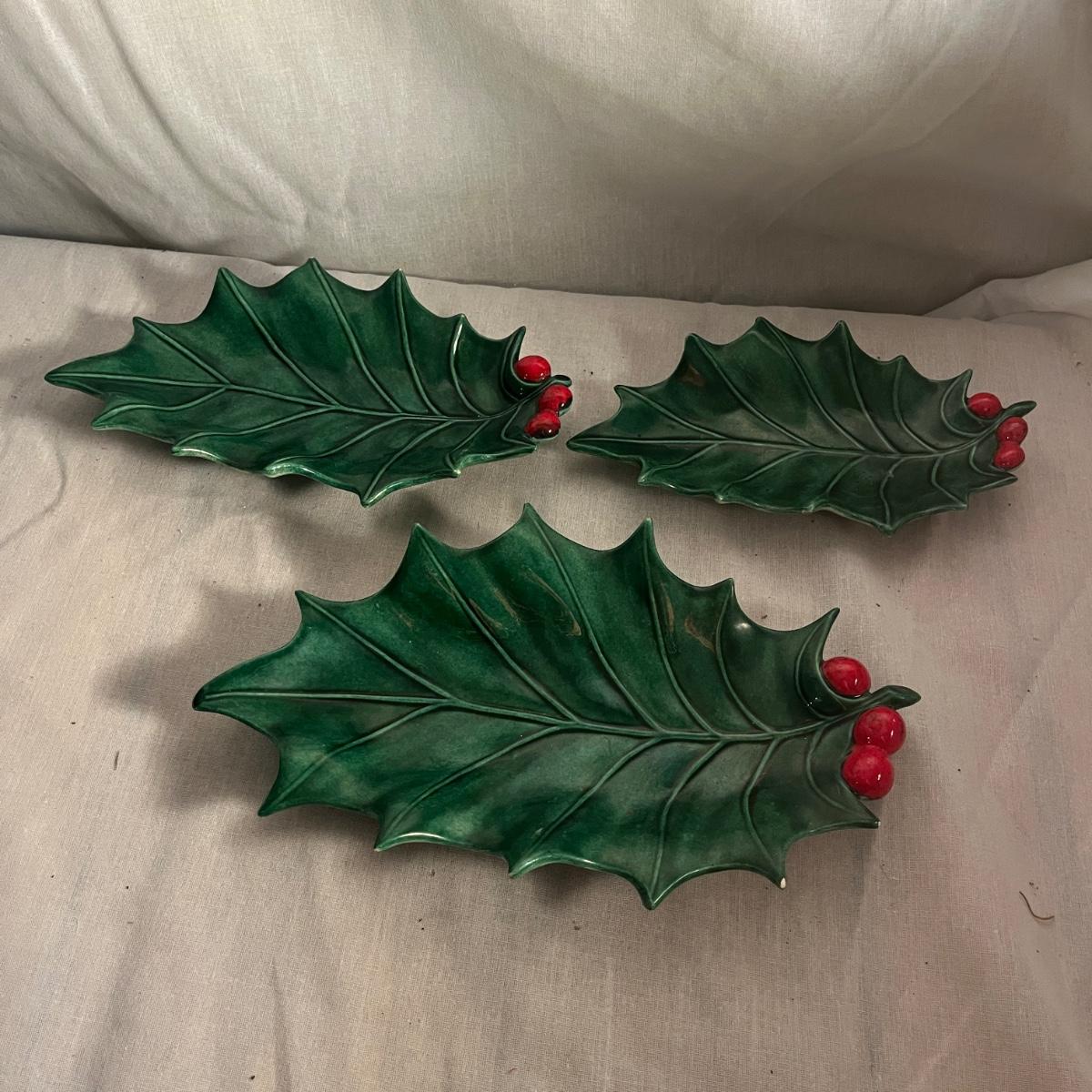 This collection of ceramic Christmas dishes that includes a Spode heart shaped dish, large bowl, two candle holders, leaf dishes and two star shaped dishes. Largest bowl measures 10”D x 5”H.