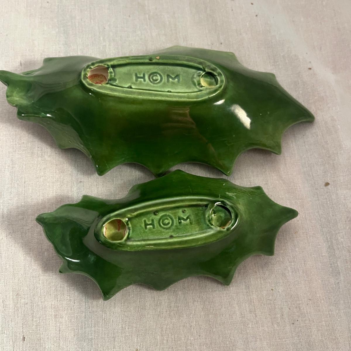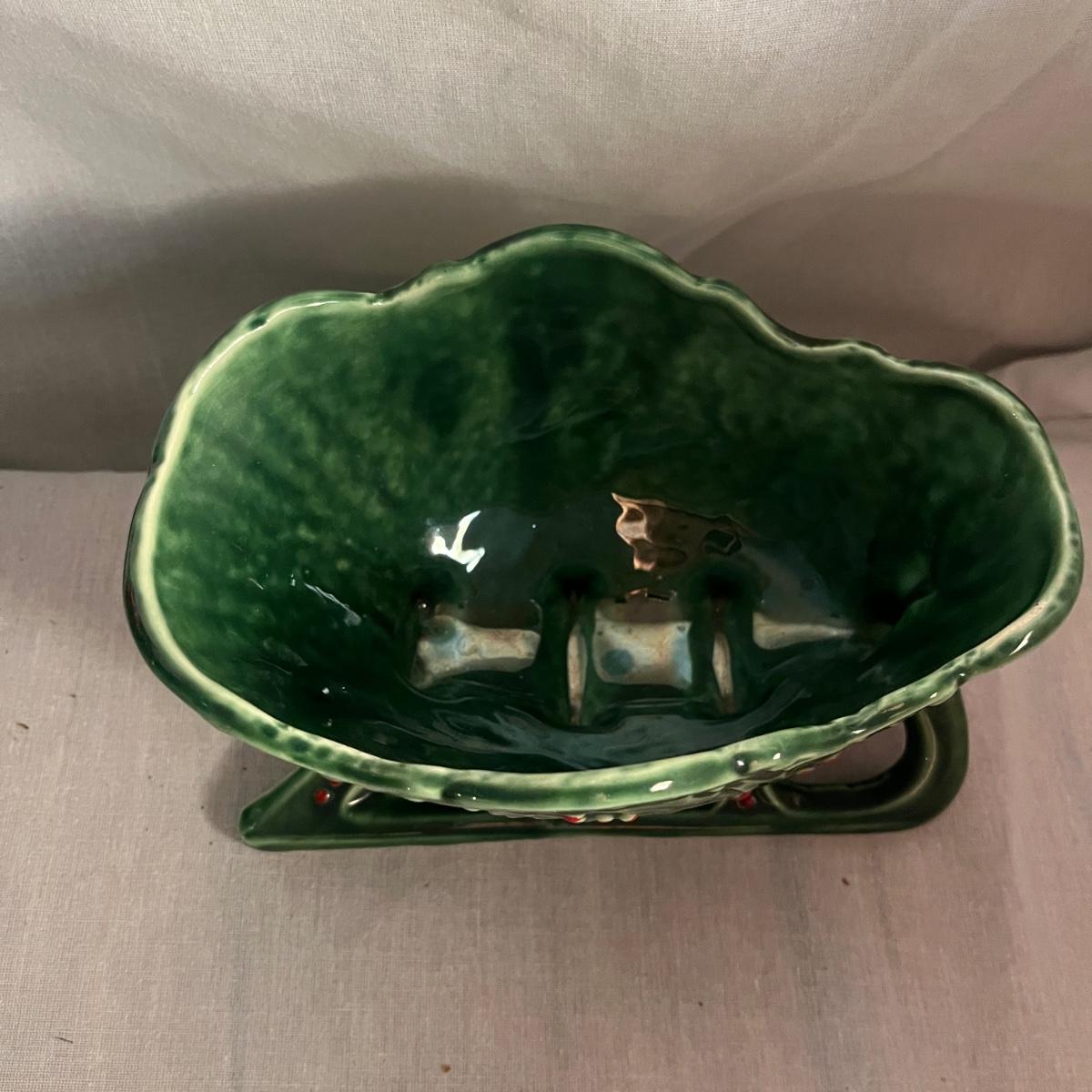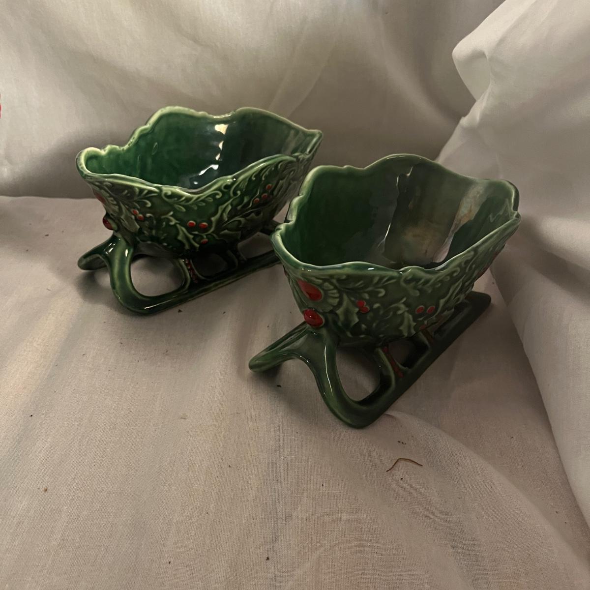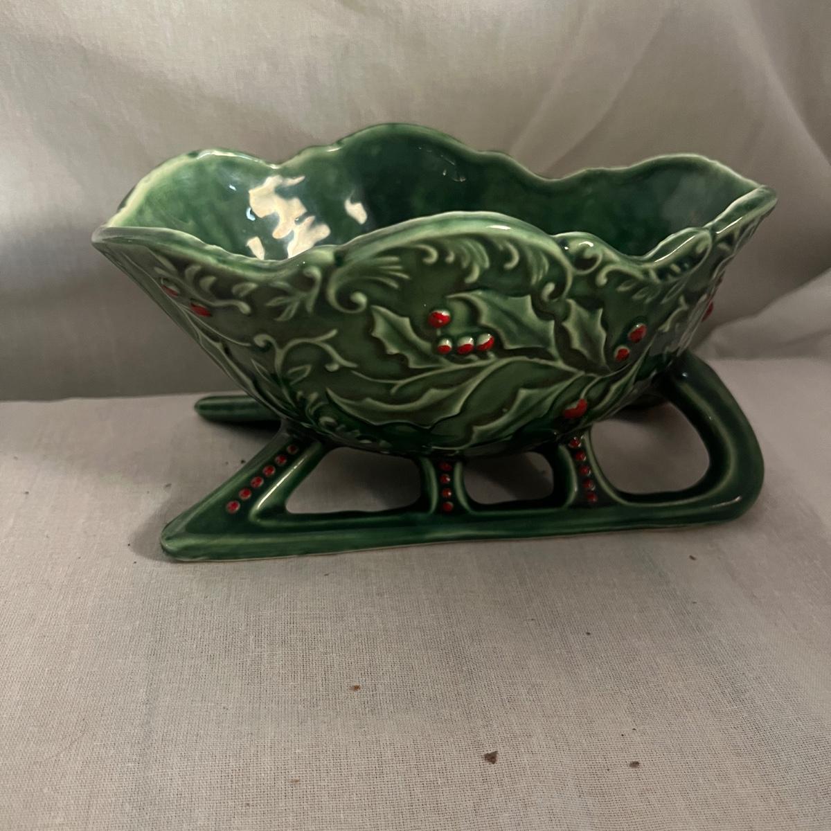 This collection of ceramic Christmas dishes that includes a Spode heart shaped dish, large bowl, two candle holders, leaf dishes and two star shaped dishes. Largest bowl measures 10”D x 5”H.
