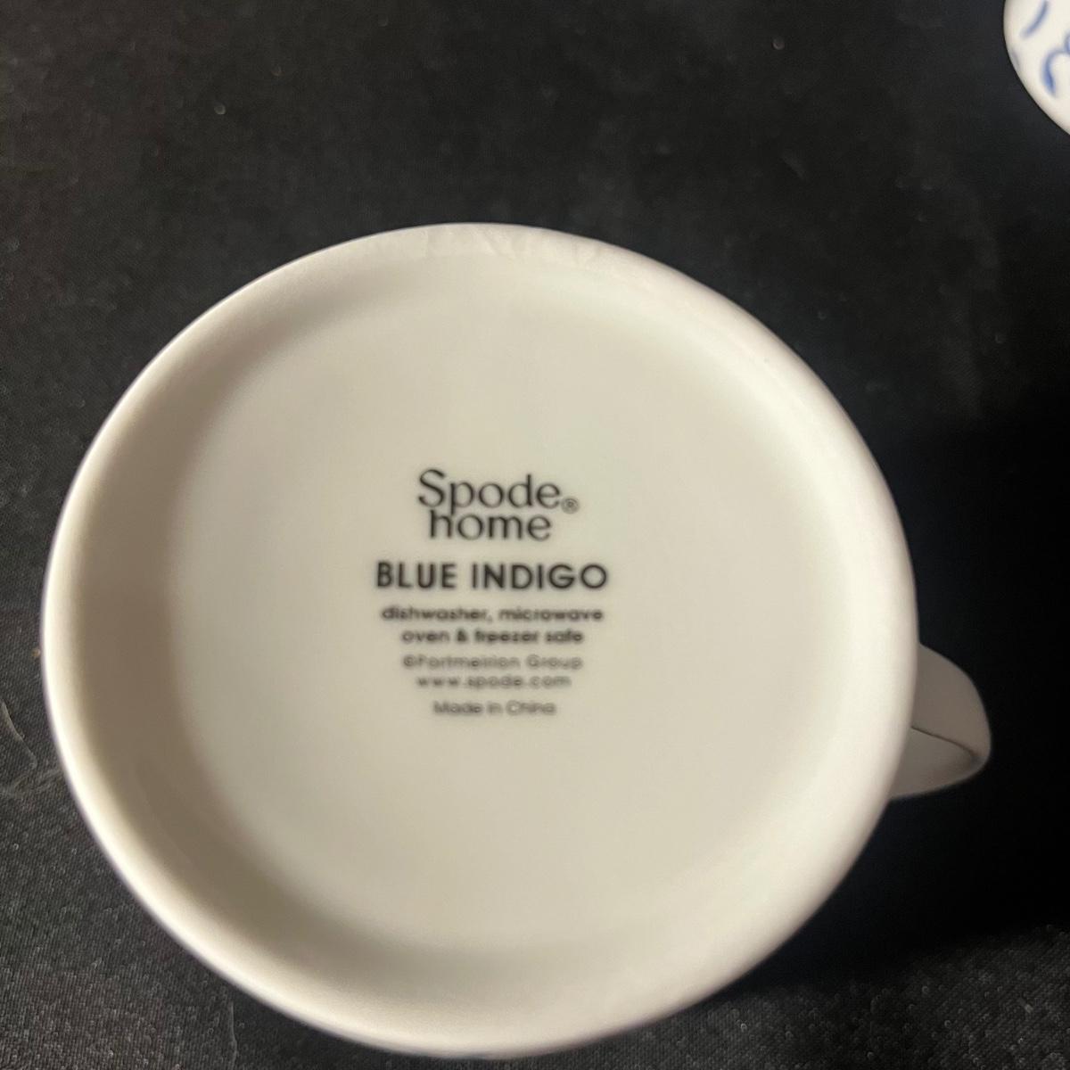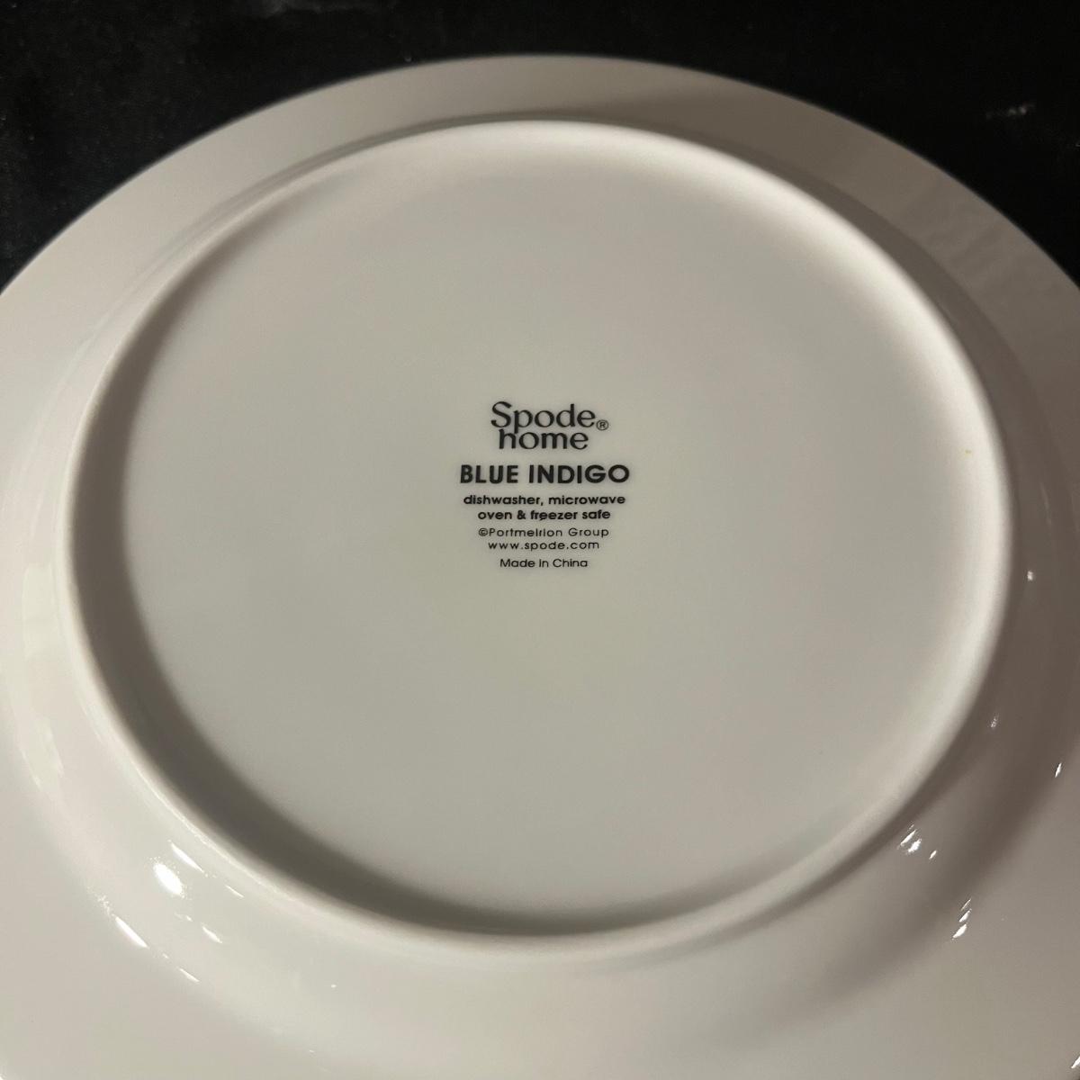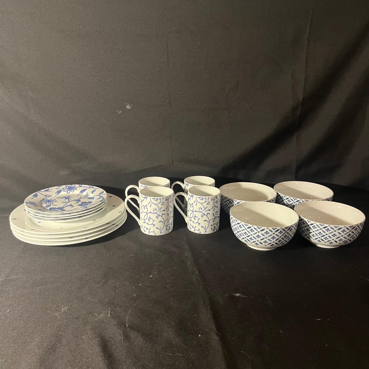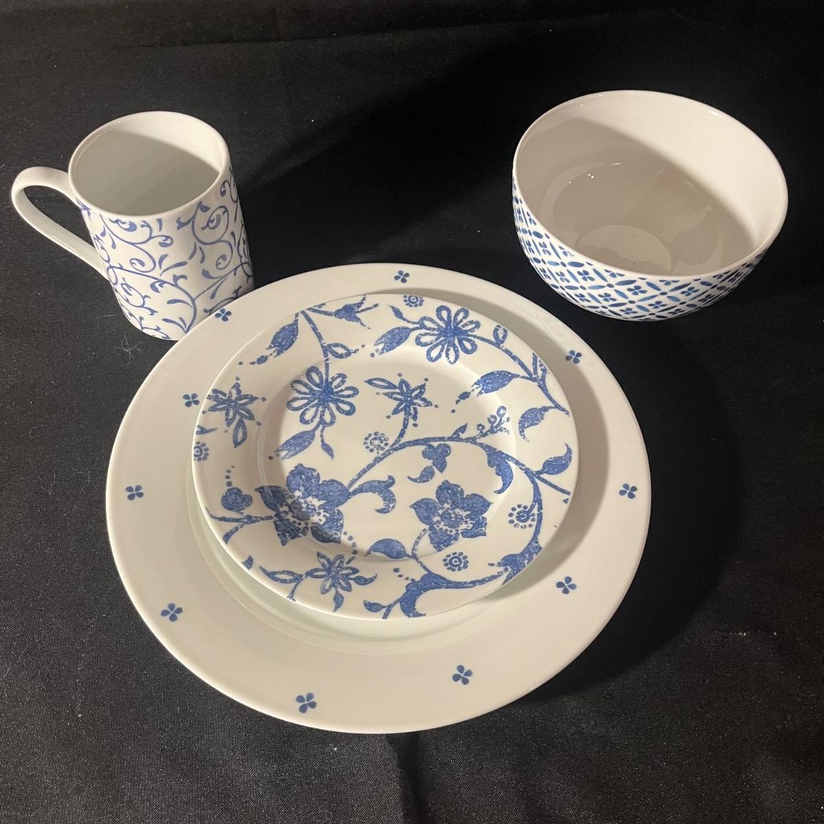 Lot includes a sixteen piece dish set by Spode Home in Blue Indigo pattern. Four place settings with a 10.5" dinner plate, a salad plate, soup bowl and coffee mug in a contrasting floral design.