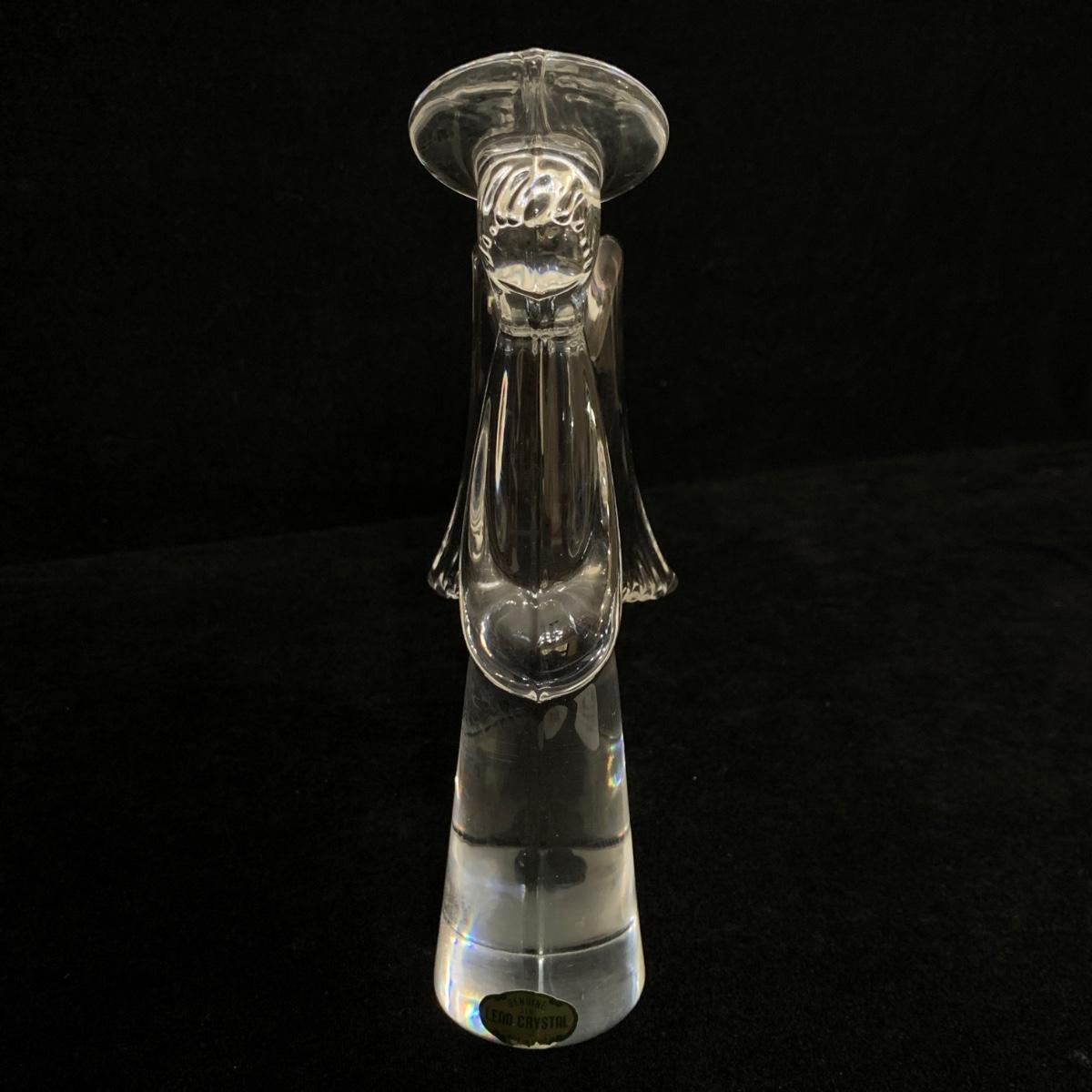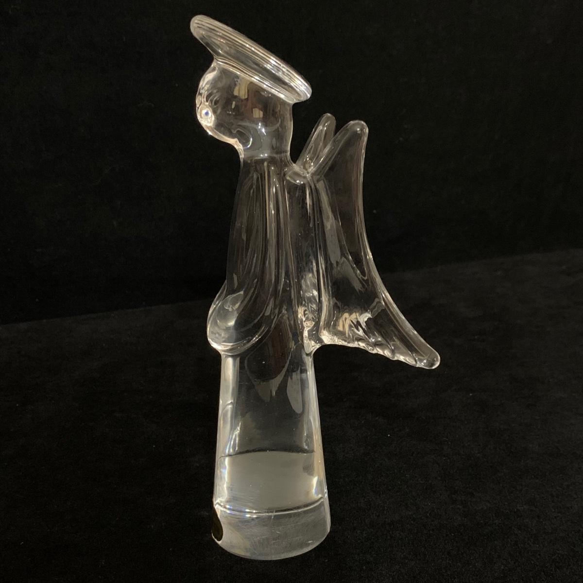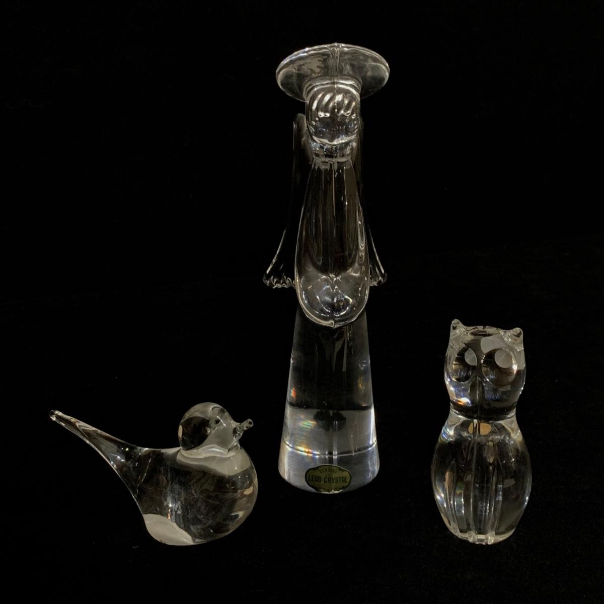 Three lead Crystal figurines. One is a Spode cat, marked that is is hand-blown, hand-cut full lead crystal made in West Germany. It is 4” tall. Another is an angel, marked that it is genuine 25% lead crystal, made in Japan. The angel is 8.75” tall. The third figurine is a bird. It is unmarked and could be glass rather than crystal, but we cannot confirm its material. All items are in very good condition.