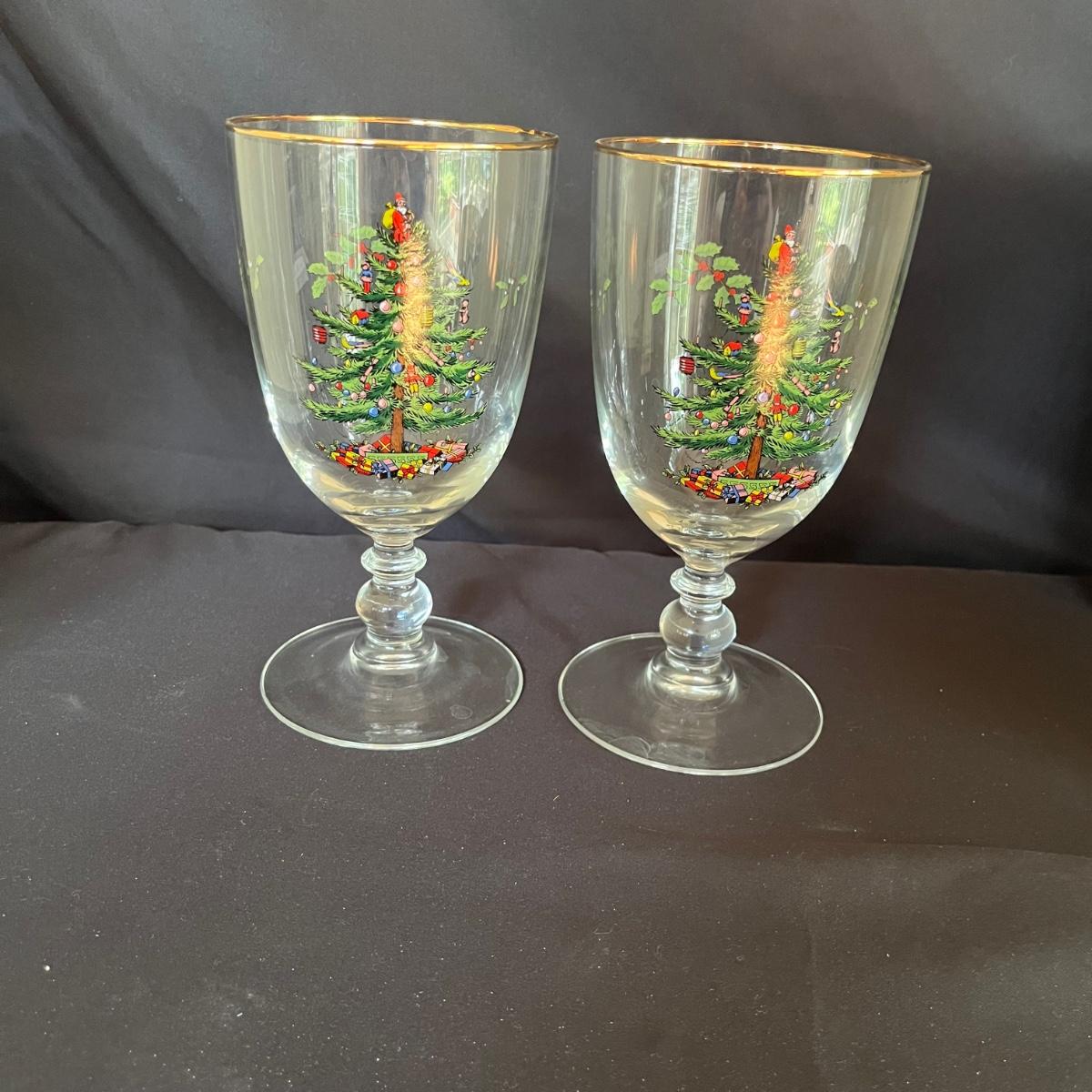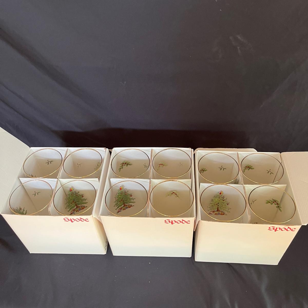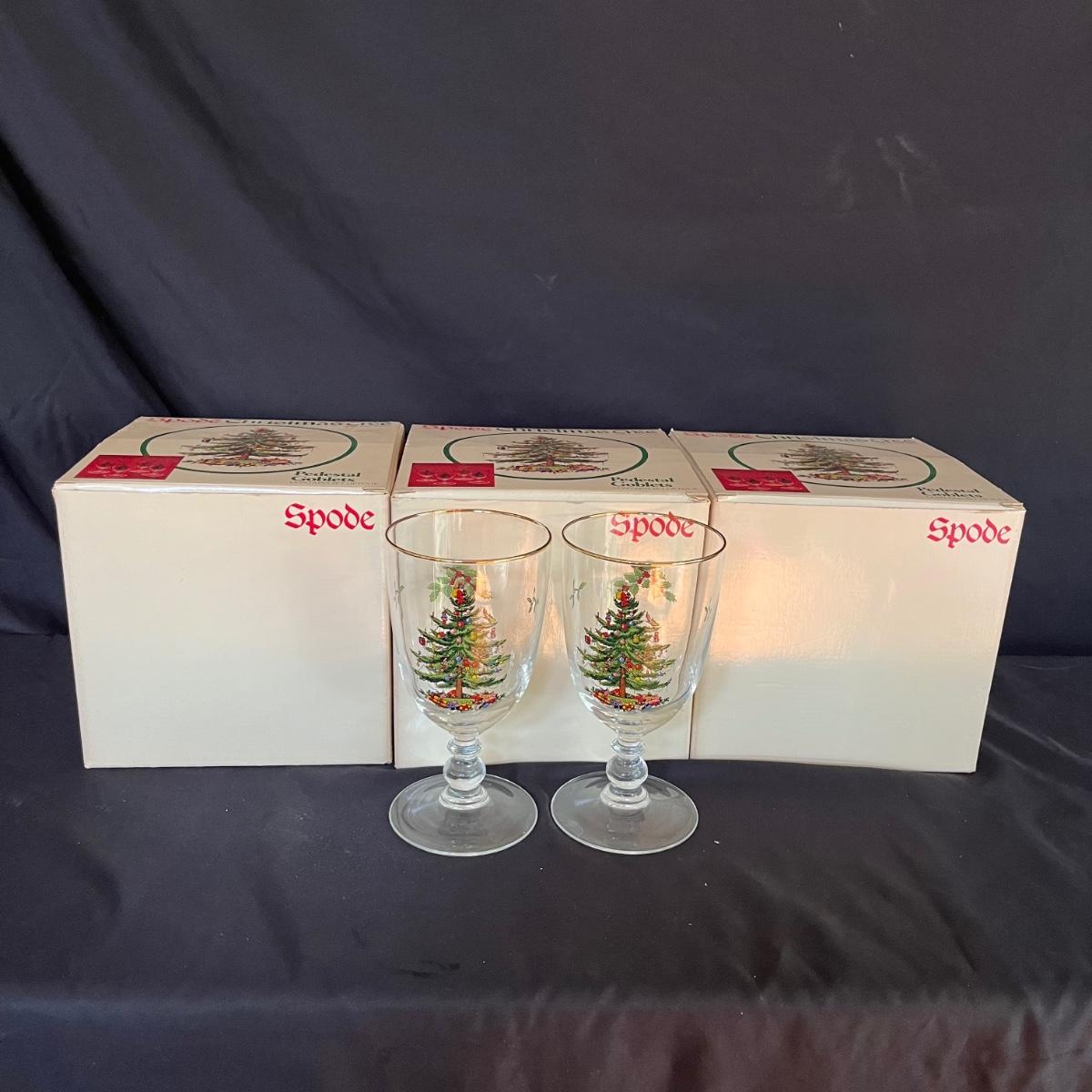 Lot includes fourteen Spode Christmas Goblets. 12 are in boxes and two are loose. Glasses measure 3.5”D x 7”.