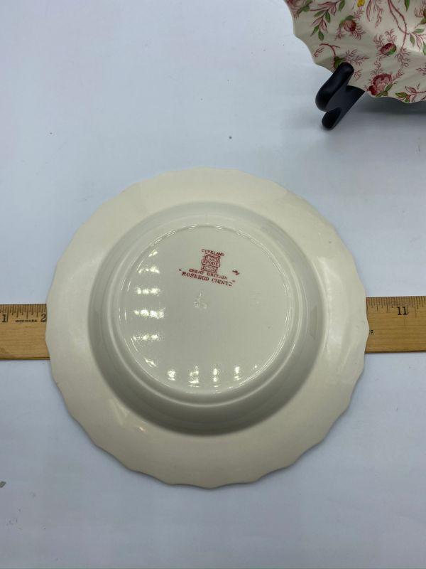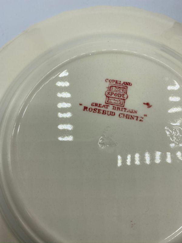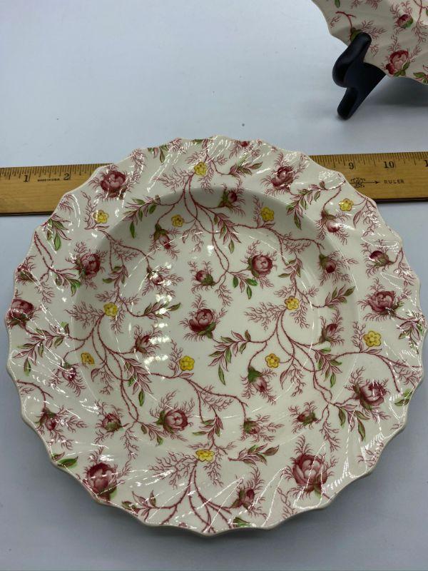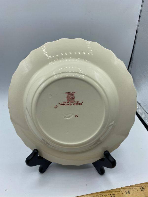 Pair of beautiful Rosebud Chintz bowls from Spode. Dark red floral pattern. Scalloped edge. Shallow bowl good for dessert. There is some crazing to the glaze.