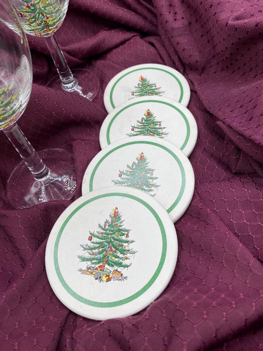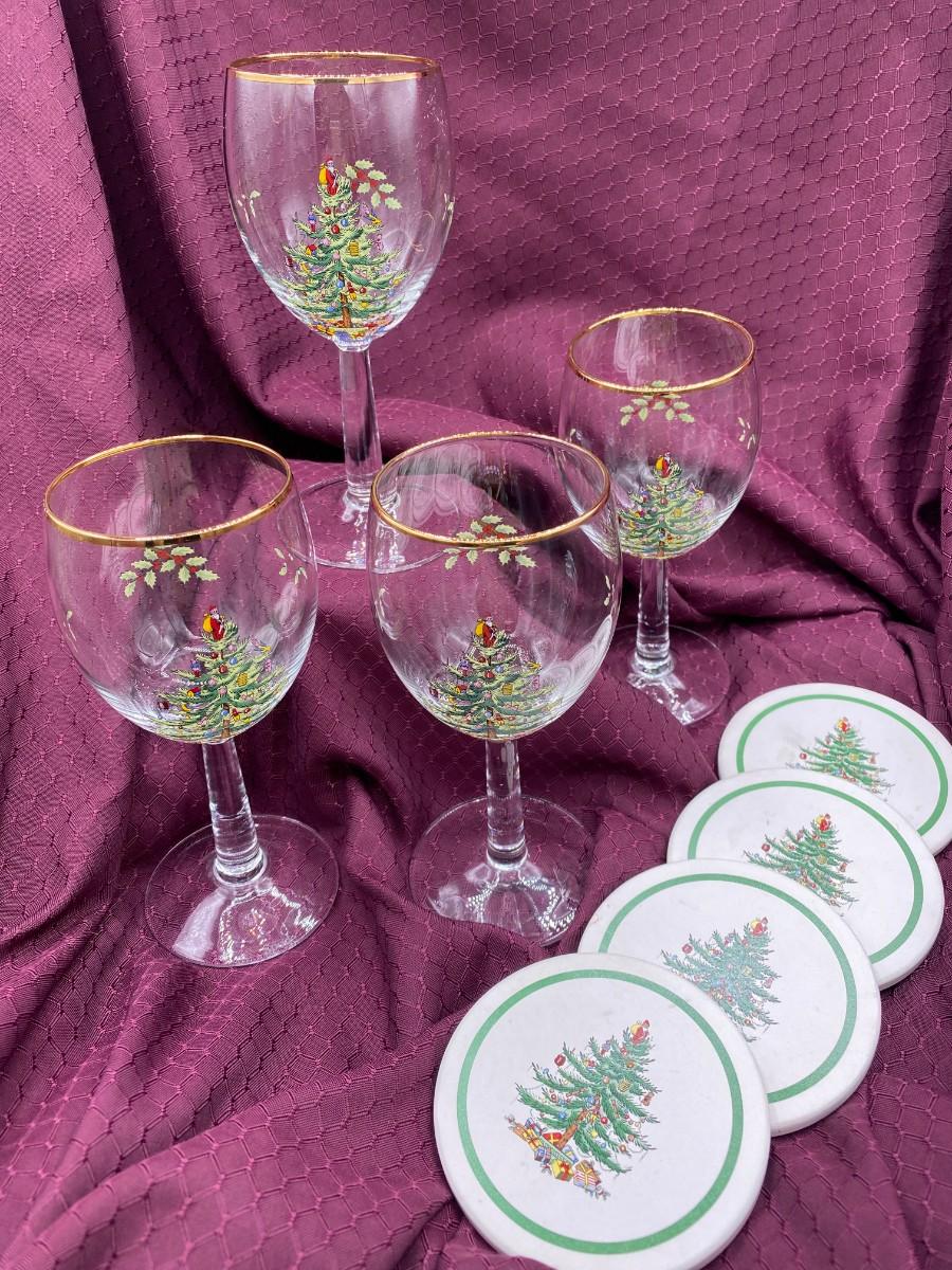 4 Wine glasses 13 oz each, gold rimmed w Christmas Tree design. 4 Coasters