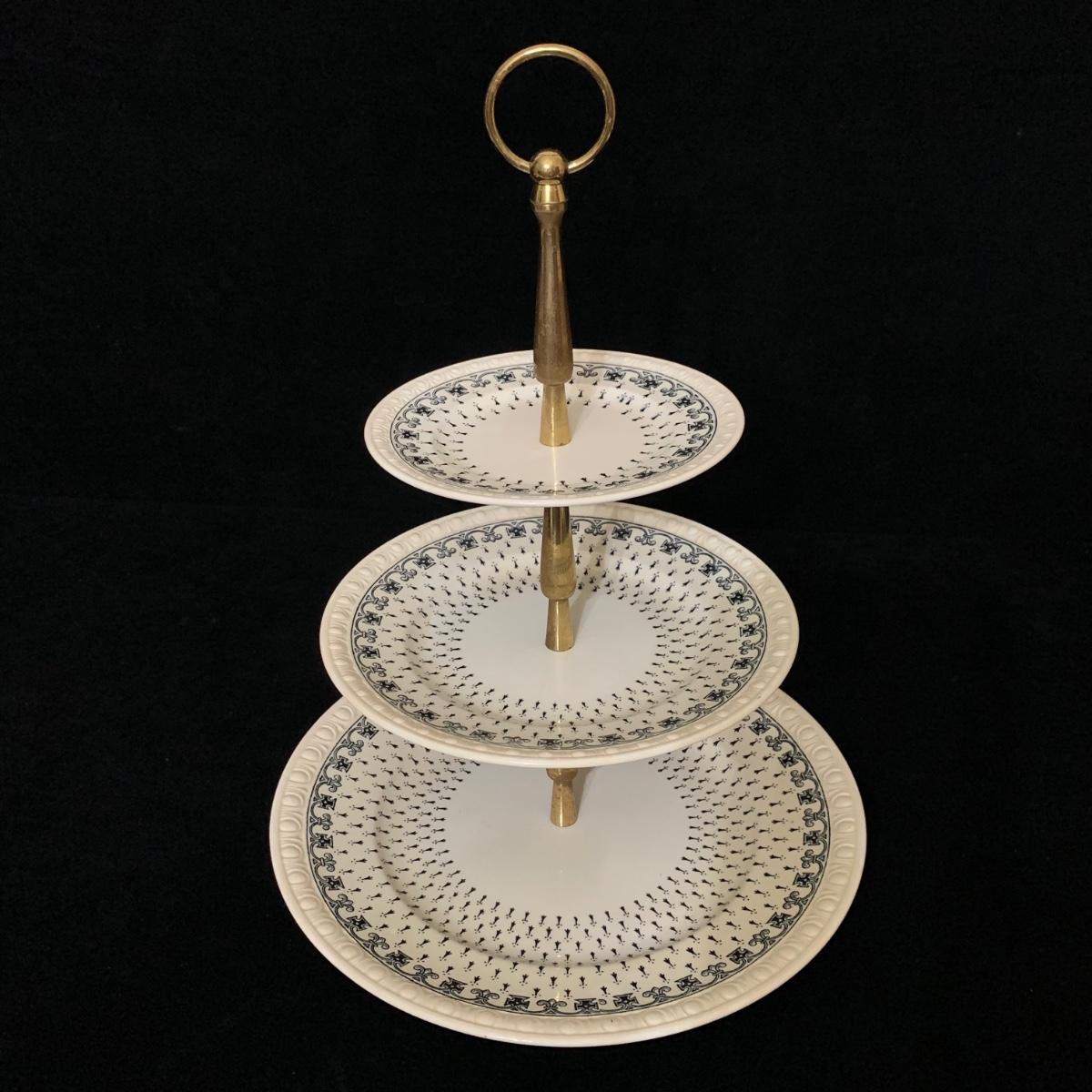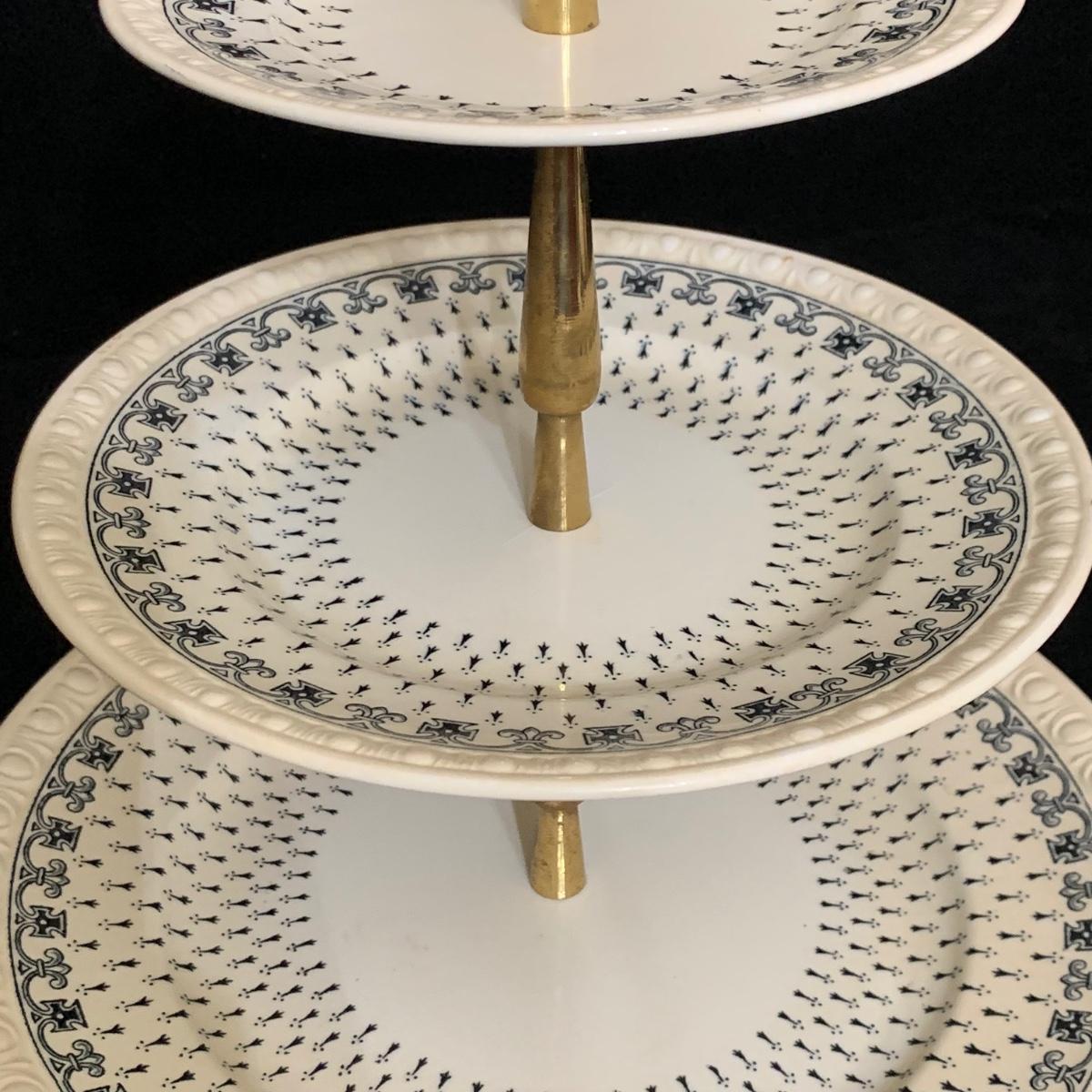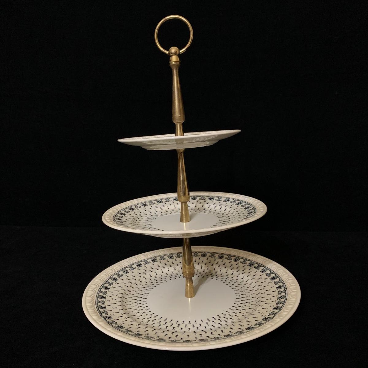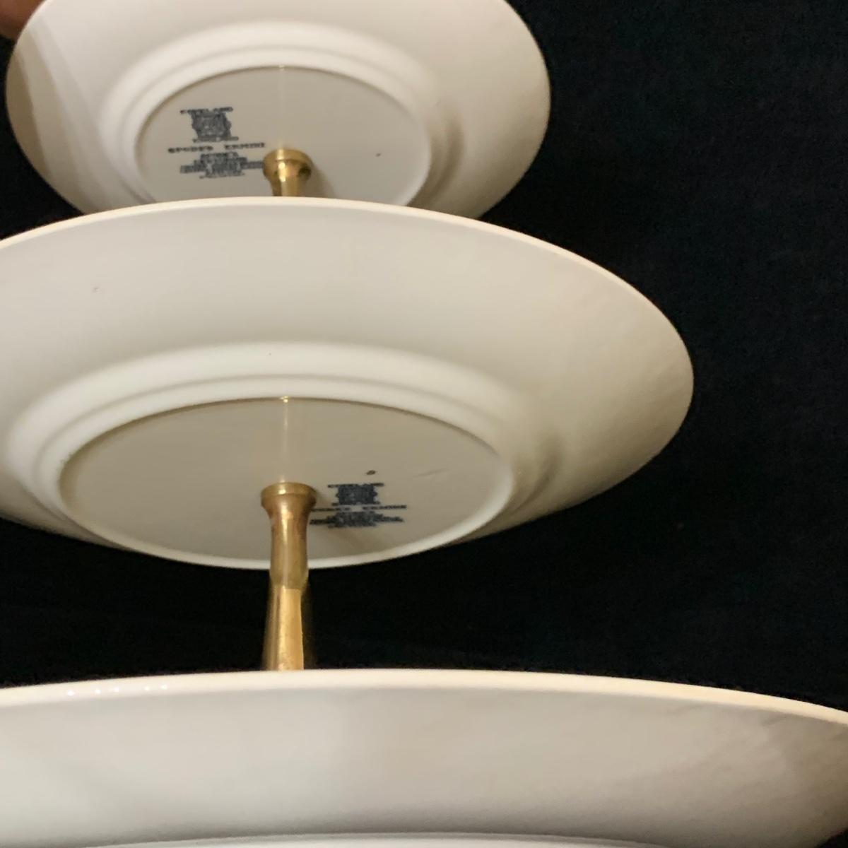 Spode’s Ermine Spode’s Centurion three-tiered server. Biggest tier is 10.75”D. Unit is about 14” tall. Tiers are supported by metal with a brass finish. Brass finish is a bit worn, see pictures. Dishes have slight discoloration that appears to be cleanable. Item is sturdy and structurally in good condition. Assembles and disassembles easily.