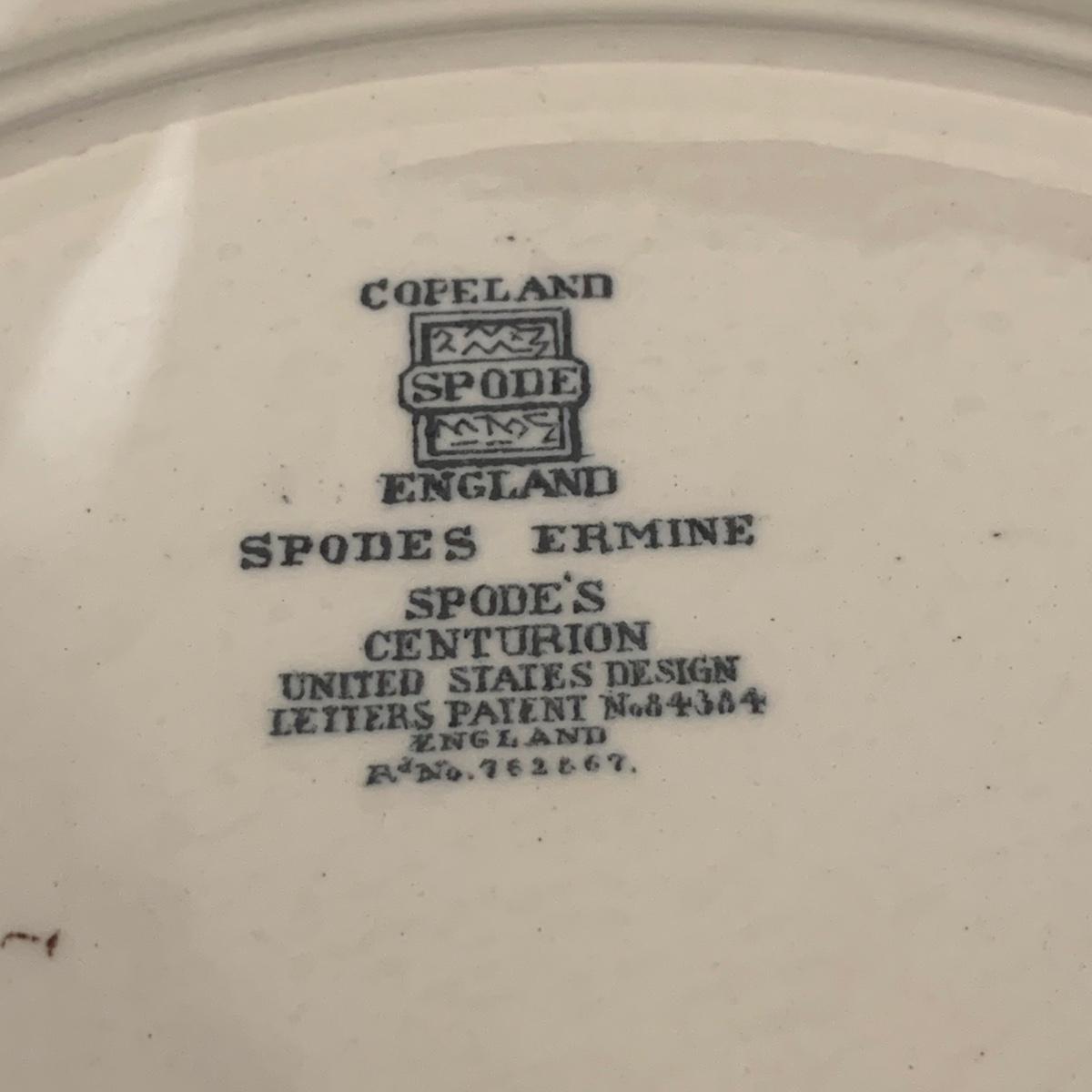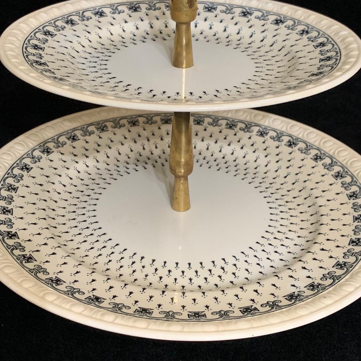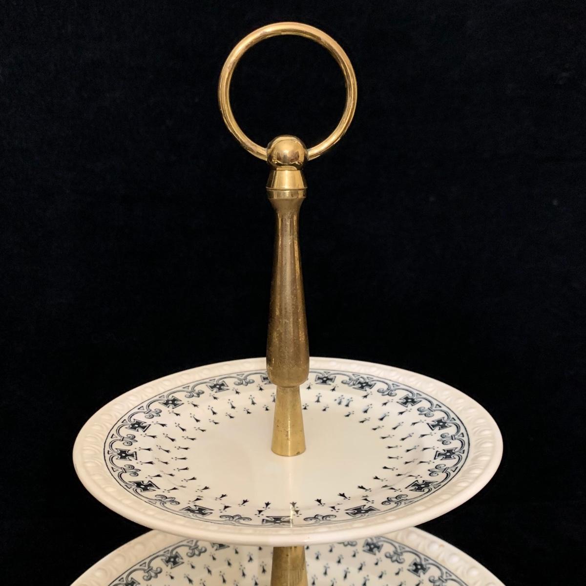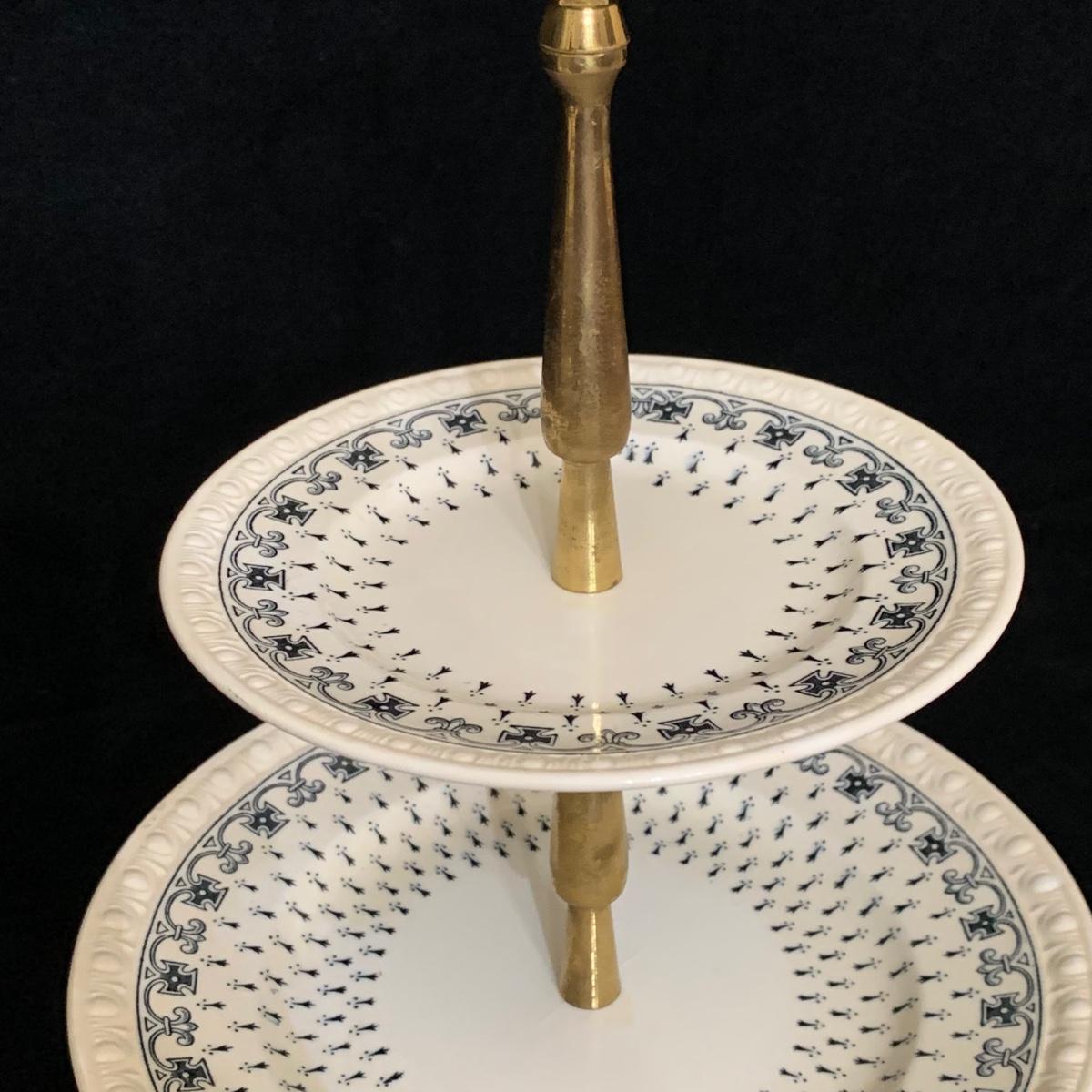 Spode’s Ermine Spode’s Centurion three-tiered server. Biggest tier is 10.75”D. Unit is about 14” tall. Tiers are supported by metal with a brass finish. Brass finish is a bit worn, see pictures. Dishes have slight discoloration that appears to be cleanable. Item is sturdy and structurally in good condition. Assembles and disassembles easily.