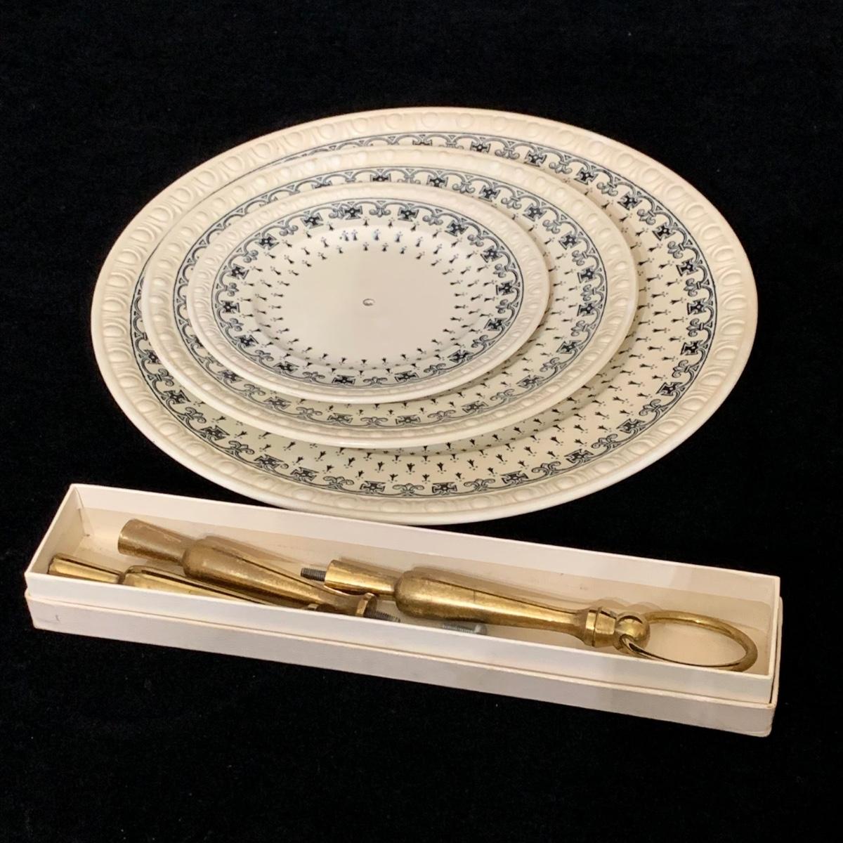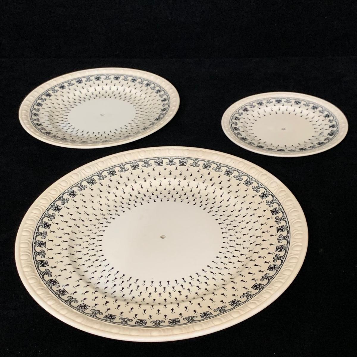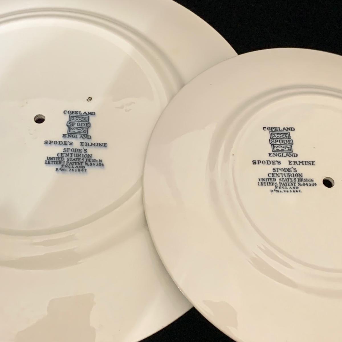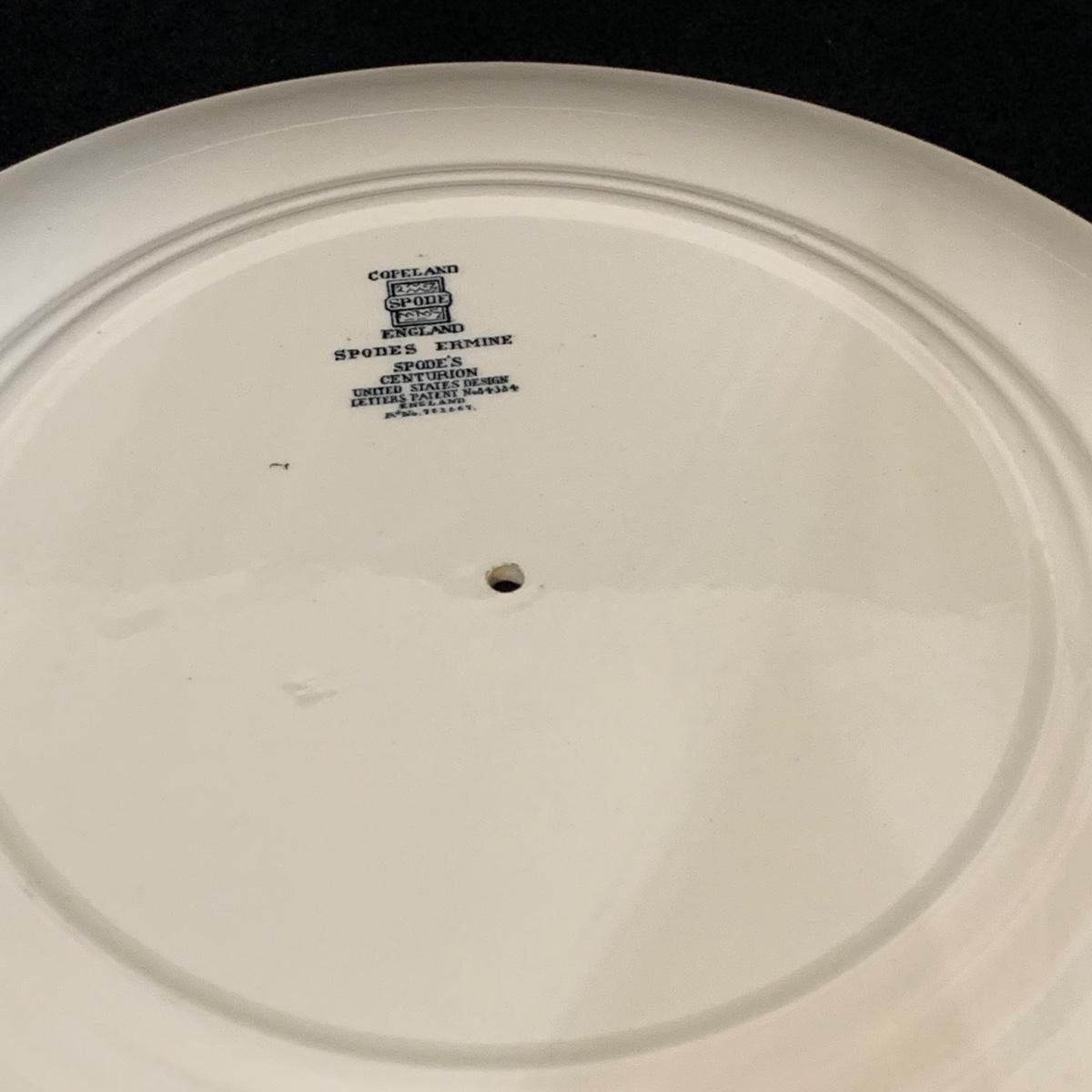 Spode’s Ermine Spode’s Centurion three-tiered server. Biggest tier is 10.75”D. Unit is about 14” tall. Tiers are supported by metal with a brass finish. Brass finish is a bit worn, see pictures. Dishes have slight discoloration that appears to be cleanable. Item is sturdy and structurally in good condition. Assembles and disassembles easily.