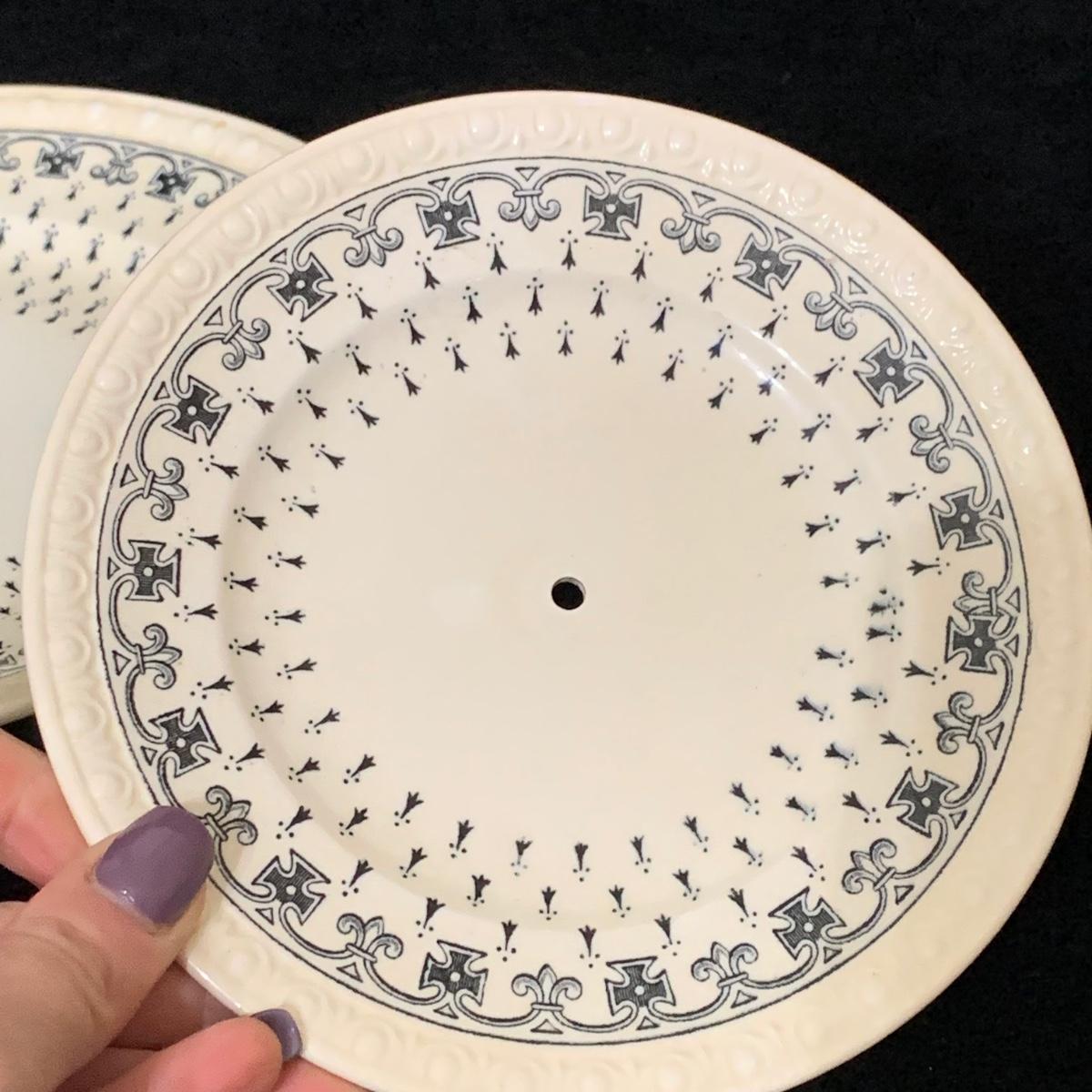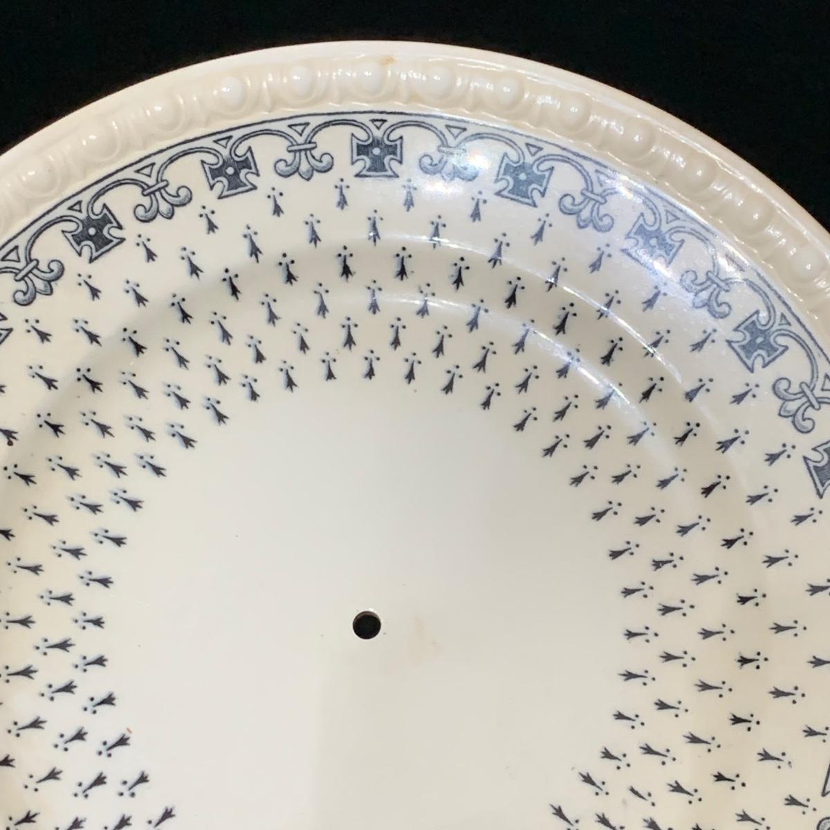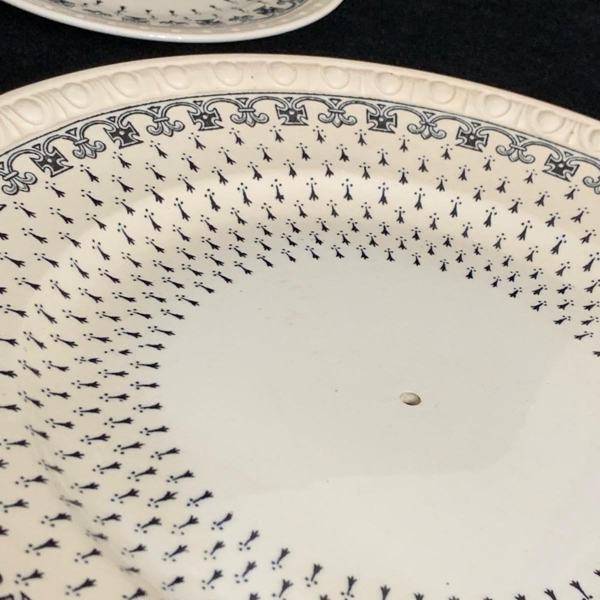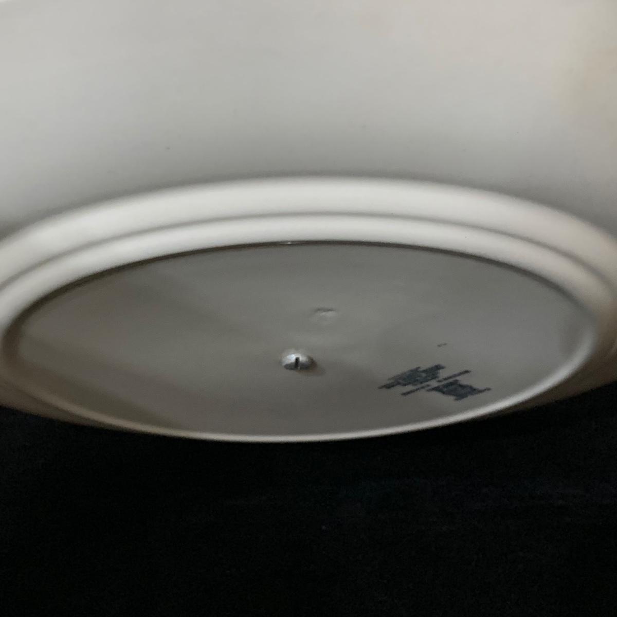 Spode’s Ermine Spode’s Centurion three-tiered server. Biggest tier is 10.75”D. Unit is about 14” tall. Tiers are supported by metal with a brass finish. Brass finish is a bit worn, see pictures. Dishes have slight discoloration that appears to be cleanable. Item is sturdy and structurally in good condition. Assembles and disassembles easily.