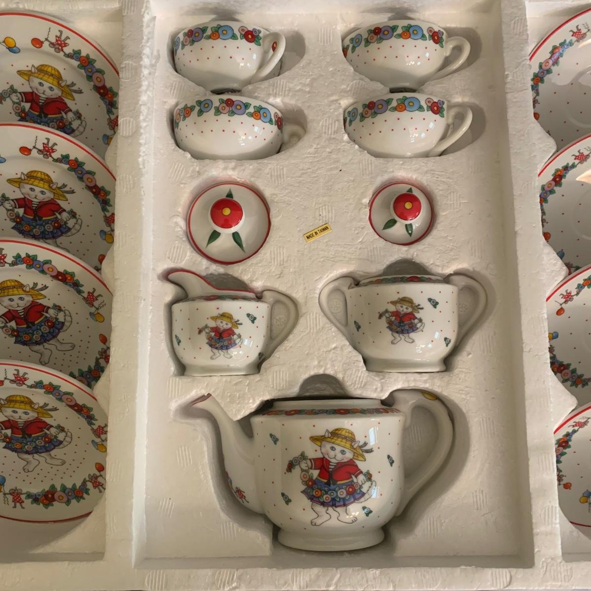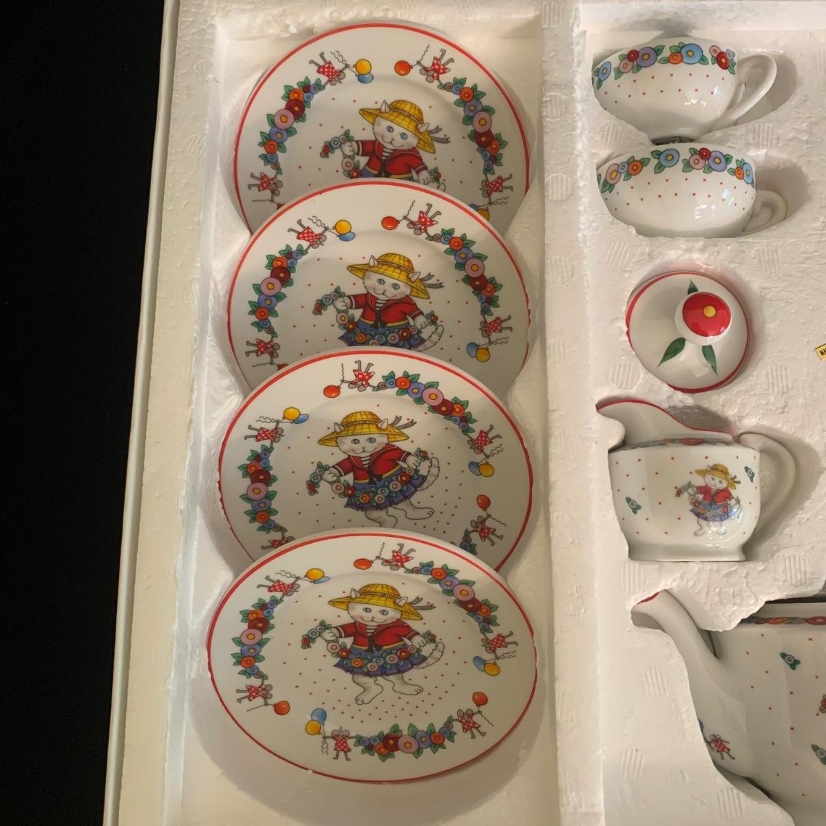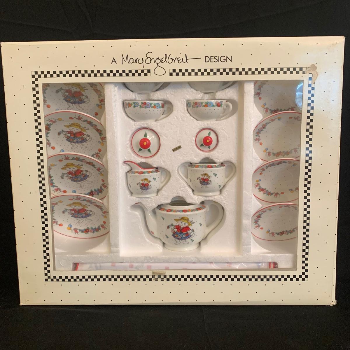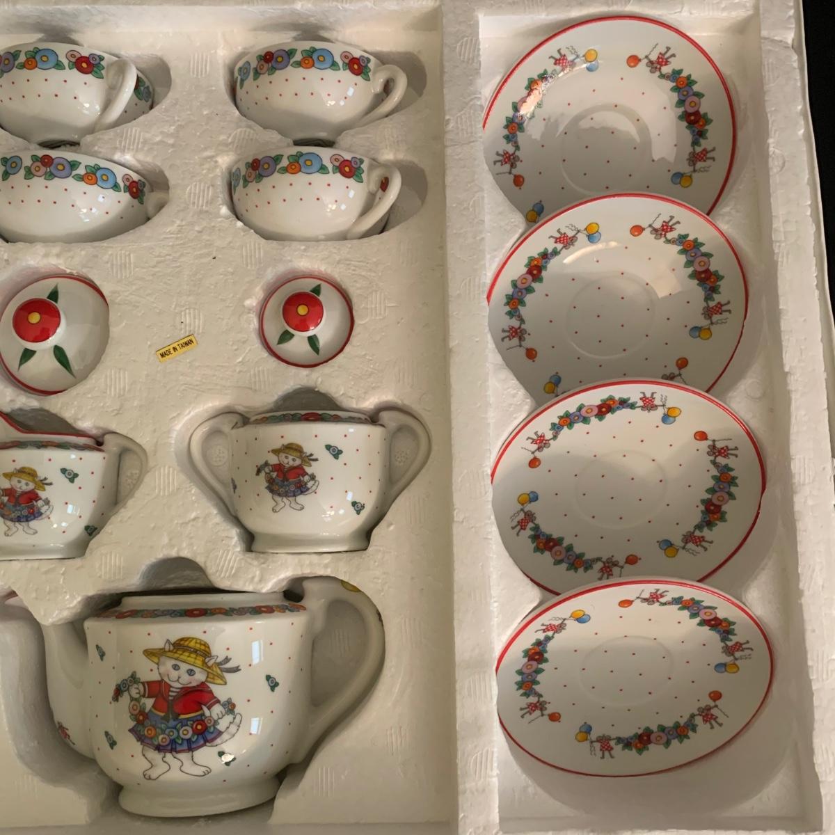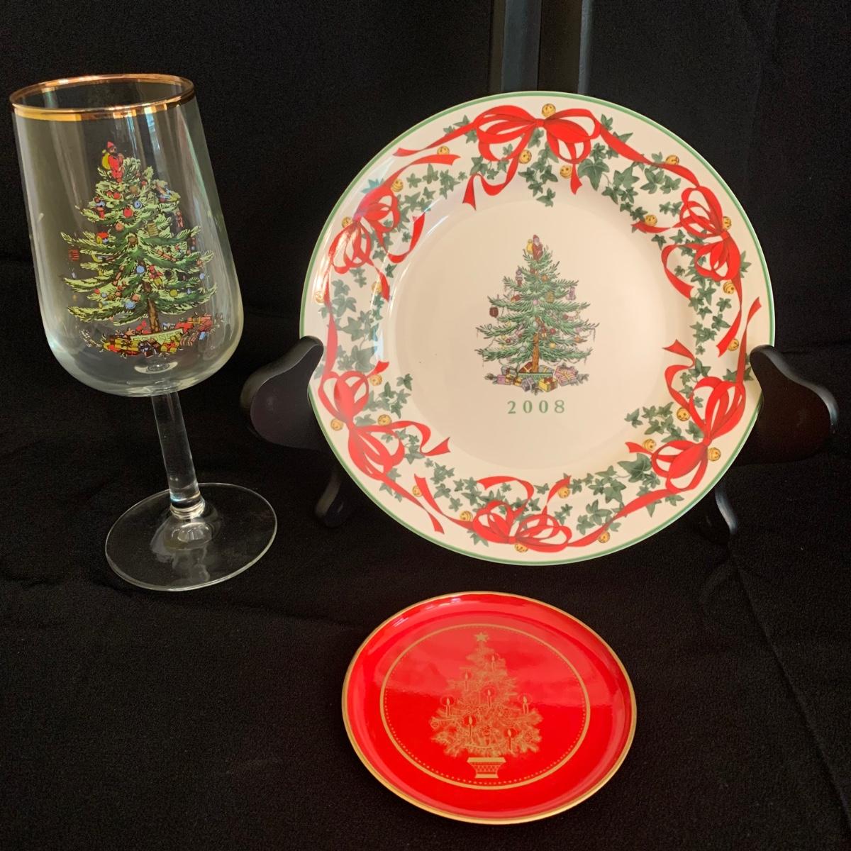 Spode Christmas Tree lot includes four wine glasses, four whiskey glasses, coaster set with six coasters, and Christmas 2008 plate. All items above feature the iconic Spode Christmas Tree design. Lot also includes Mary englebreit 18 piece children’s ceramic tea set. Spode 2008 plate measures, 7.75”D. Shipping available.