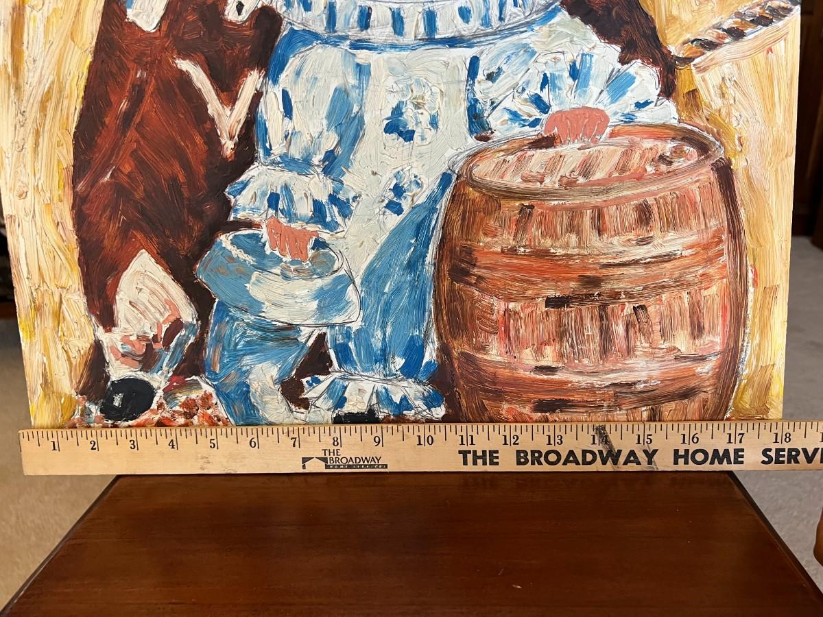There is no significant damage to the canvas or the paint and is in overall good collectible or displayable condition. Check pictures for more details and for sizing.