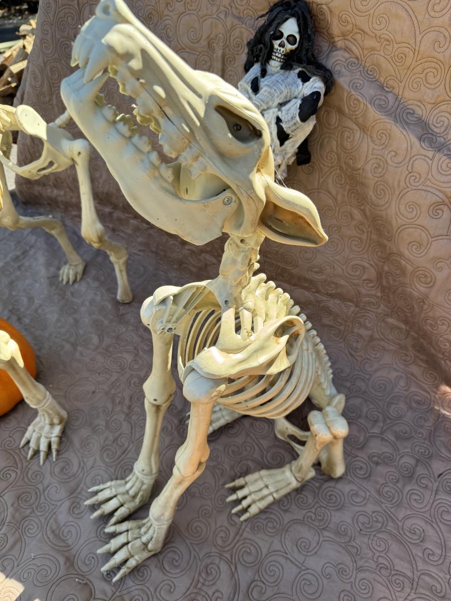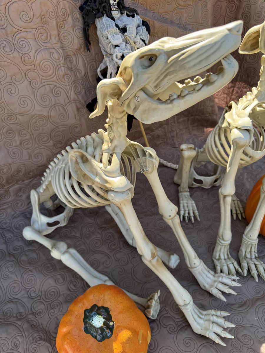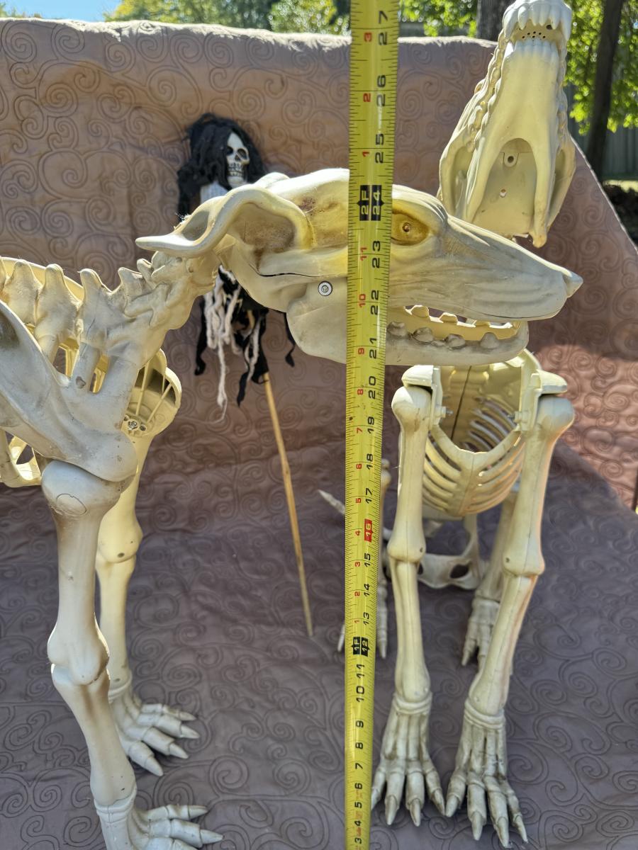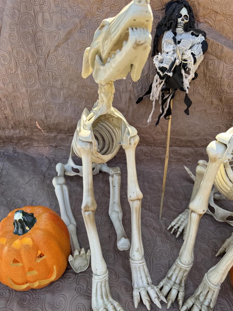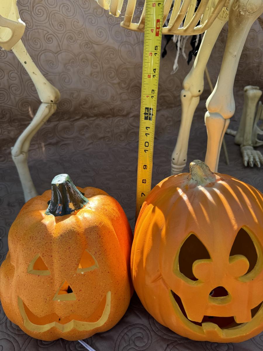 Buying as is, as found in this wonderful estate. See MANY PHOTOS for content, condition and dimensions. Never a Buyers Premiums or Credit Card Fee. All lots start at just $10 and sell with No Reserve to the highest bidder. Pumpkins light up and tested as shown in photos. Skeleton dogs are battery operated but not tested.
