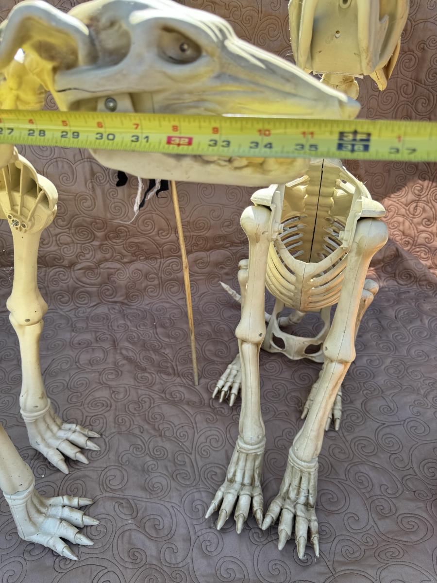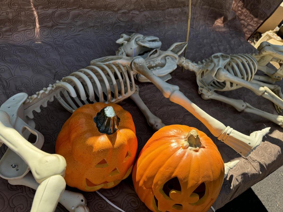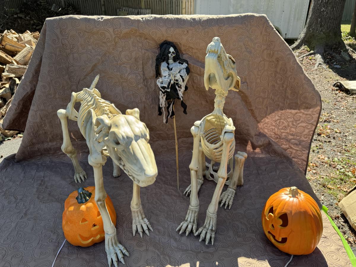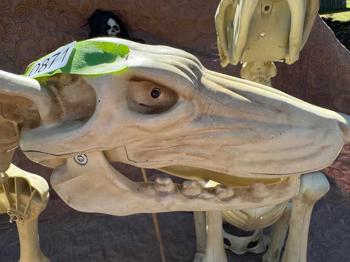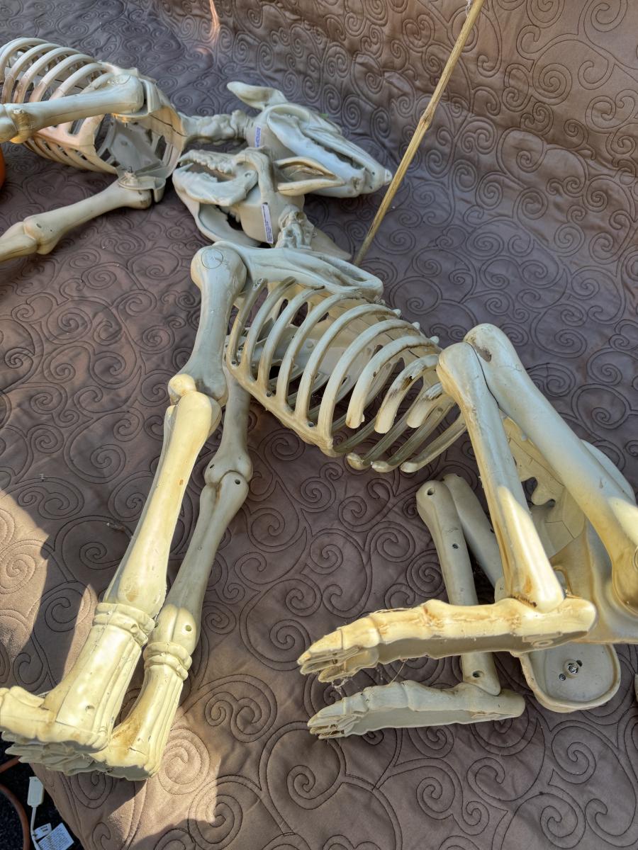 Buying as is, as found in this wonderful estate. See MANY PHOTOS for content, condition and dimensions. Never a Buyers Premiums or Credit Card Fee. All lots start at just $10 and sell with No Reserve to the highest bidder. Pumpkins light up and tested as shown in photos. Skeleton dogs are battery operated but not tested.