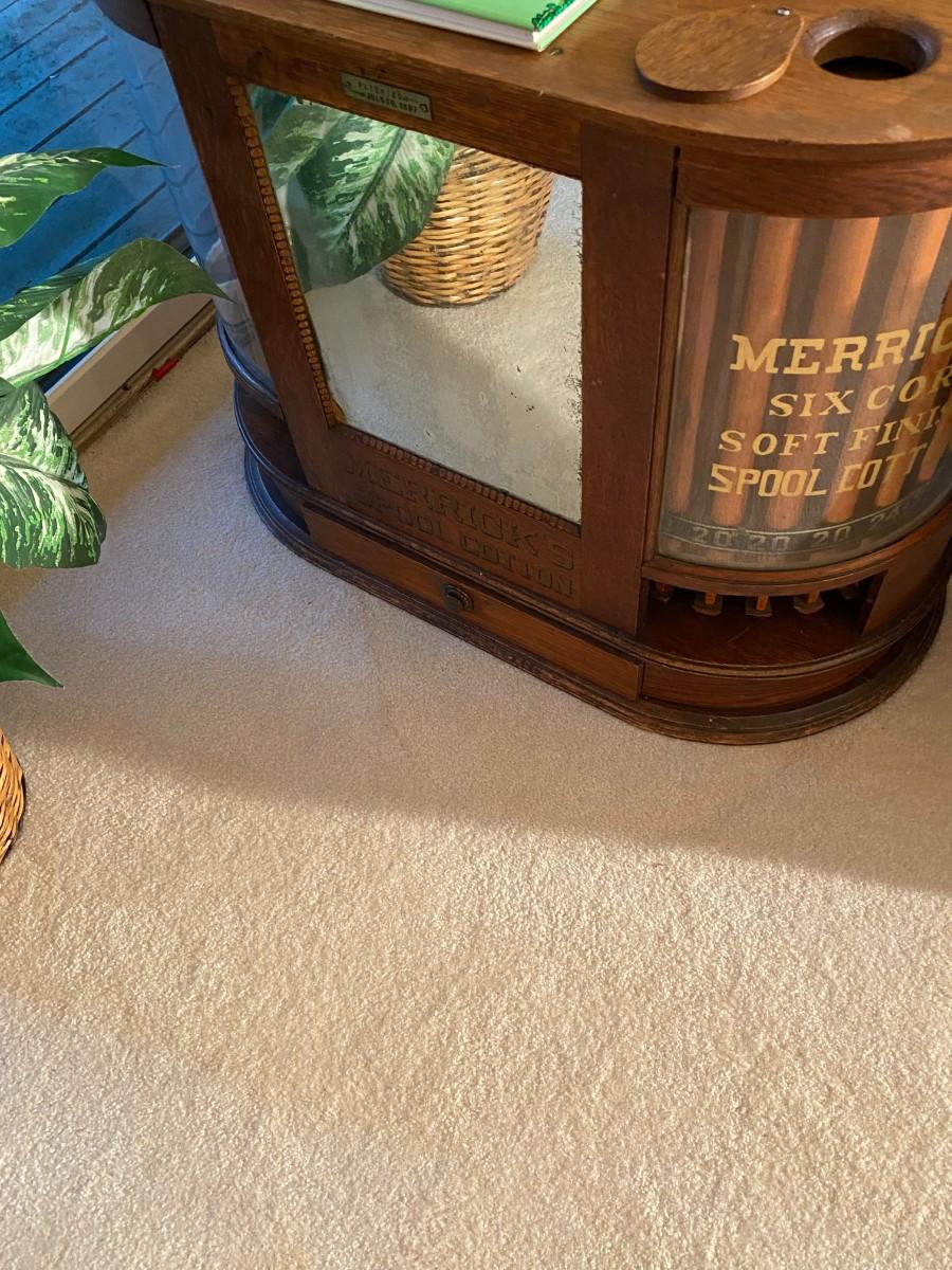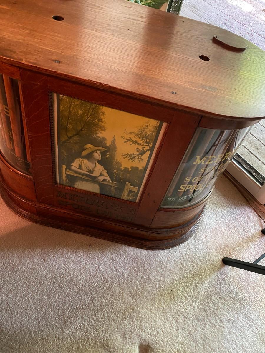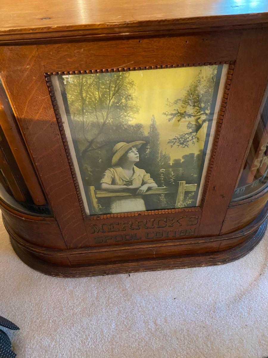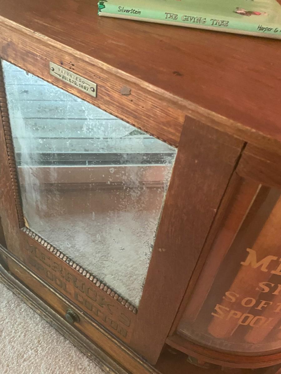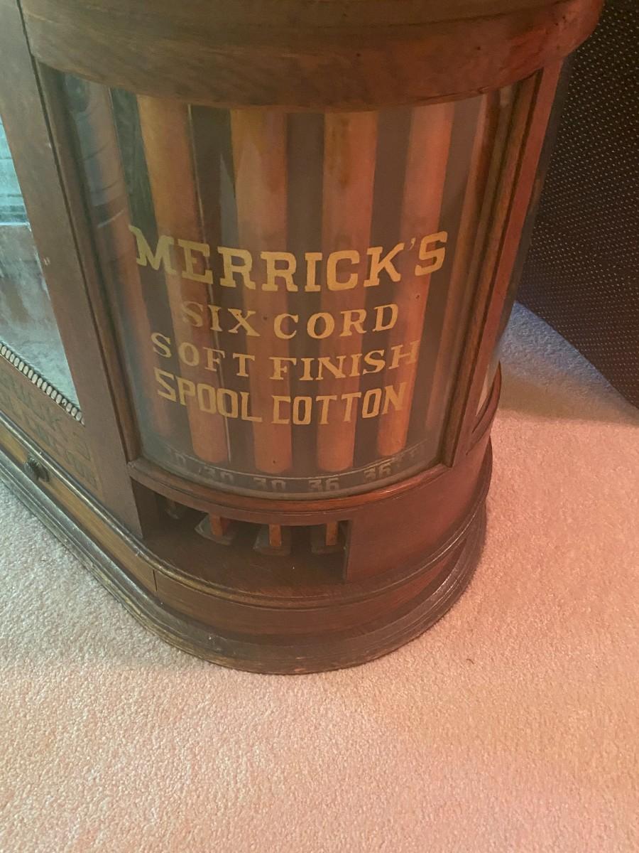 Merrick spool cabinet 17 1/2 x 31 1/2 x 24 1/4 with two revolving dispensers behind curved glass having reverse gilt lettering, mirrored sides and a storage drawer. Excellent condition except on one side glass has been replaced with plexiglass.