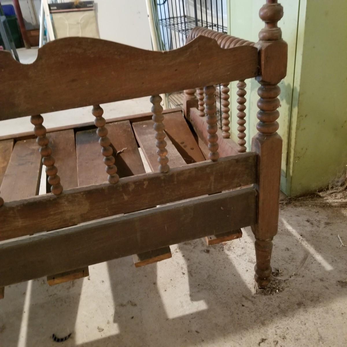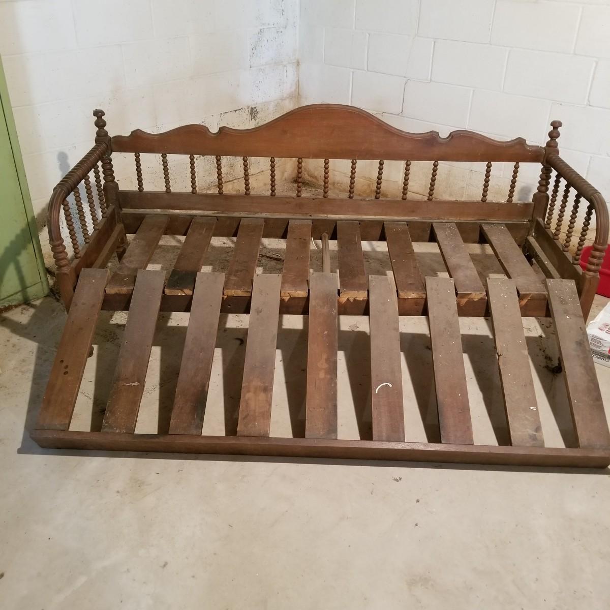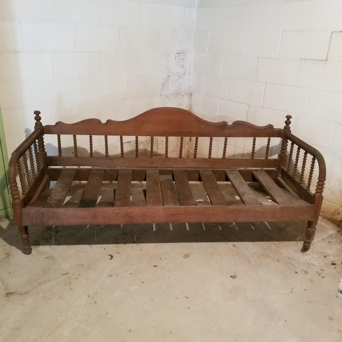 Solid wood seat frame has turned spindles and caster feet, missing one front caster. Piece measures 75" x 26" x 31", seat height is 13.5". No cushion included. Missing one spindle in back, see photos for details. It also appears that a bracing piece on the bottom of the pullout is missing that would allow the daybed to be secure when extended. Local pickup only. Winning bidder will need to bring assistance to move and load.