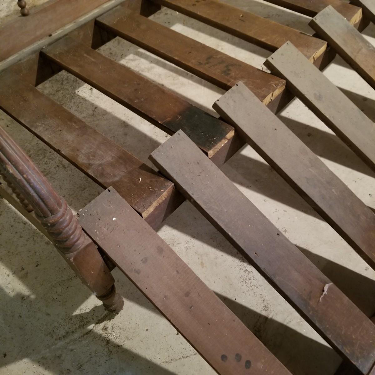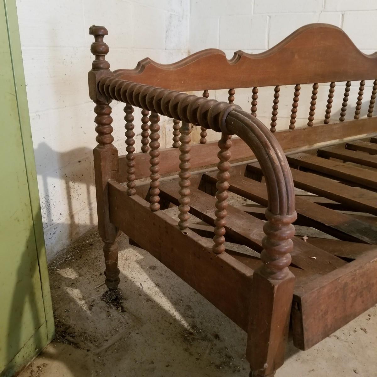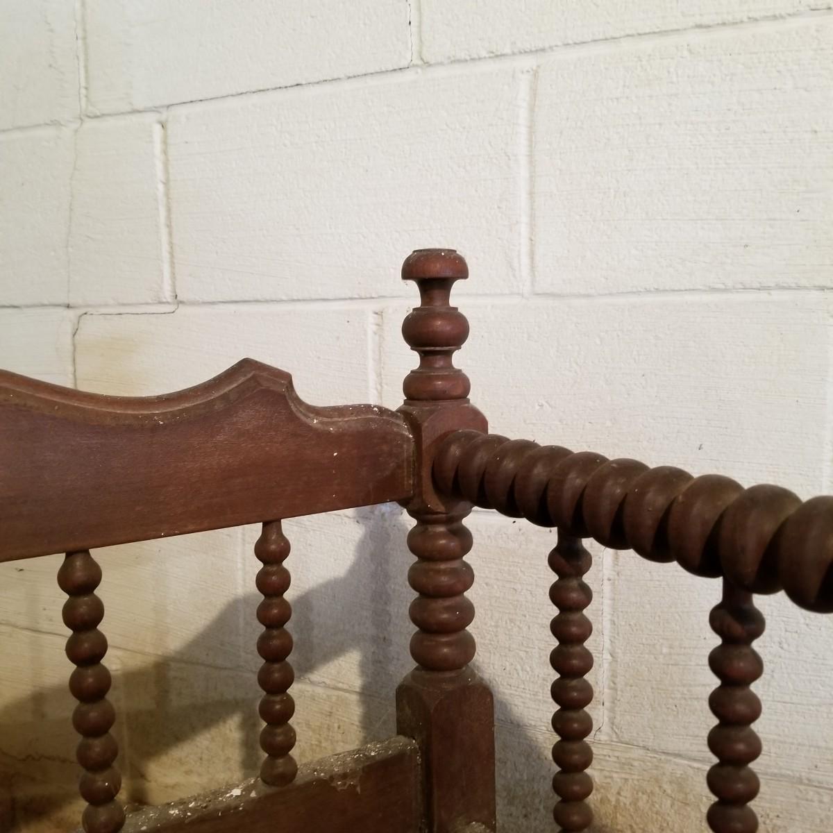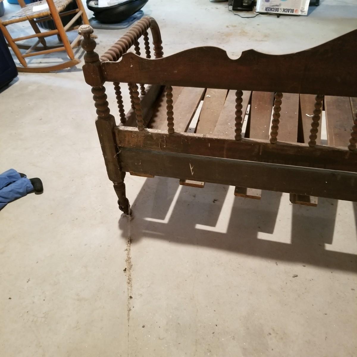 Solid wood seat frame has turned spindles and caster feet, missing one front caster. Piece measures 75" x 26" x 31", seat height is 13.5". No cushion included. Missing one spindle in back, see photos for details. It also appears that a bracing piece on the bottom of the pullout is missing that would allow the daybed to be secure when extended. Local pickup only. Winning bidder will need to bring assistance to move and load.