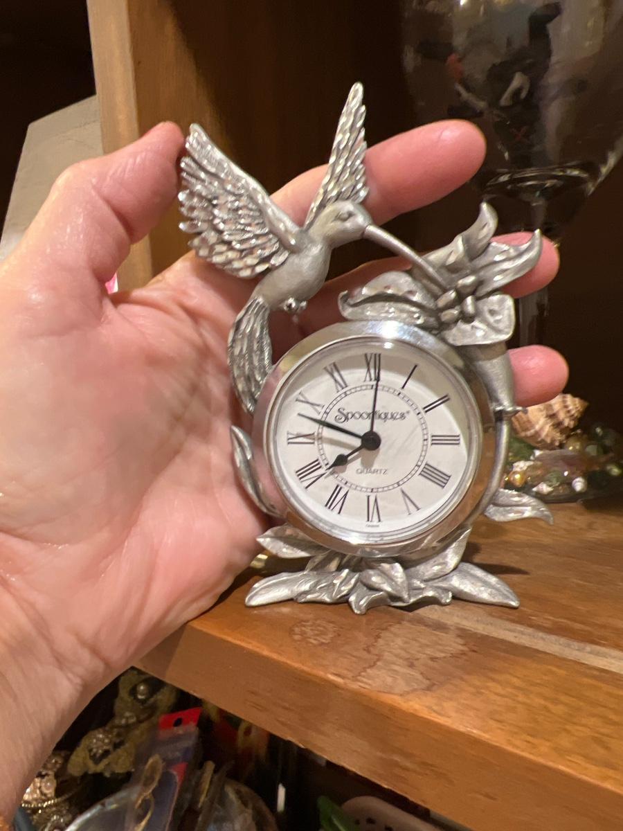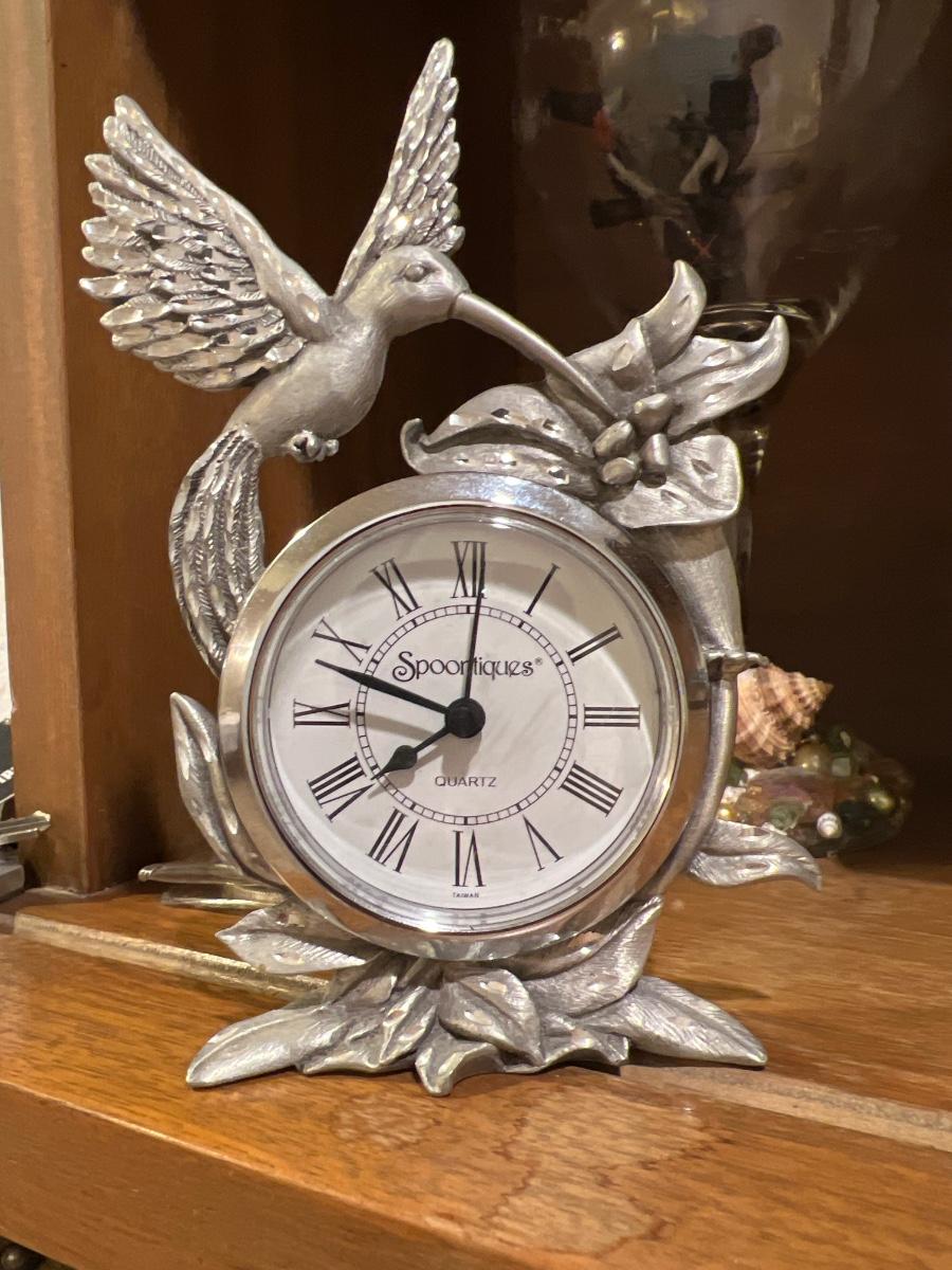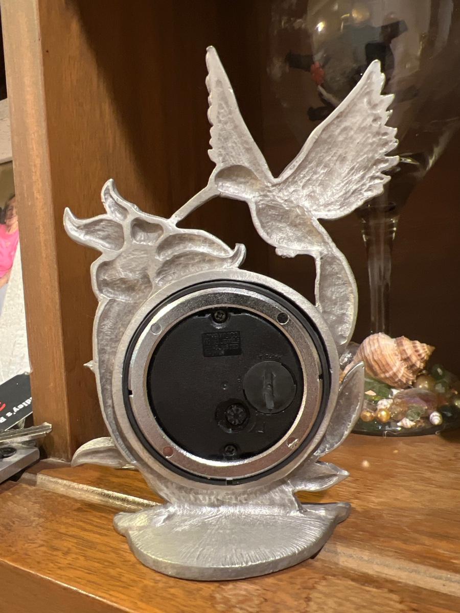 Needs batteries. Spoontiques pewter hummingbird decorative clock.