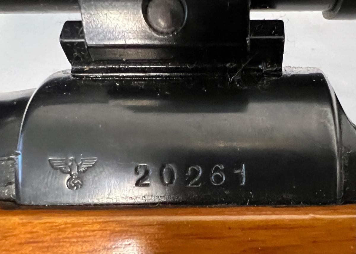 Has Nazi Eagle. Appears to be sporterized. Has a Lyman scope. Does not have matching numbers. Caliber is unknown. Serial number is 20261. Not tested. [KA]