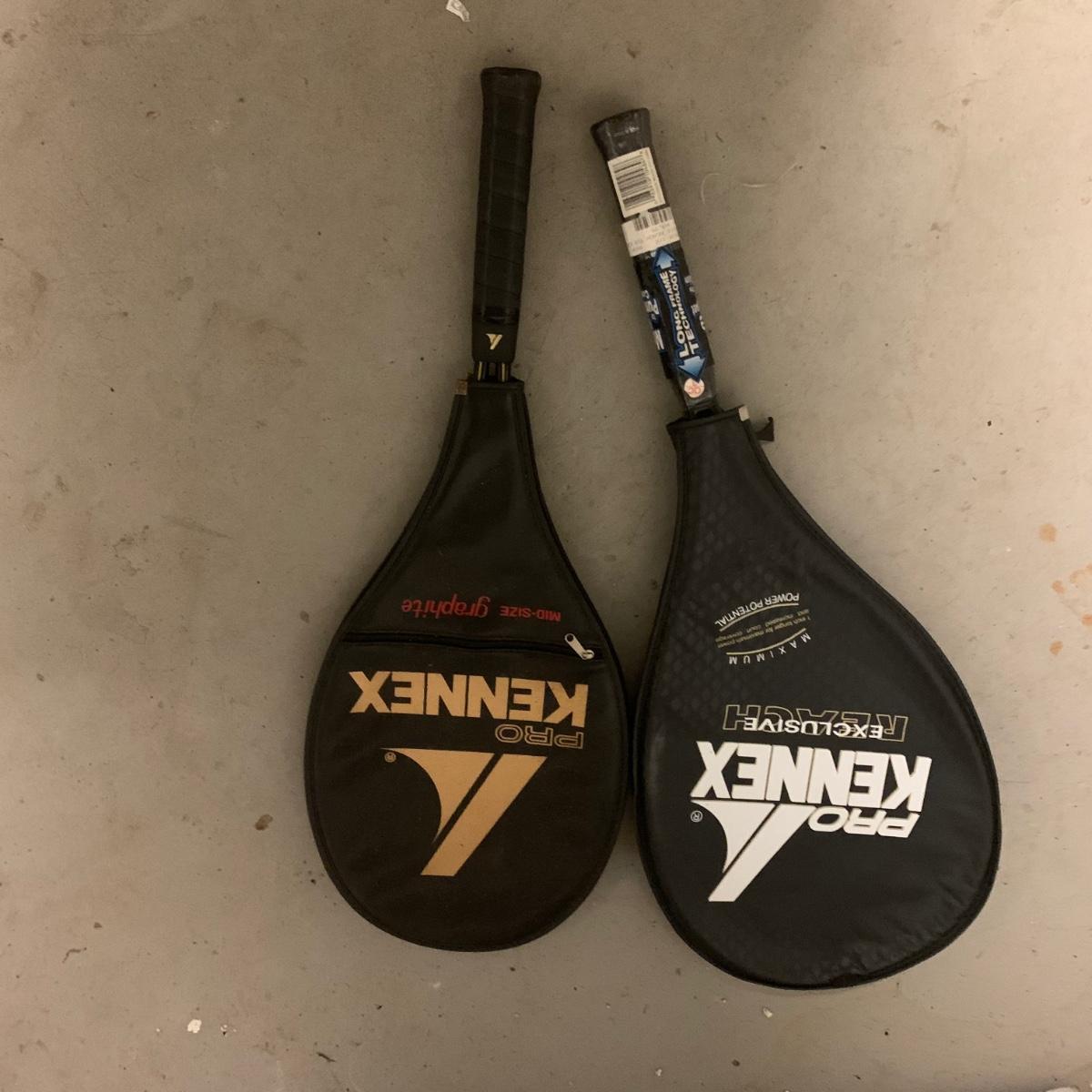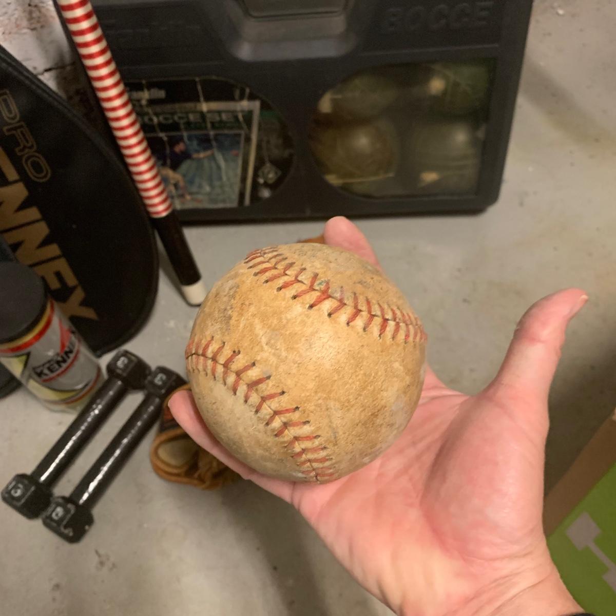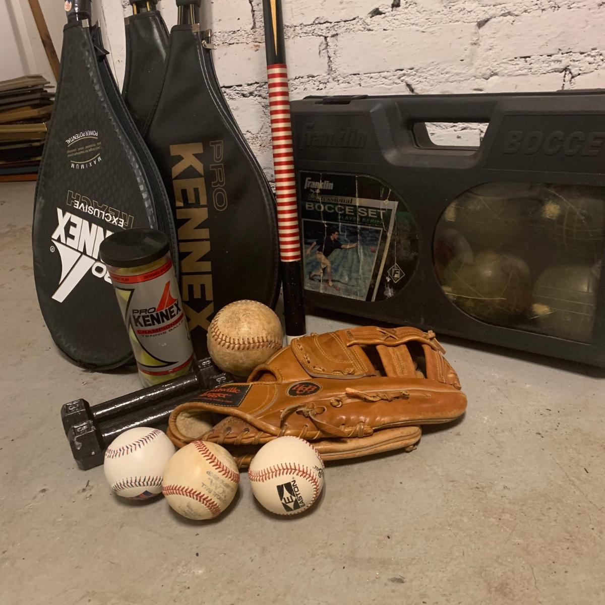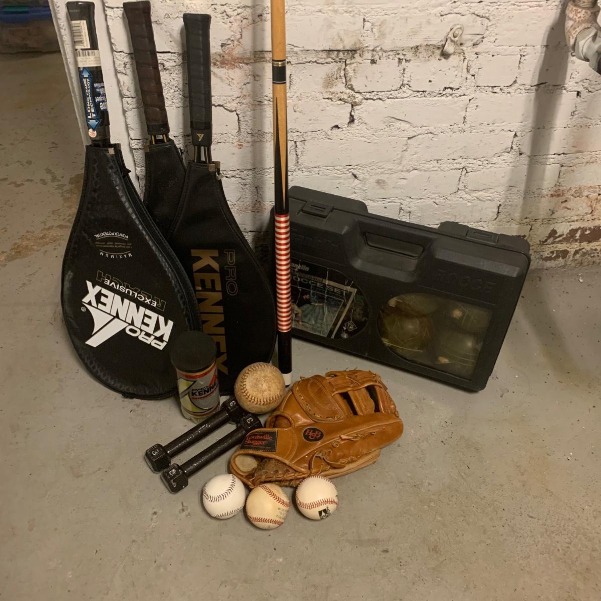 This Lot includes three 9” baseballs in good condition, a softball, one field glove and pool stick in used condition. There are also TWO tennis racquets by Kennex (cover photo shows three but one was broken). One is new with price still on it. There is also a pack of unopened tennis balls, a bocci ball set and 3lb. Pair of metal weights. Local pick up only.