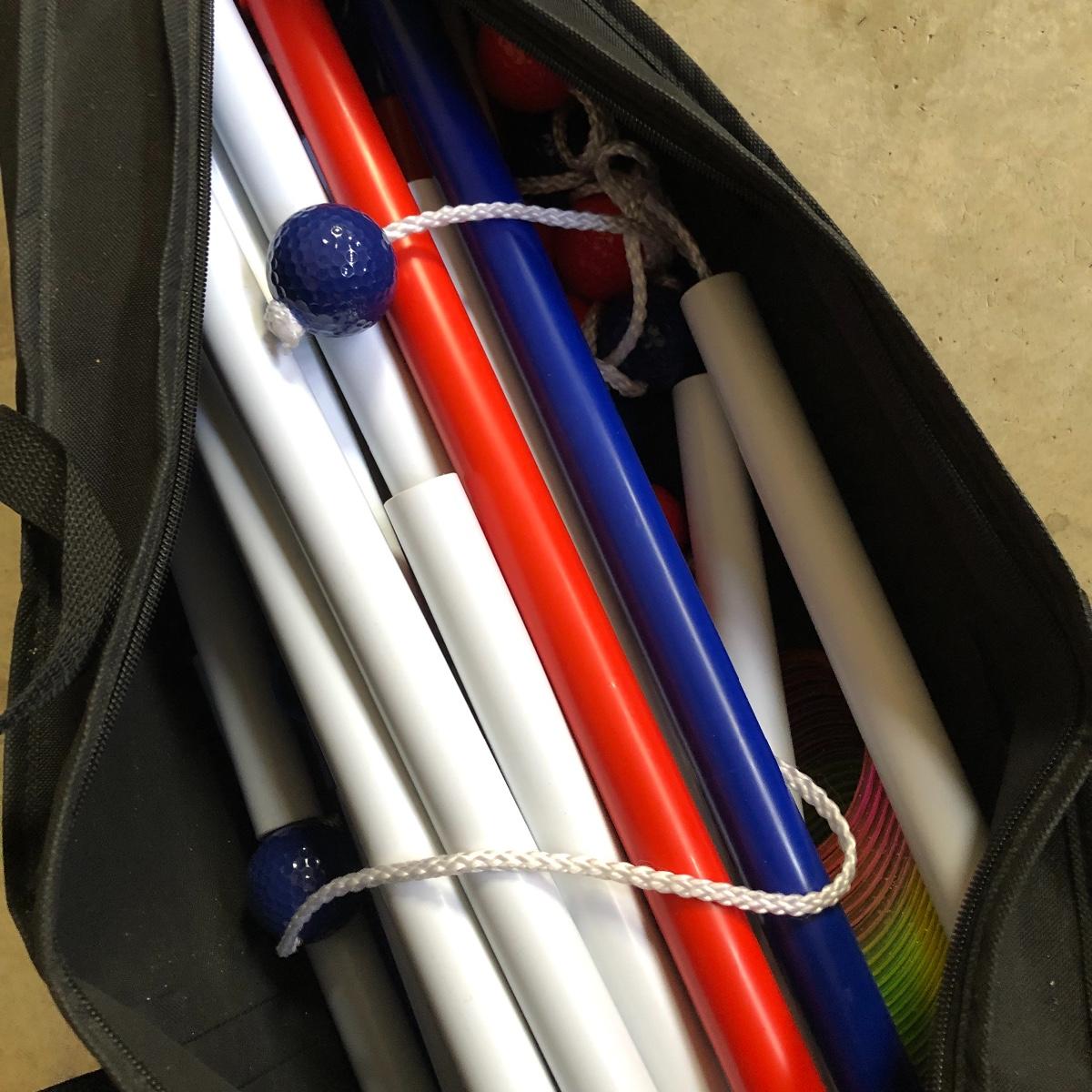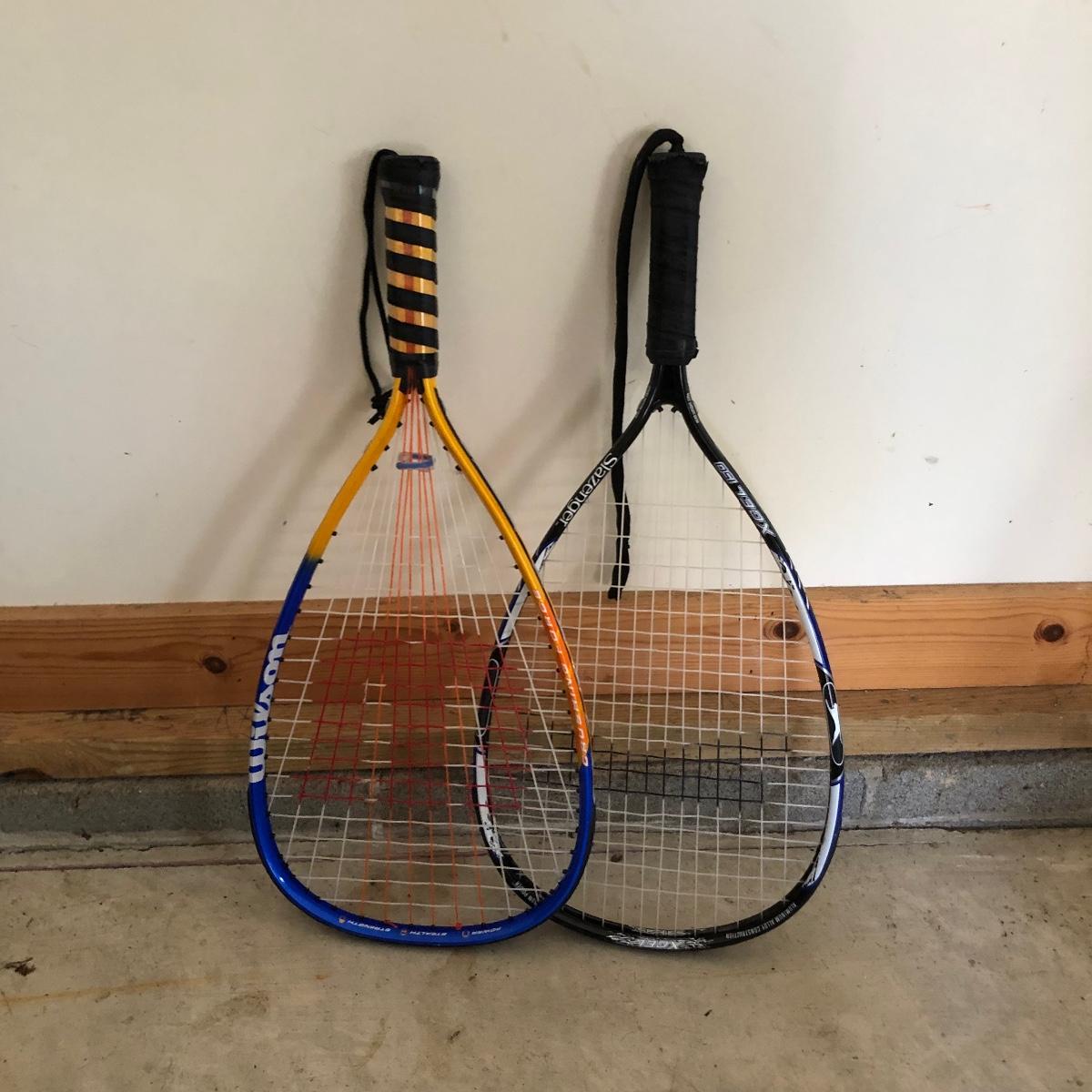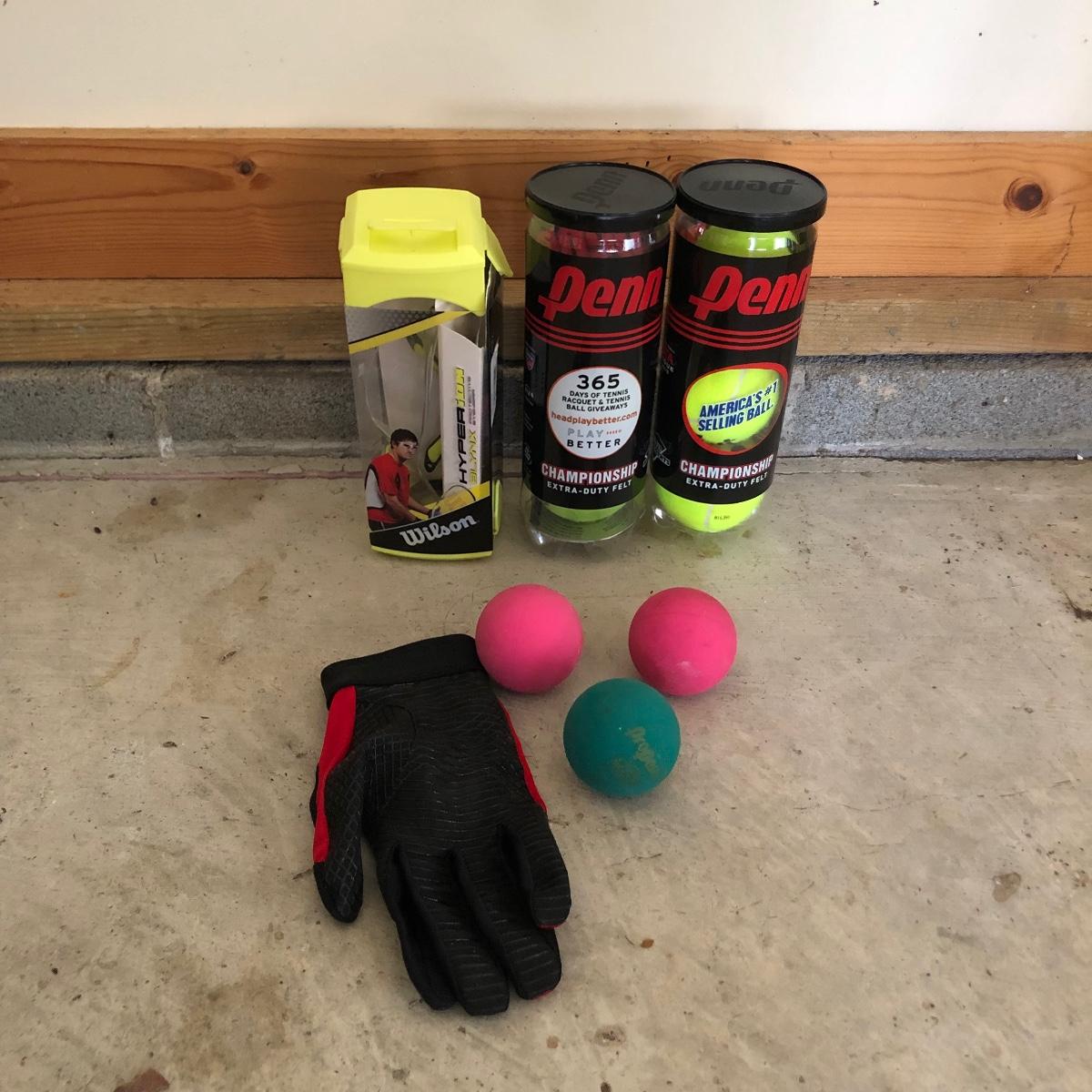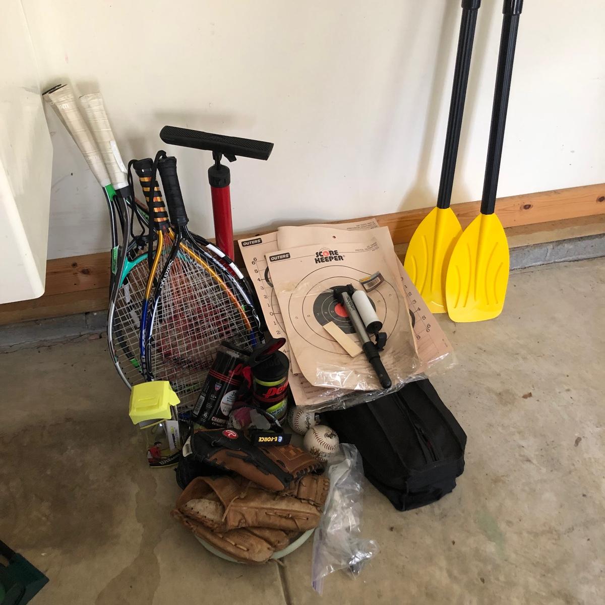 Lot includes a ladder toss bolo game in storage bag, three tennis rackets, two baseball gloves and balls, two plastic oars, two racket ball rackets and balls, Frisbee and more.