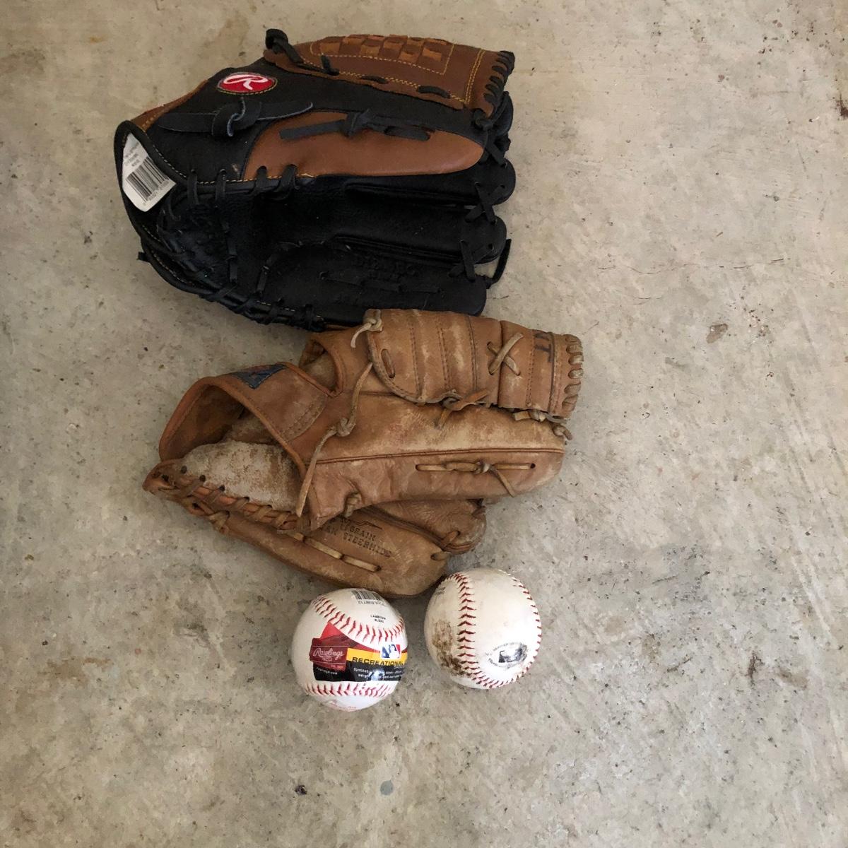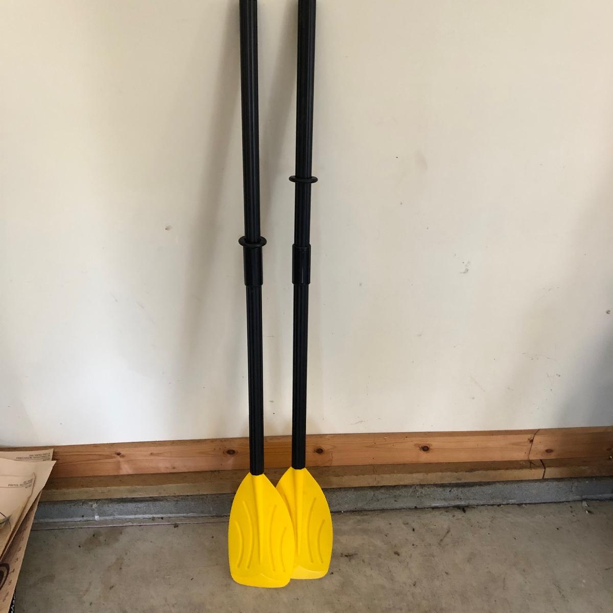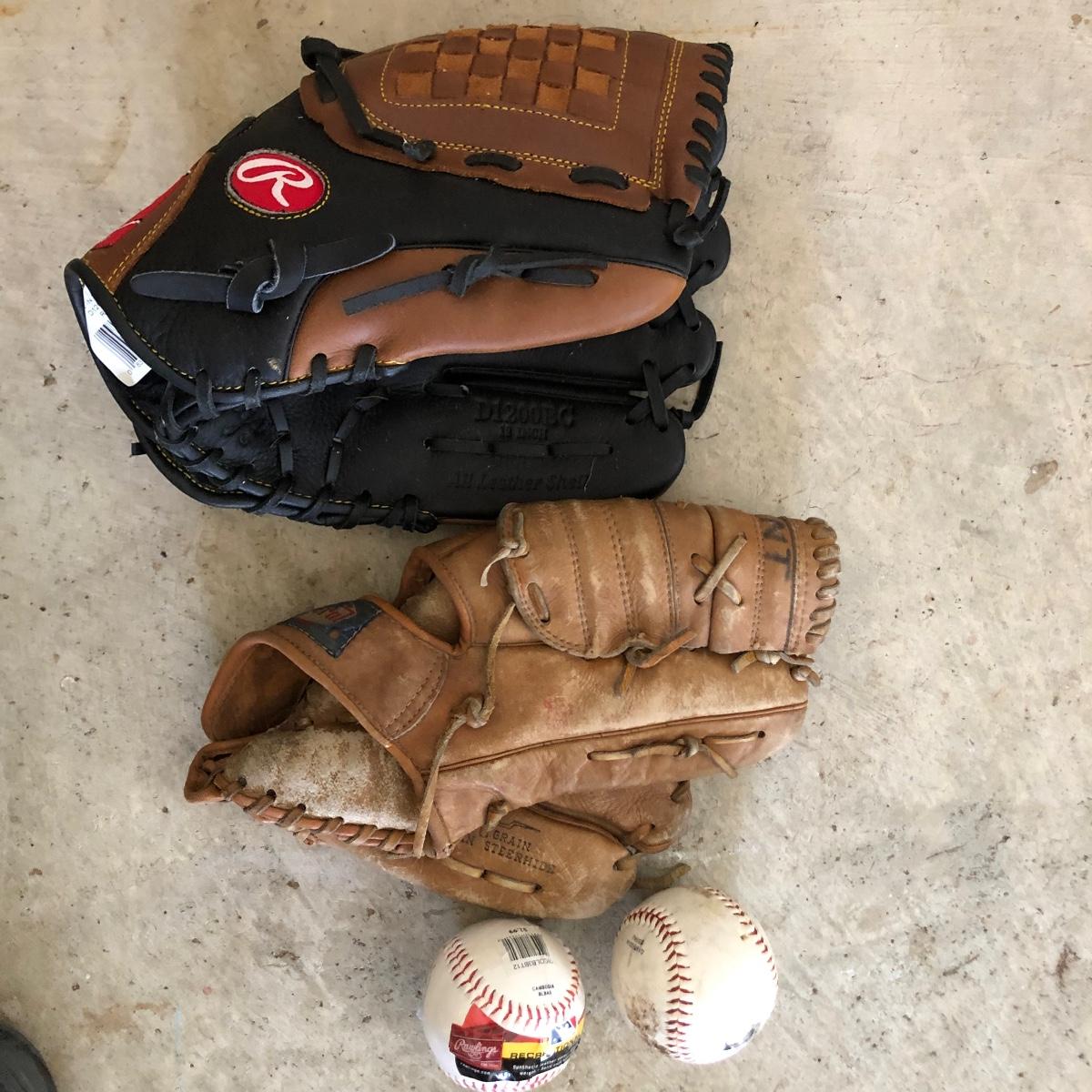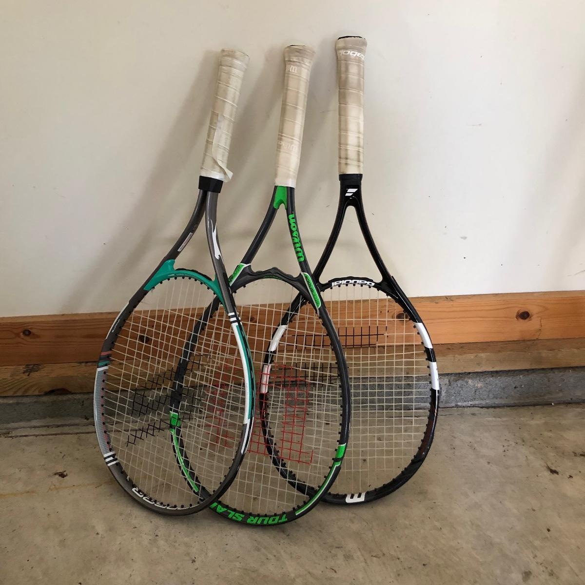 Lot includes a ladder toss bolo game in storage bag, three tennis rackets, two baseball gloves and balls, two plastic oars, two racket ball rackets and balls, Frisbee and more.