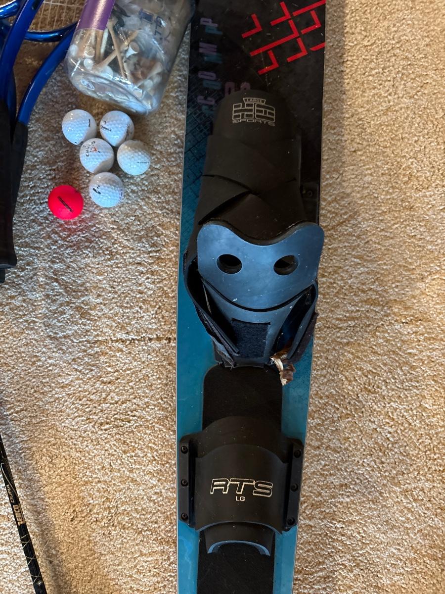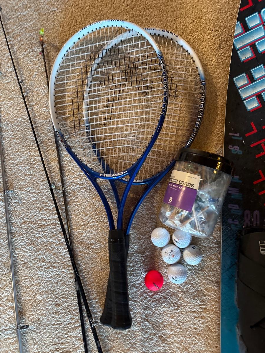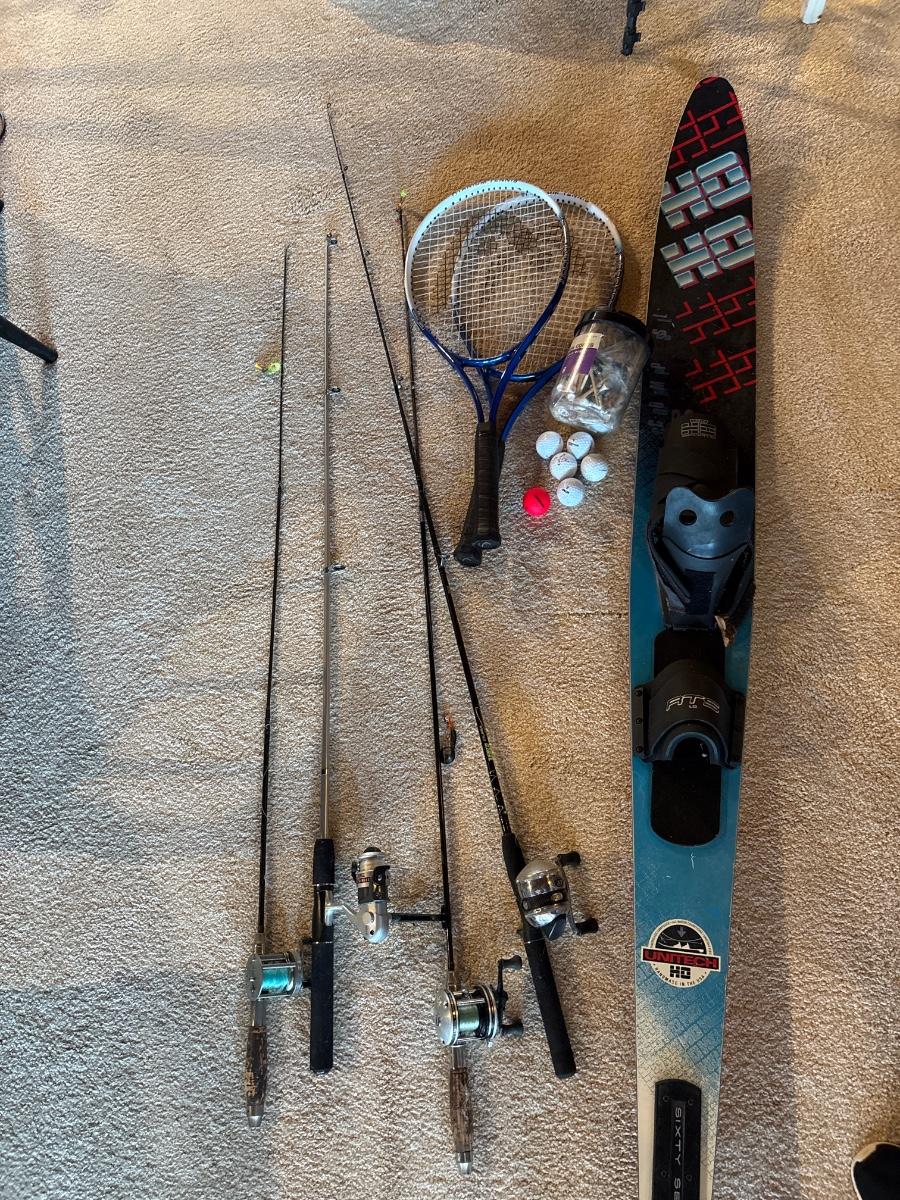 Fishing poles, tennis rackets, solid ski, golf balls, and tees