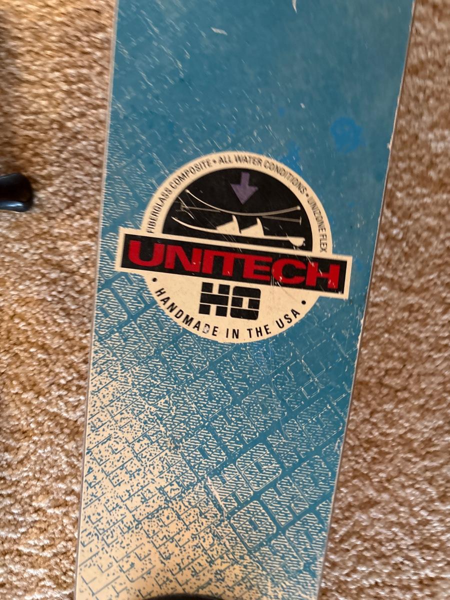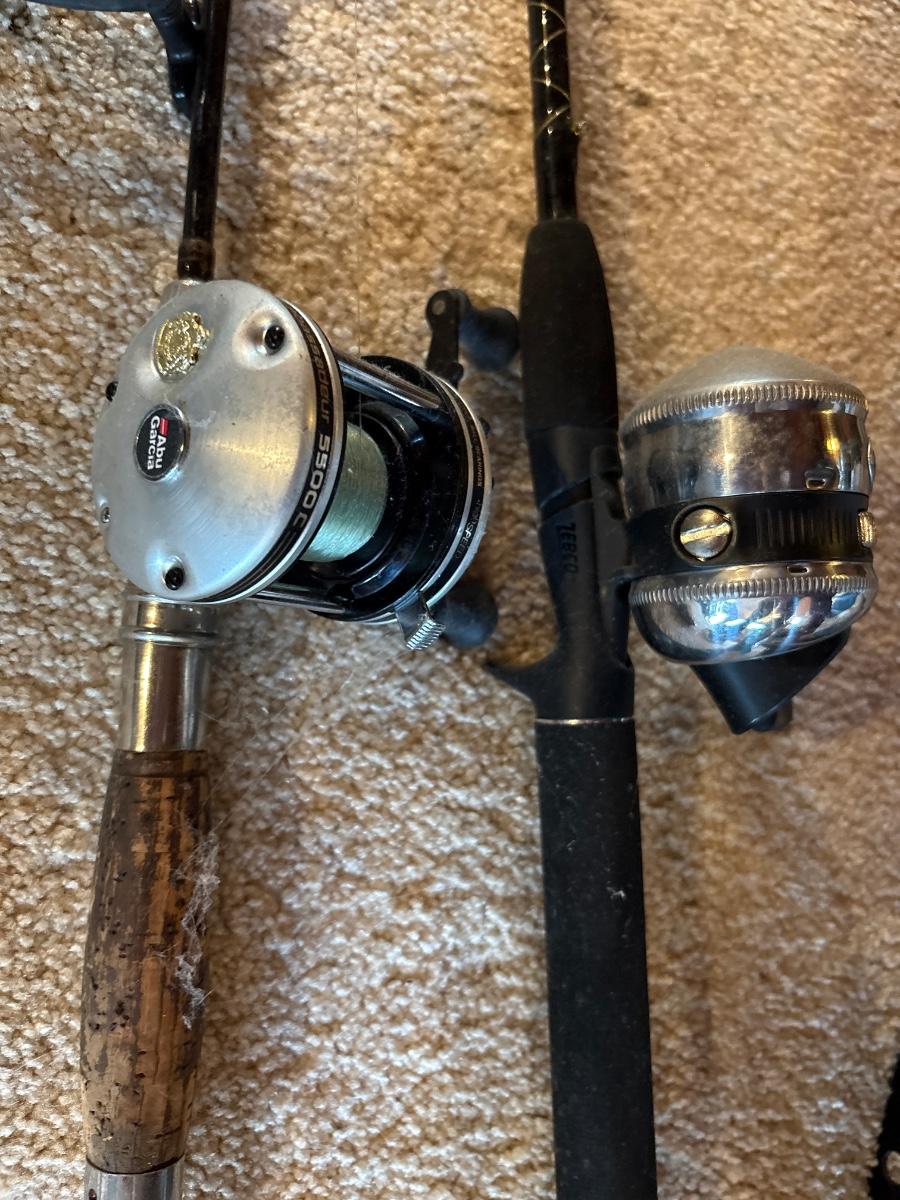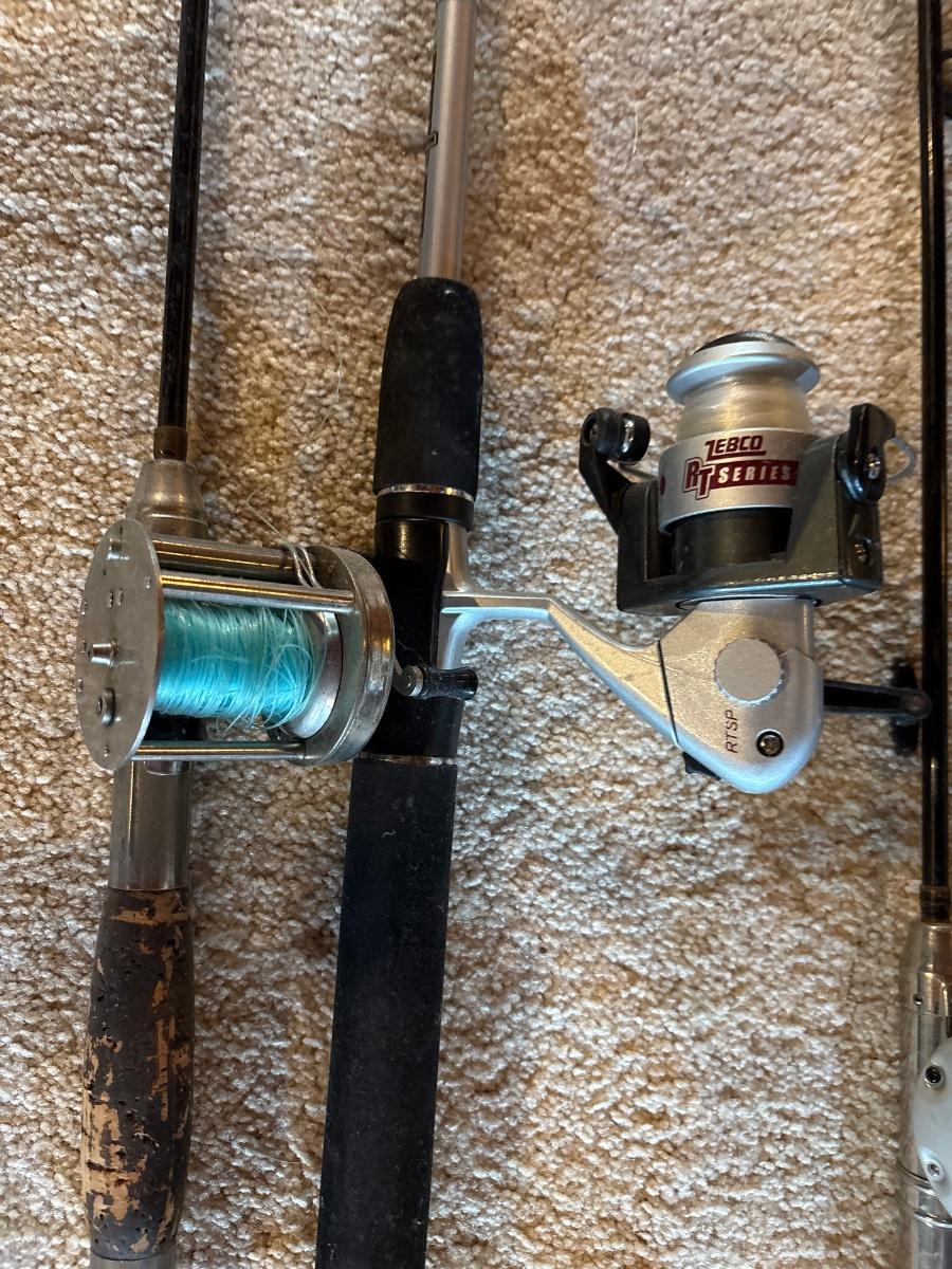 Fishing poles, tennis rackets, solid ski, golf balls, and tees