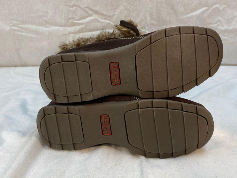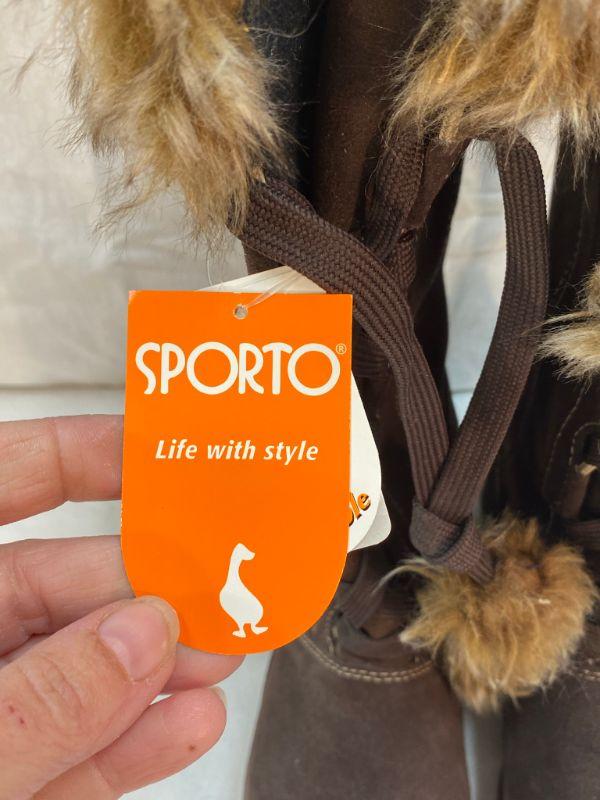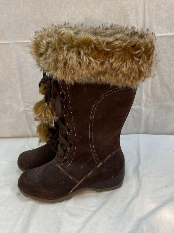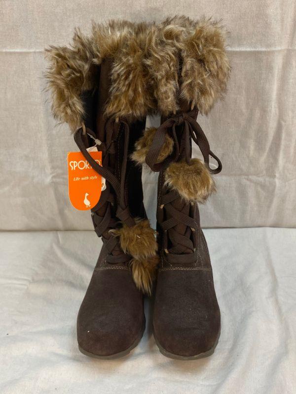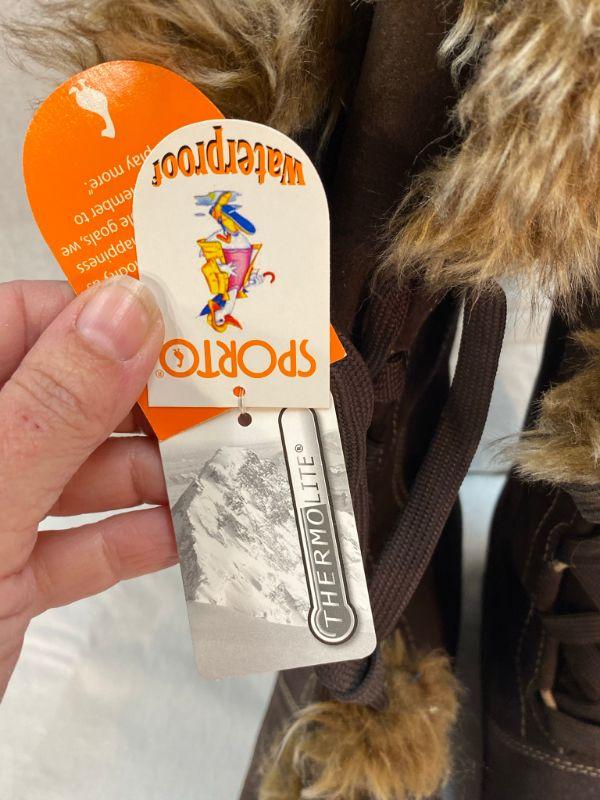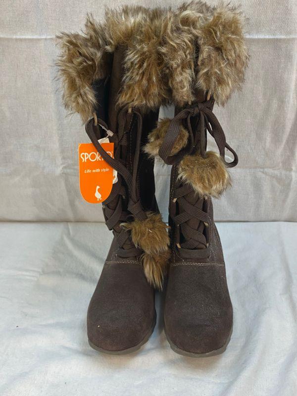 Sporto leather lace up snow boots. Dark brown with fur edge. Have original hang tags attached. Size 8.5. Good condition