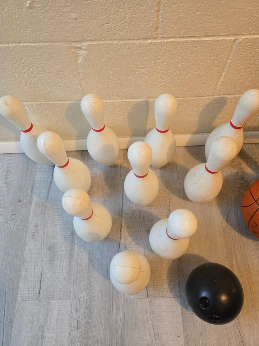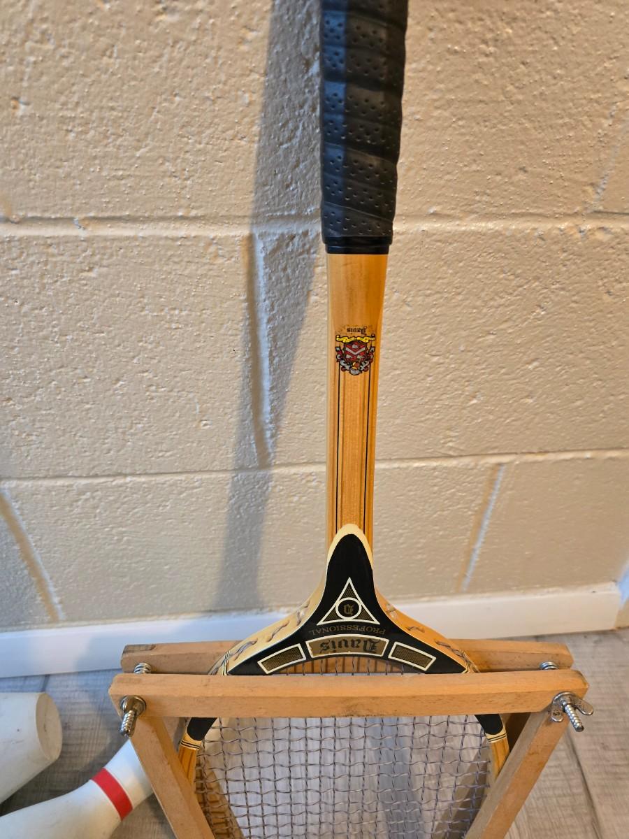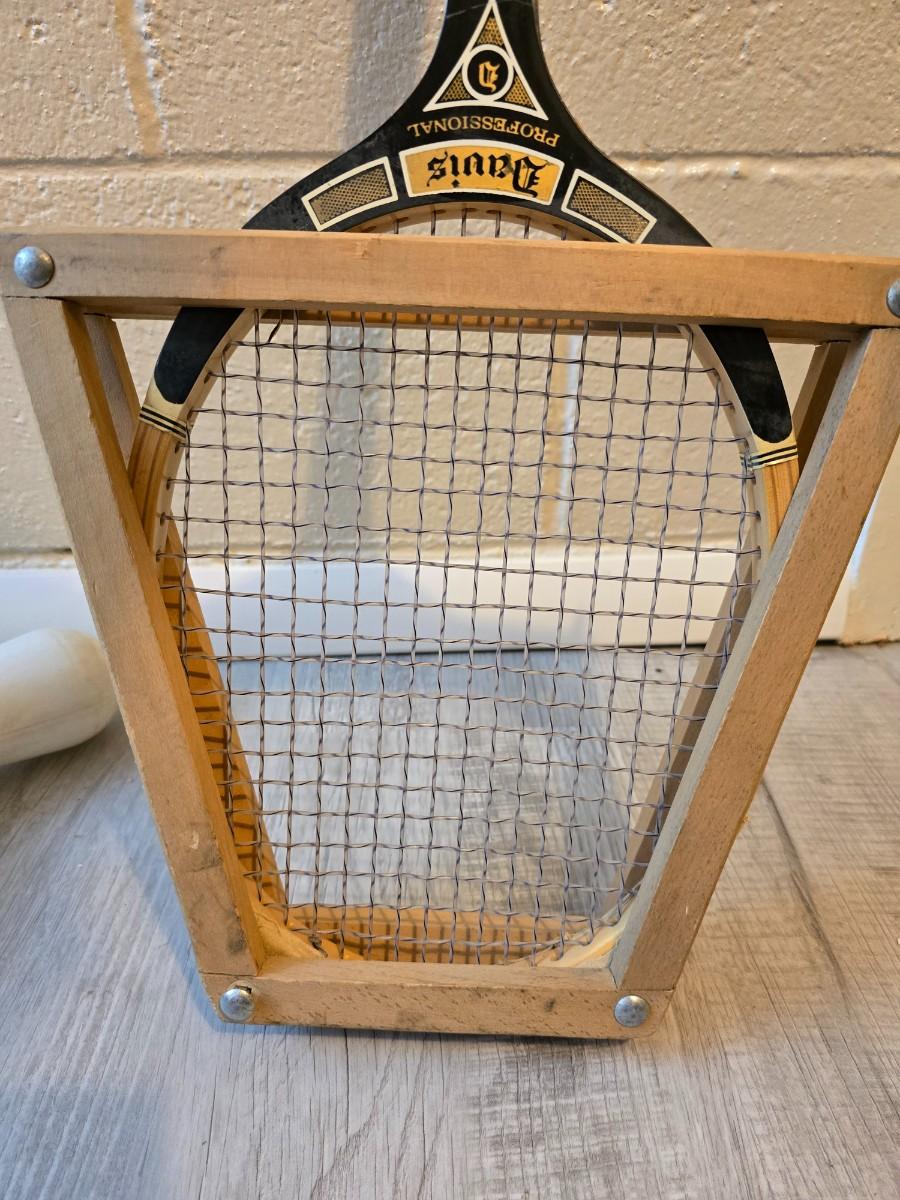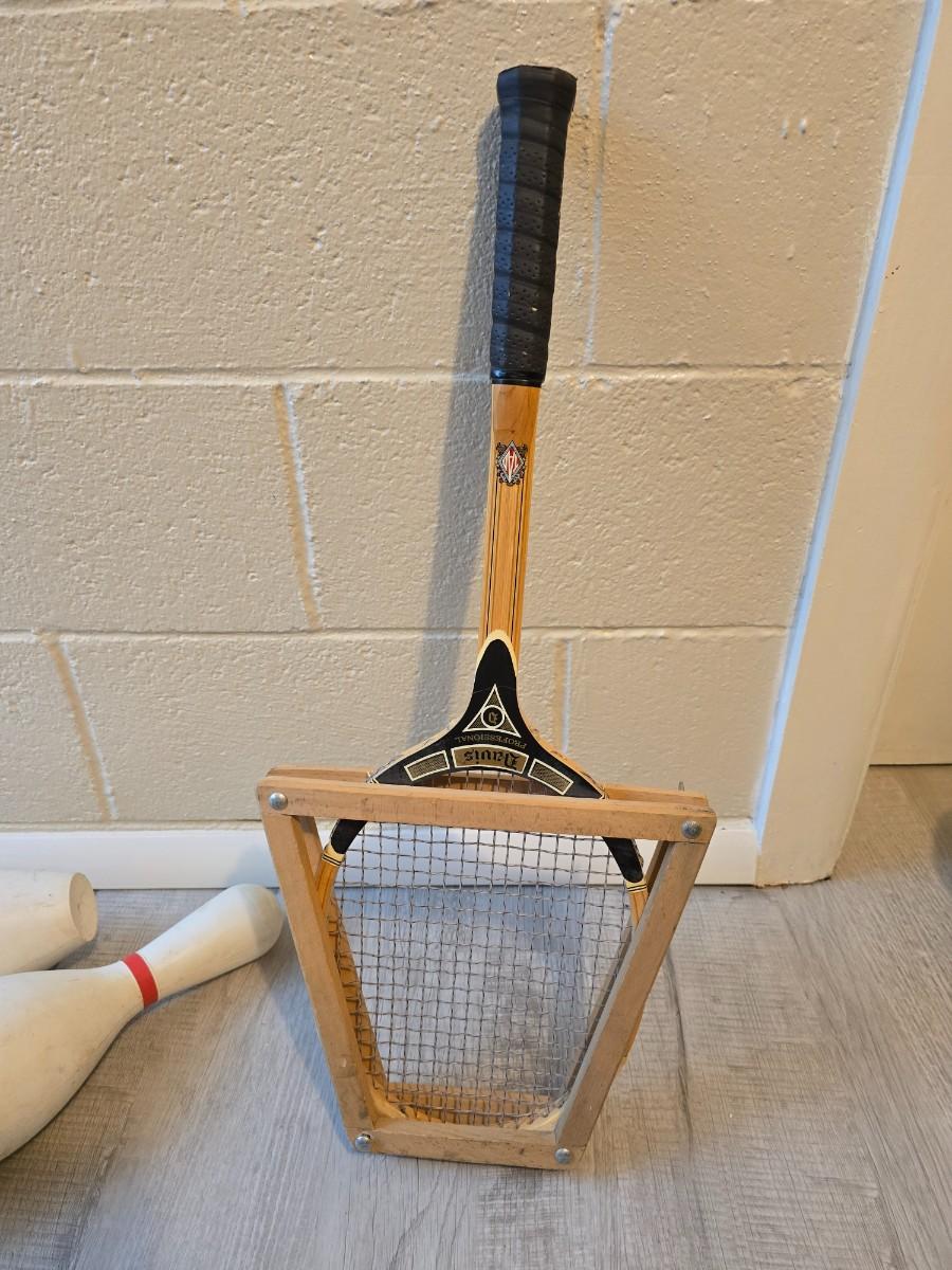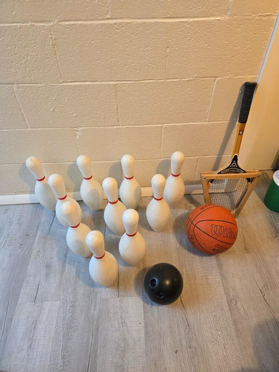 Sports are great fun! Basketball - plastic bowling pins with ball - Vintage T.A. Davis wooden tennis racket-Renewa Grip Exerciser Circular