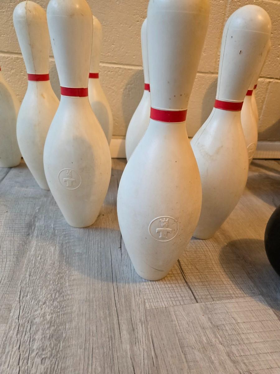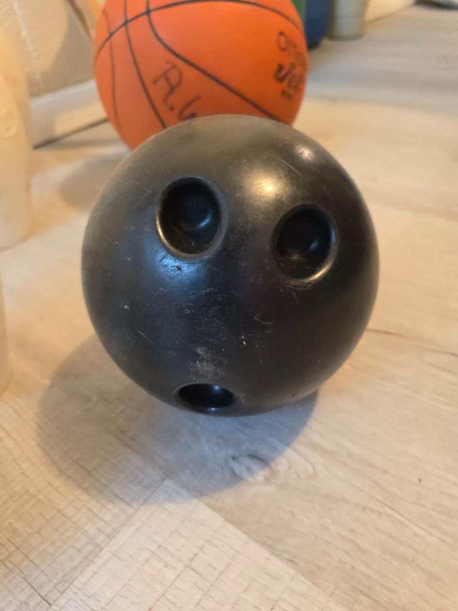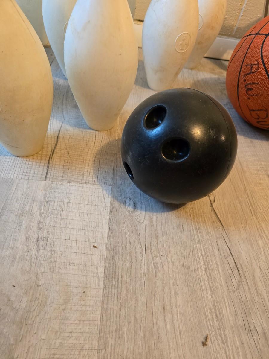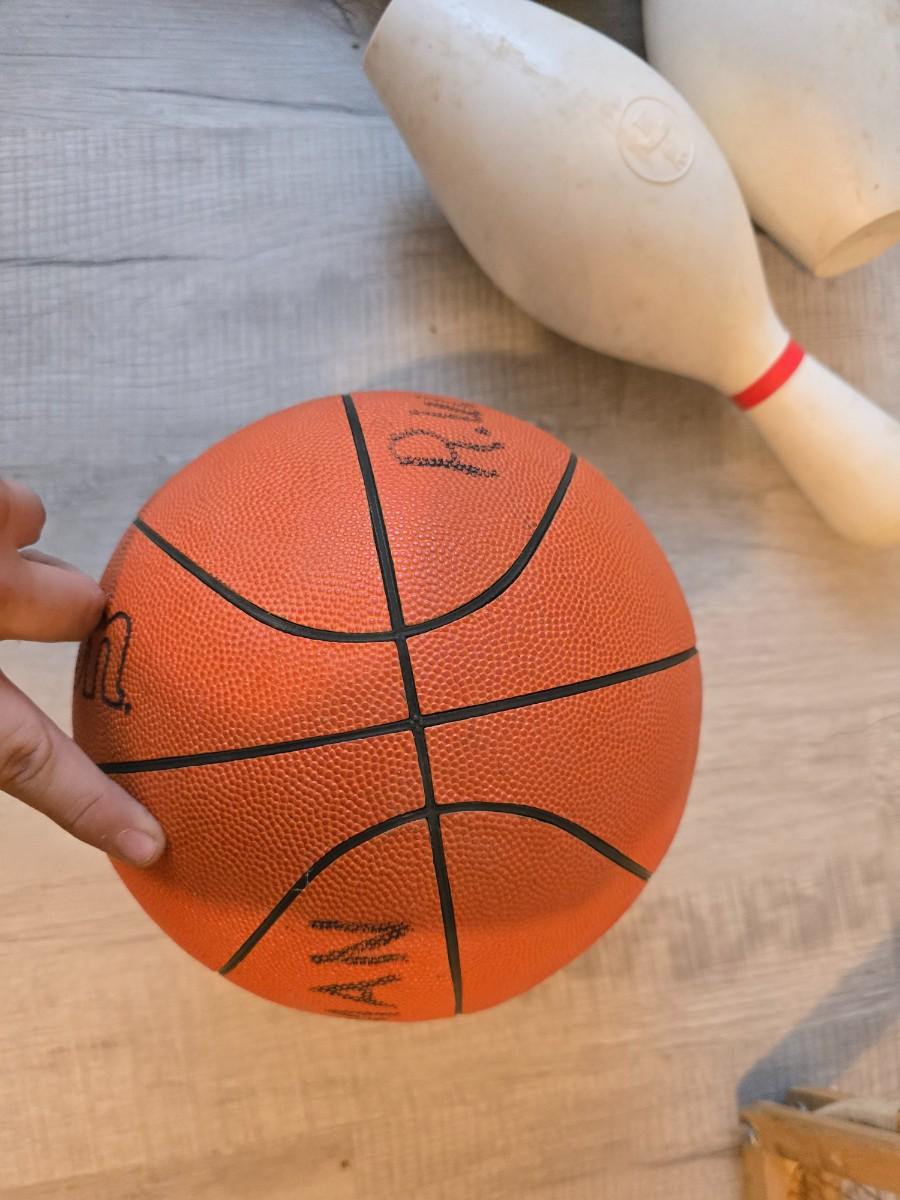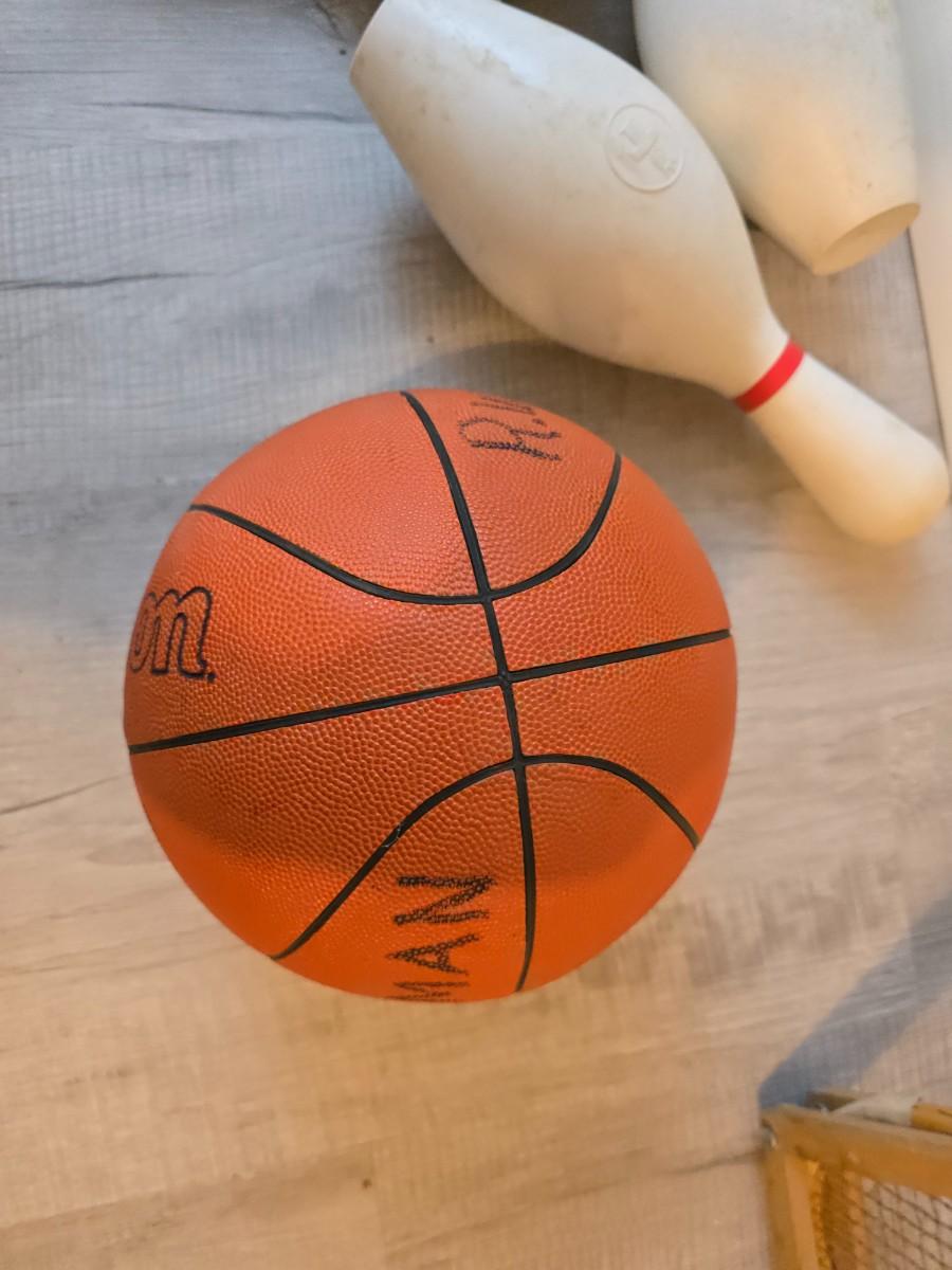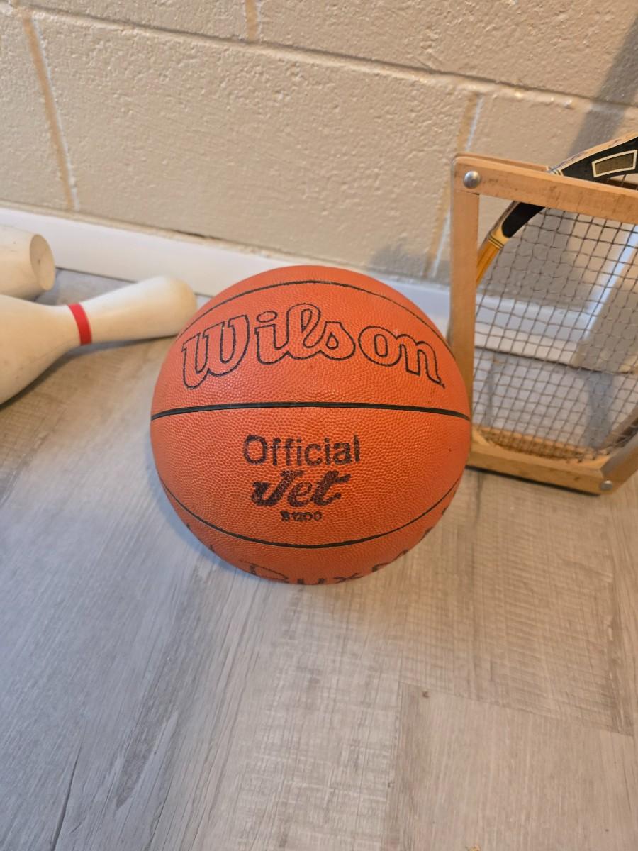 Sports are great fun! Basketball - plastic bowling pins with ball - Vintage T.A. Davis wooden tennis racket-Renewa Grip Exerciser Circular