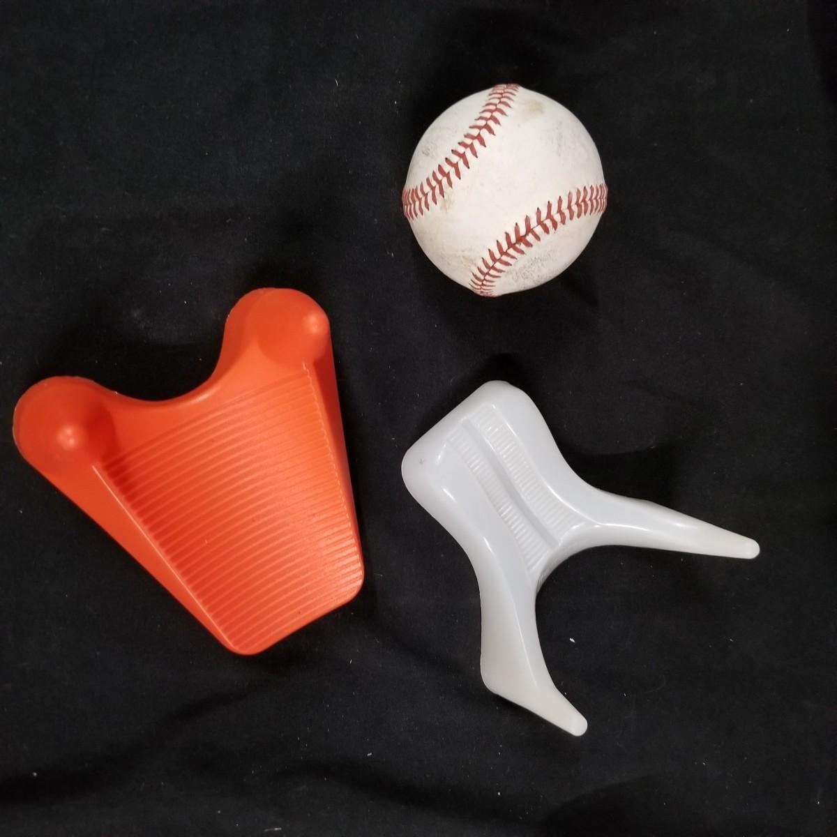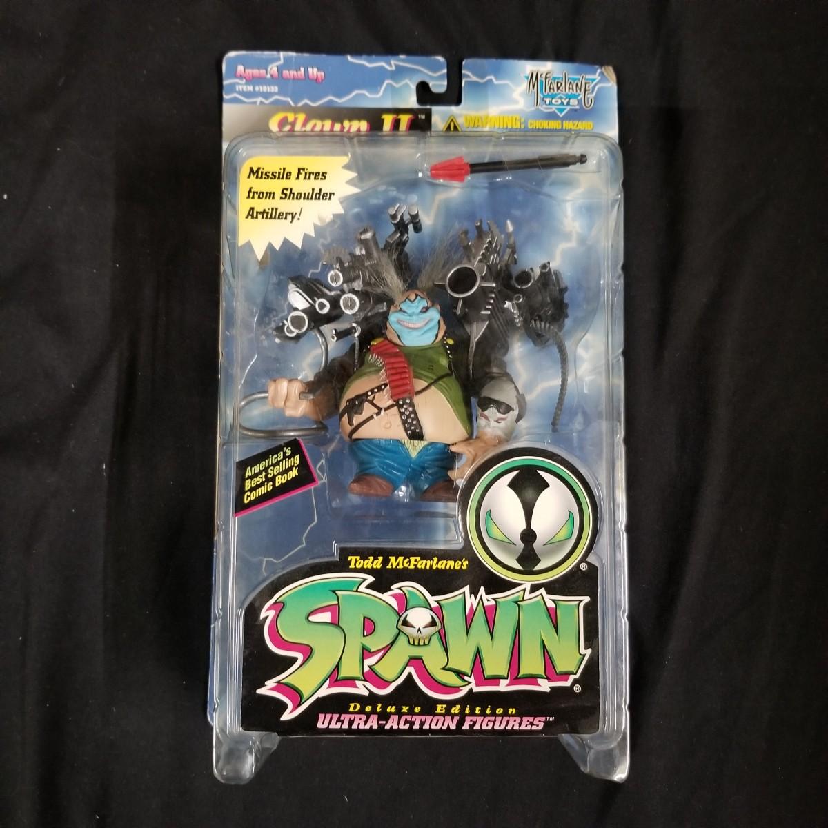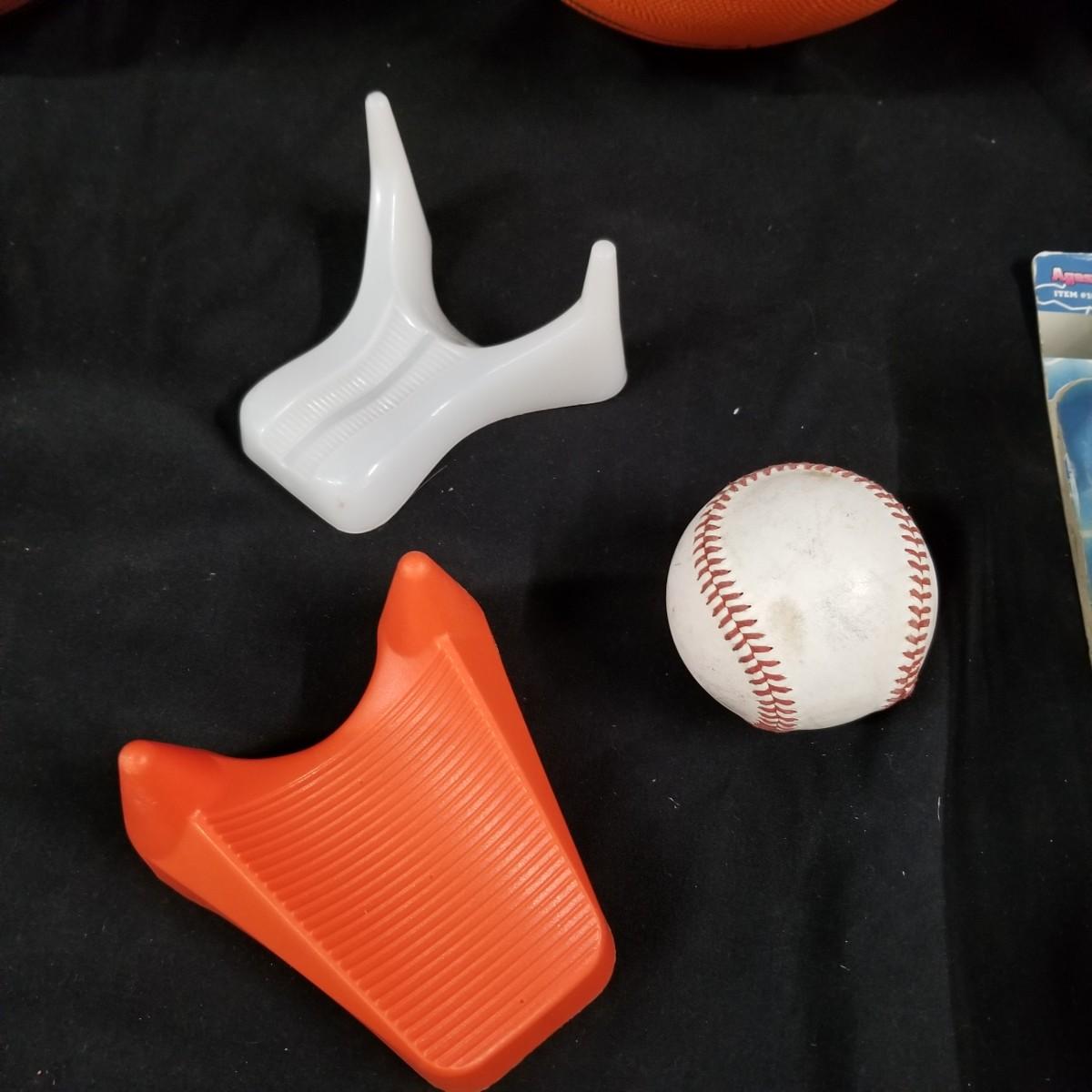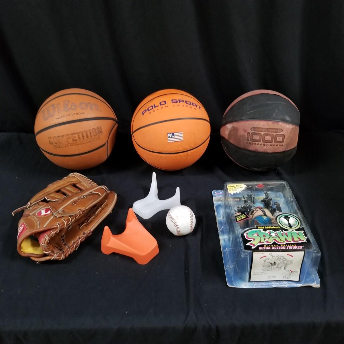 Three different basketballs, one Louisville Slugger baseball glove, a baseball,  two football tees and a Spawn Clown II collectible figure in original box. See photos for detail.  Shipping available.
