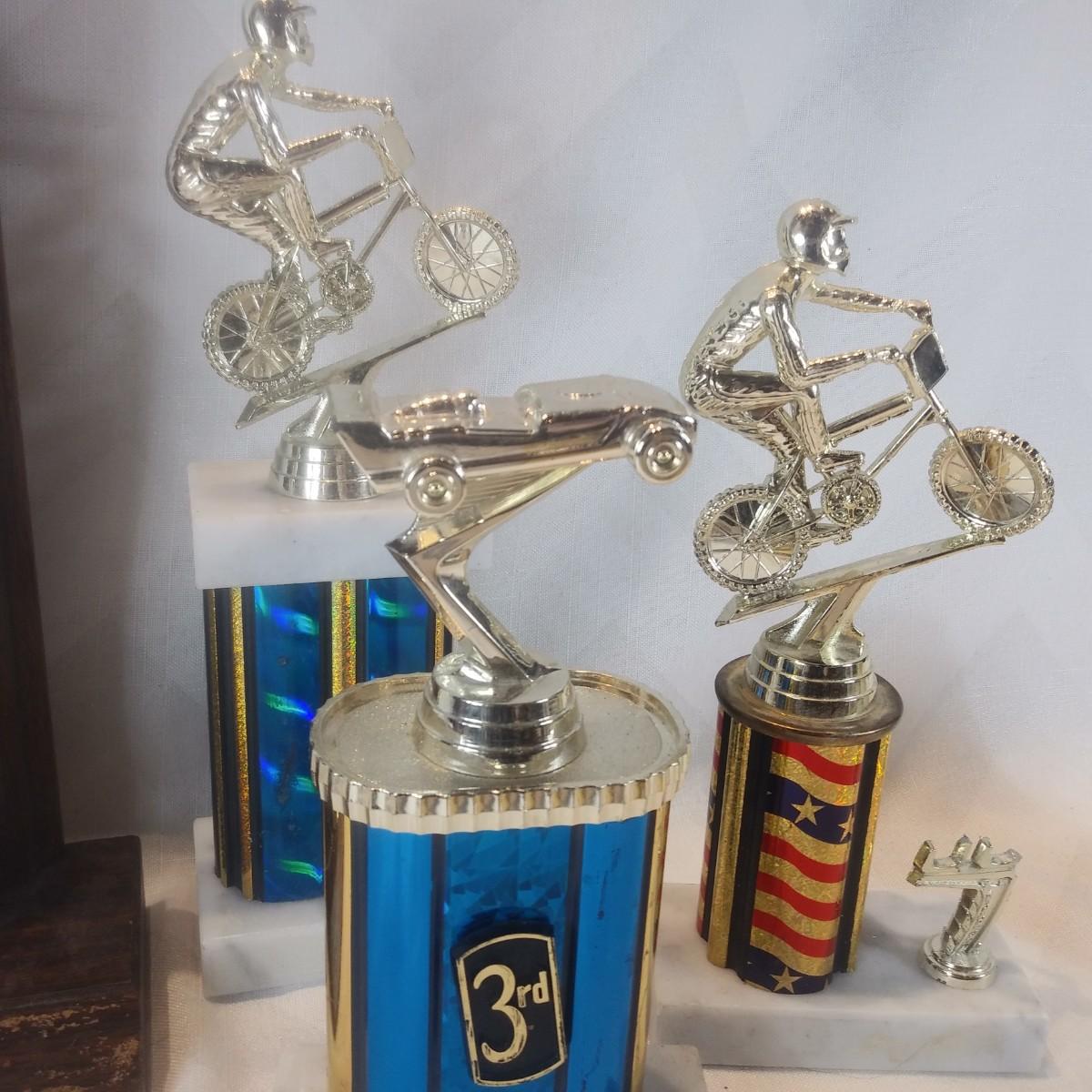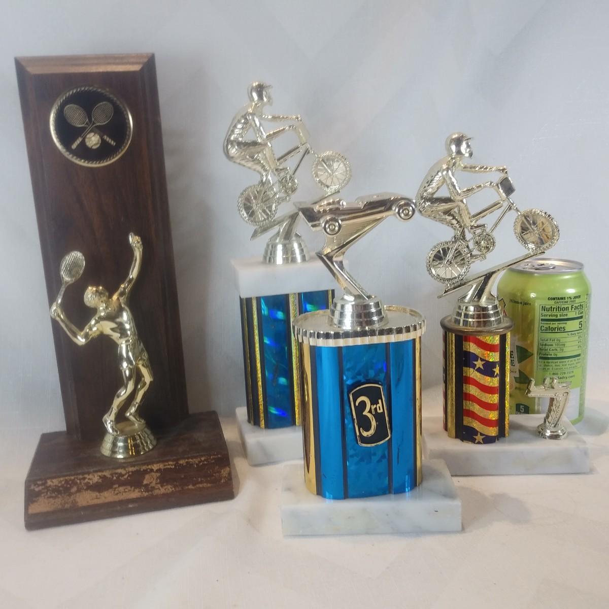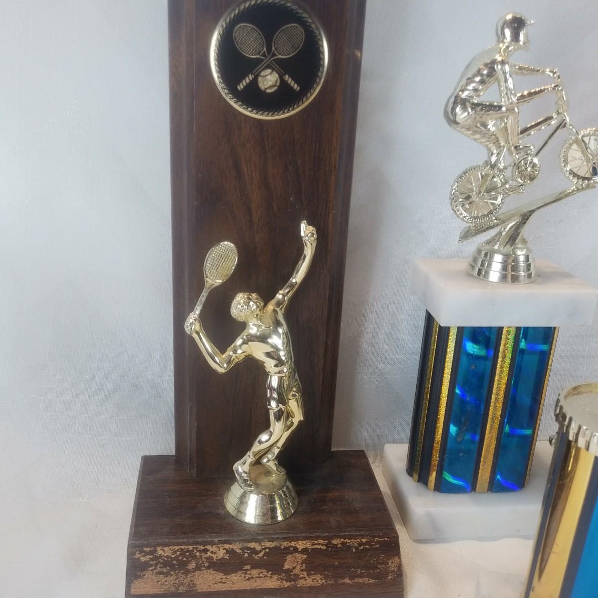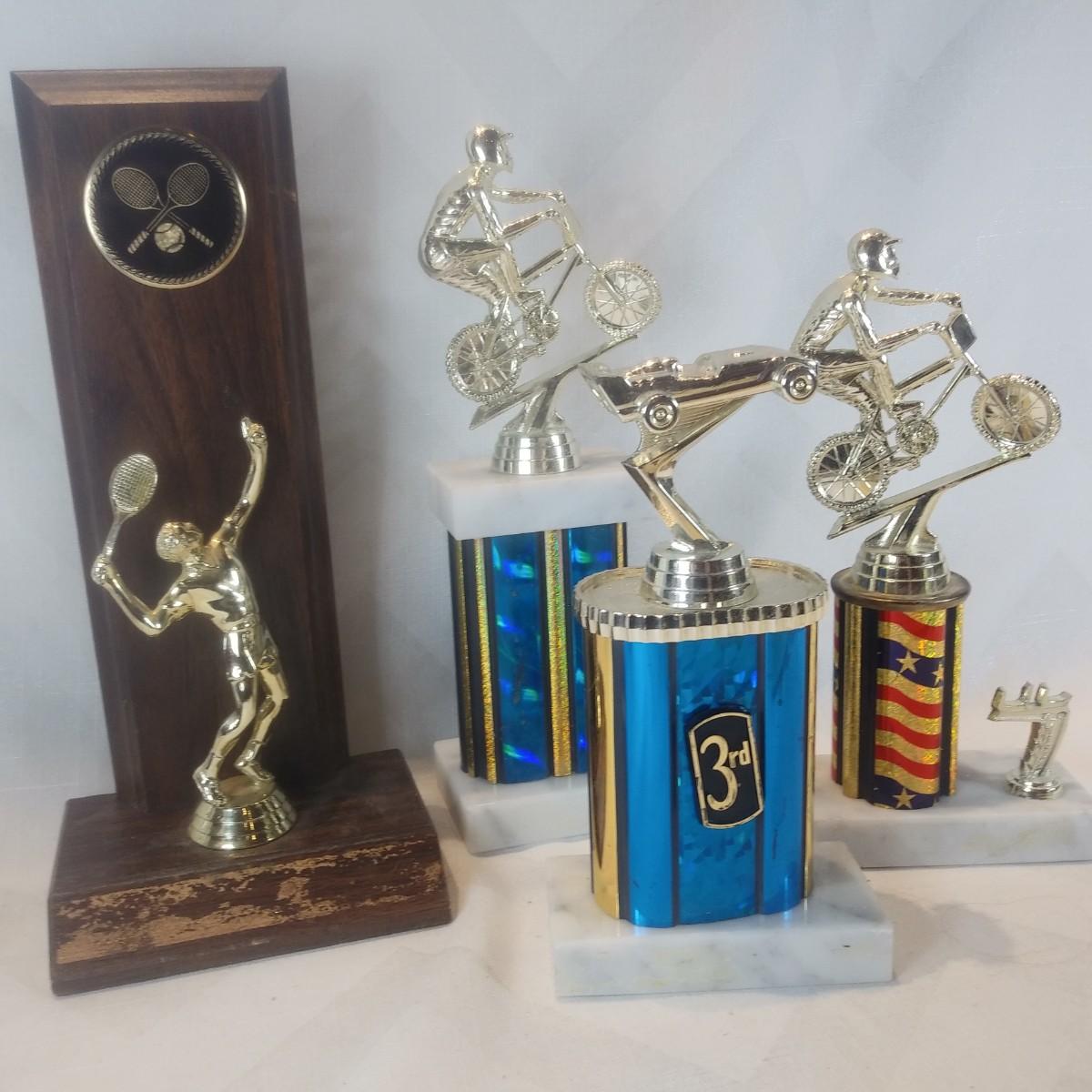 This auction lot is for a grouping of various Sports Trophies. iOne is wood, the other three have marble bases. All have plastic figures. Useful for display or many other crafty purposes.