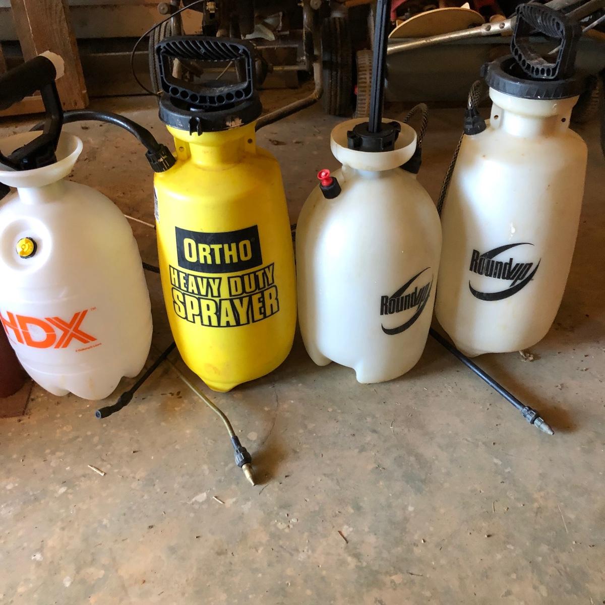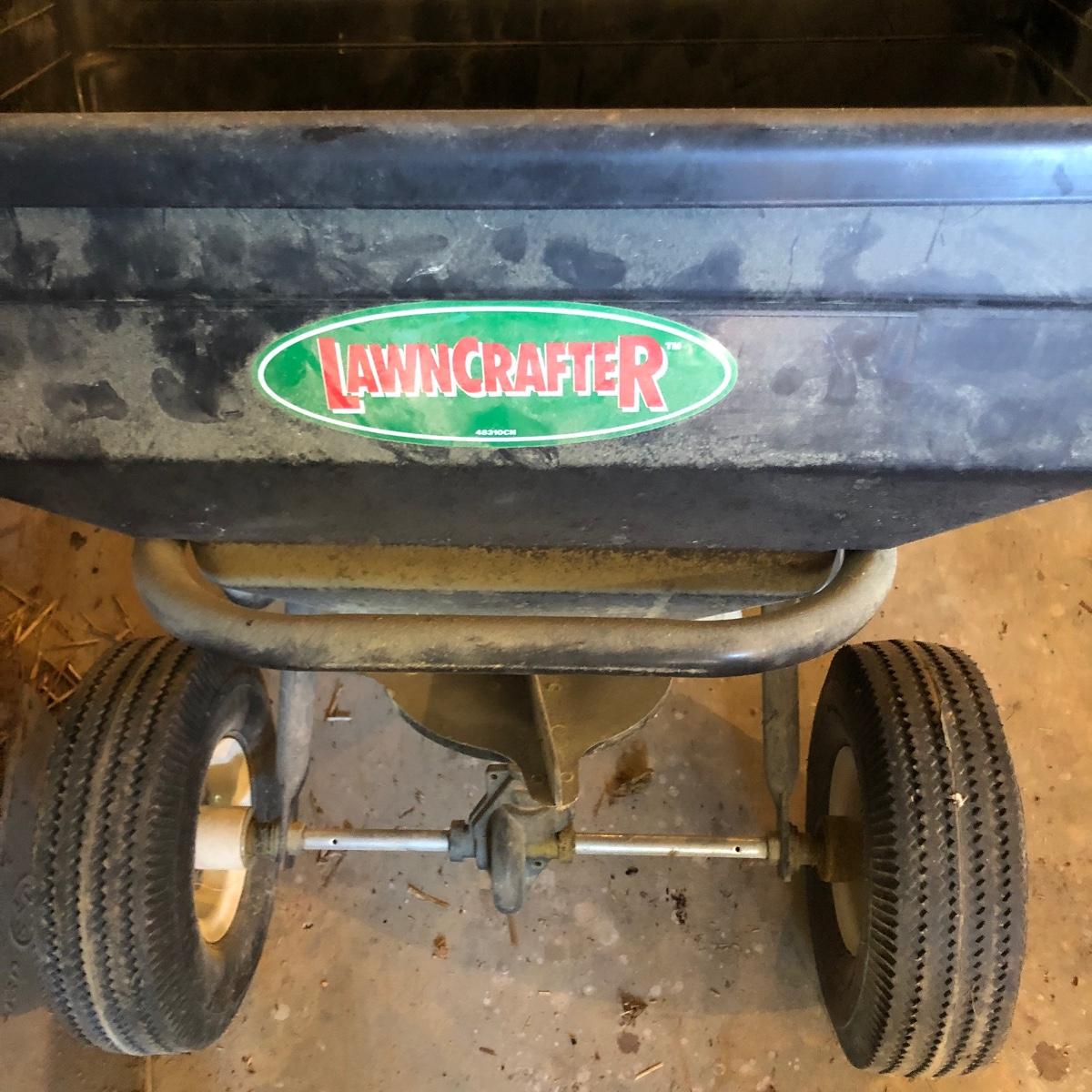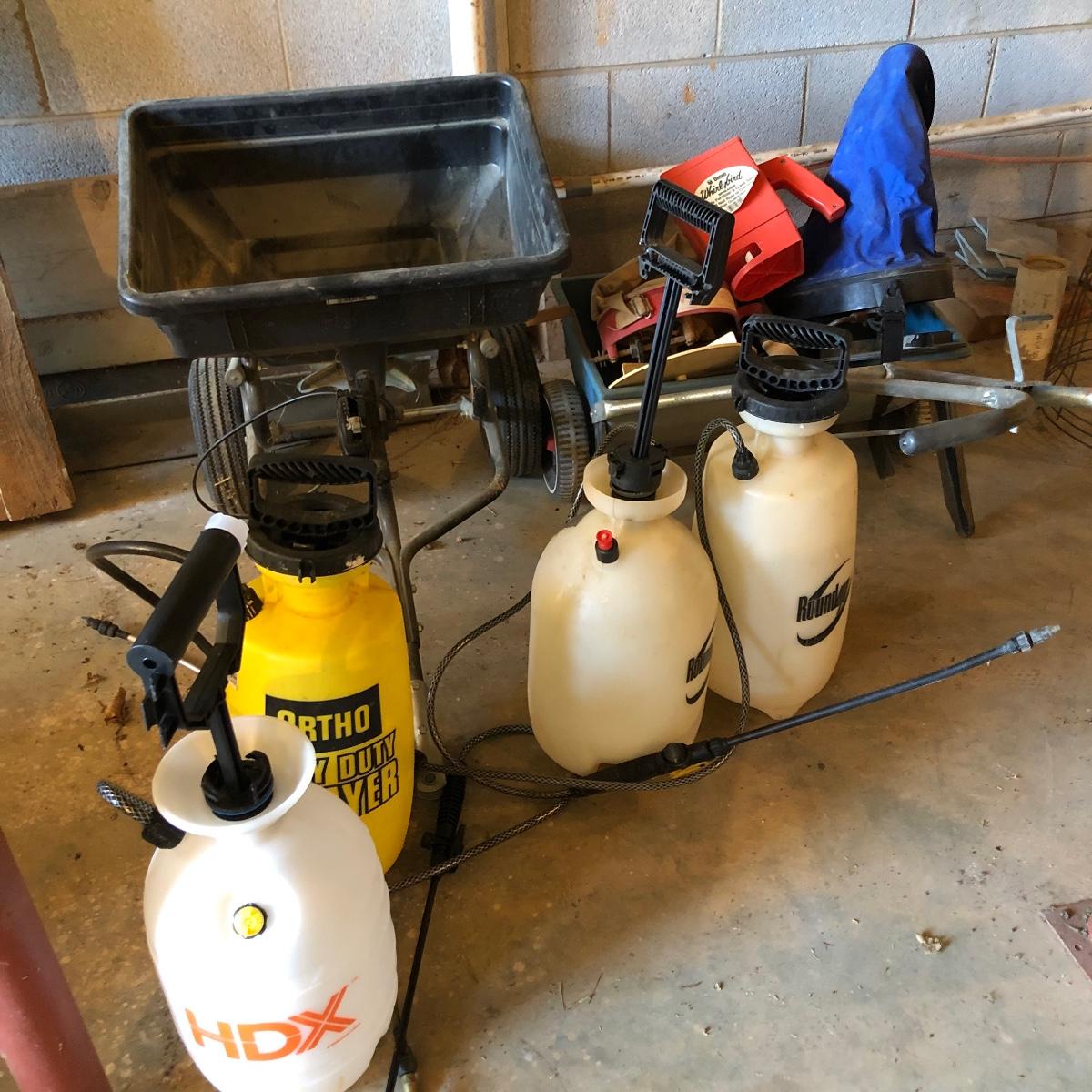 Lot includes a Lawncrafter pull behind spreader, Red Devil push spreader three hand spreaders and four two gallon sprayers.