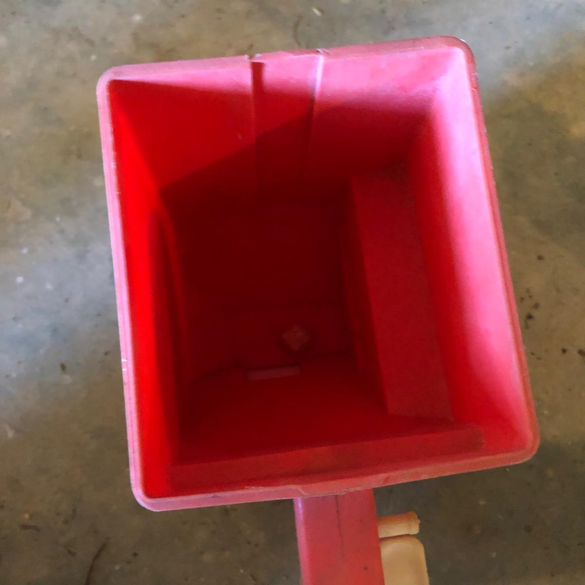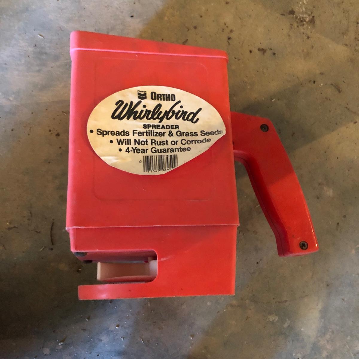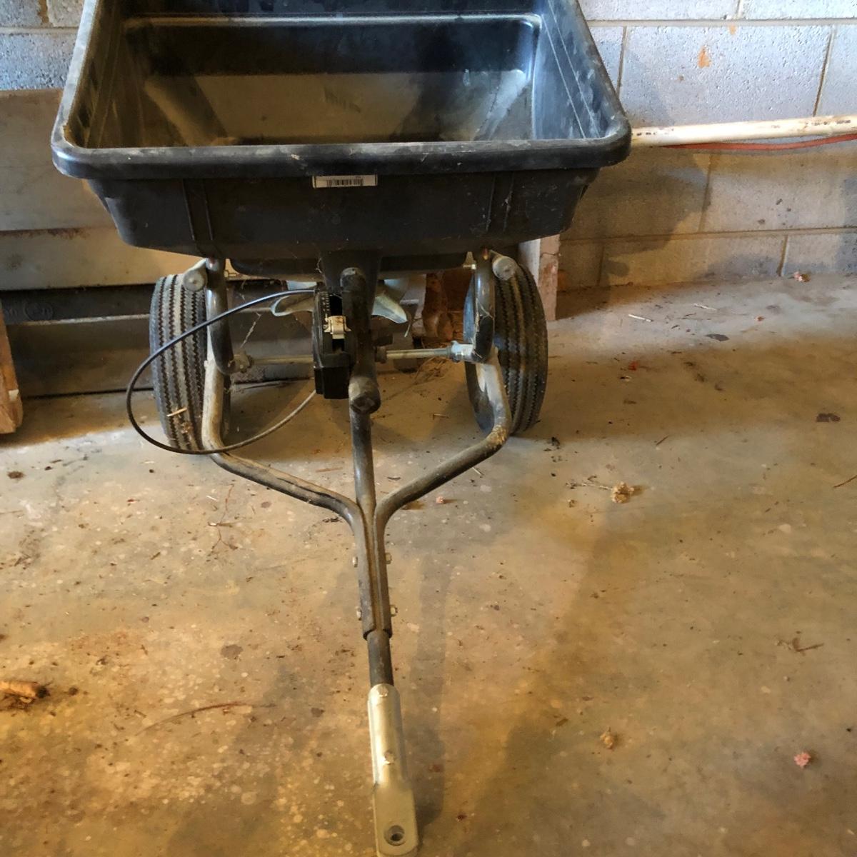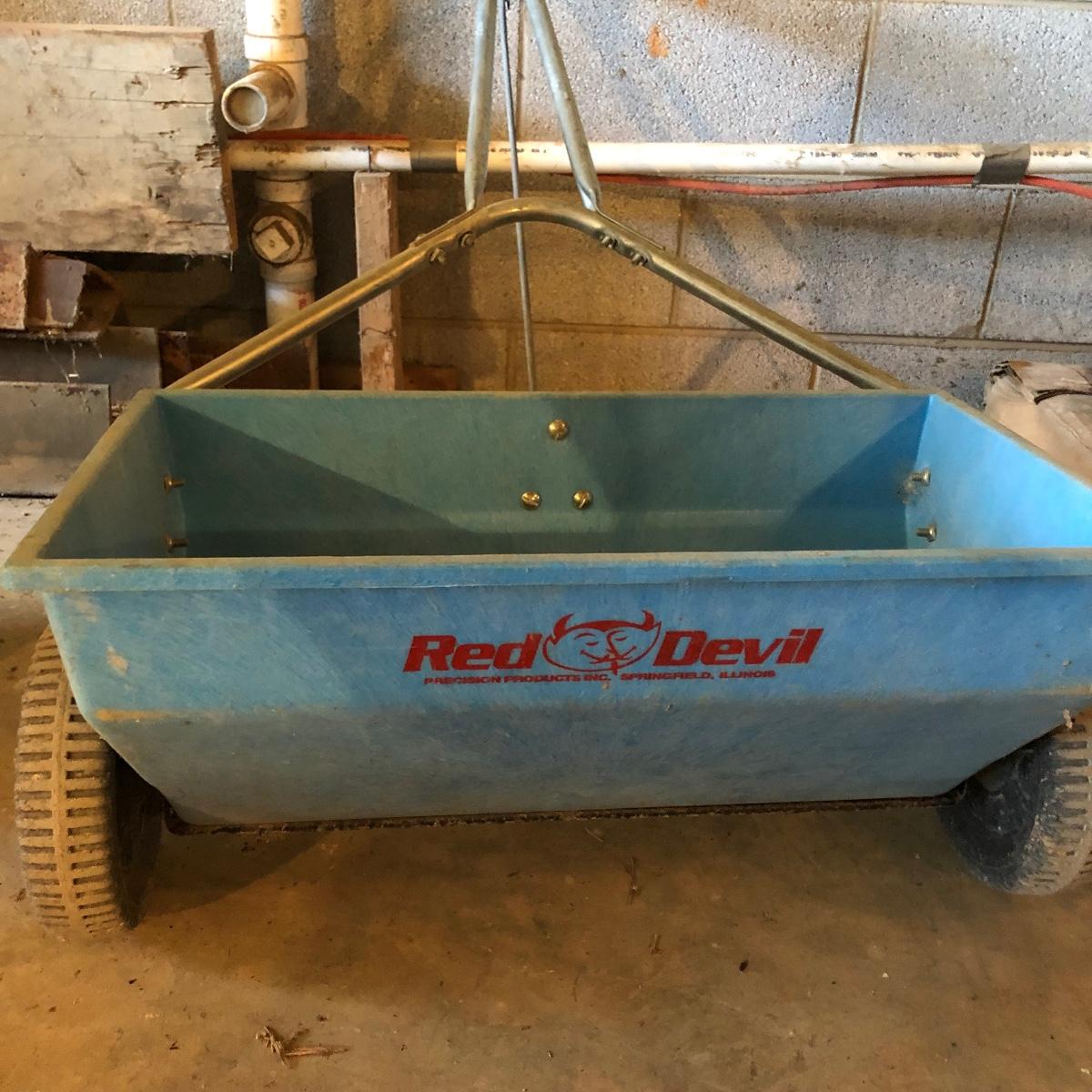 Lot includes a Lawncrafter pull behind spreader, Red Devil push spreader three hand spreaders and four two gallon sprayers.