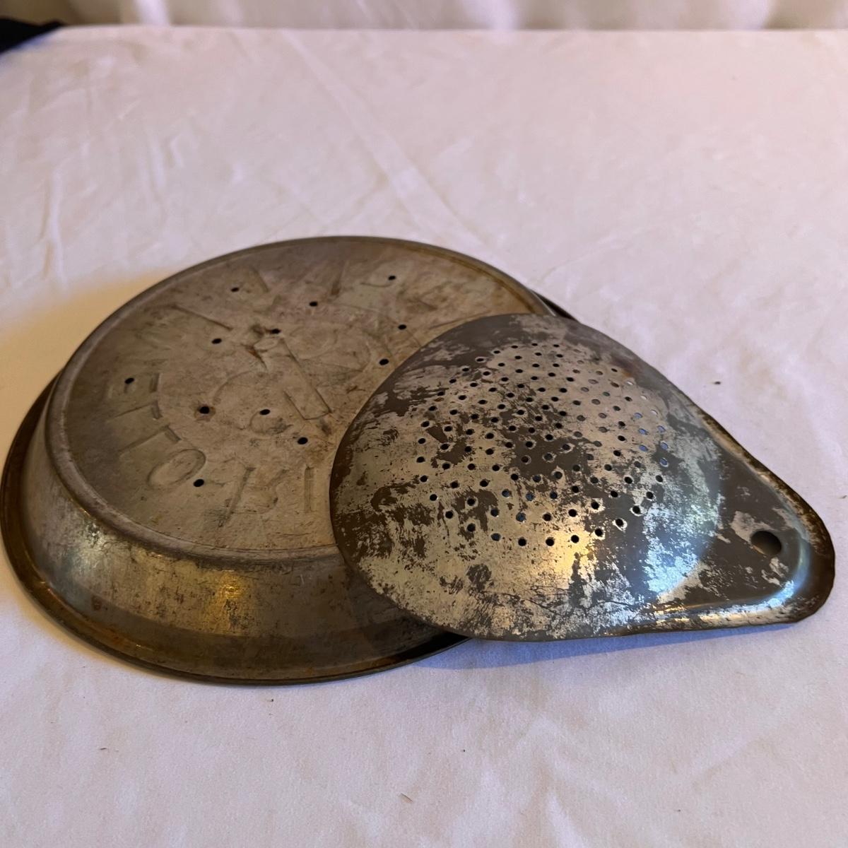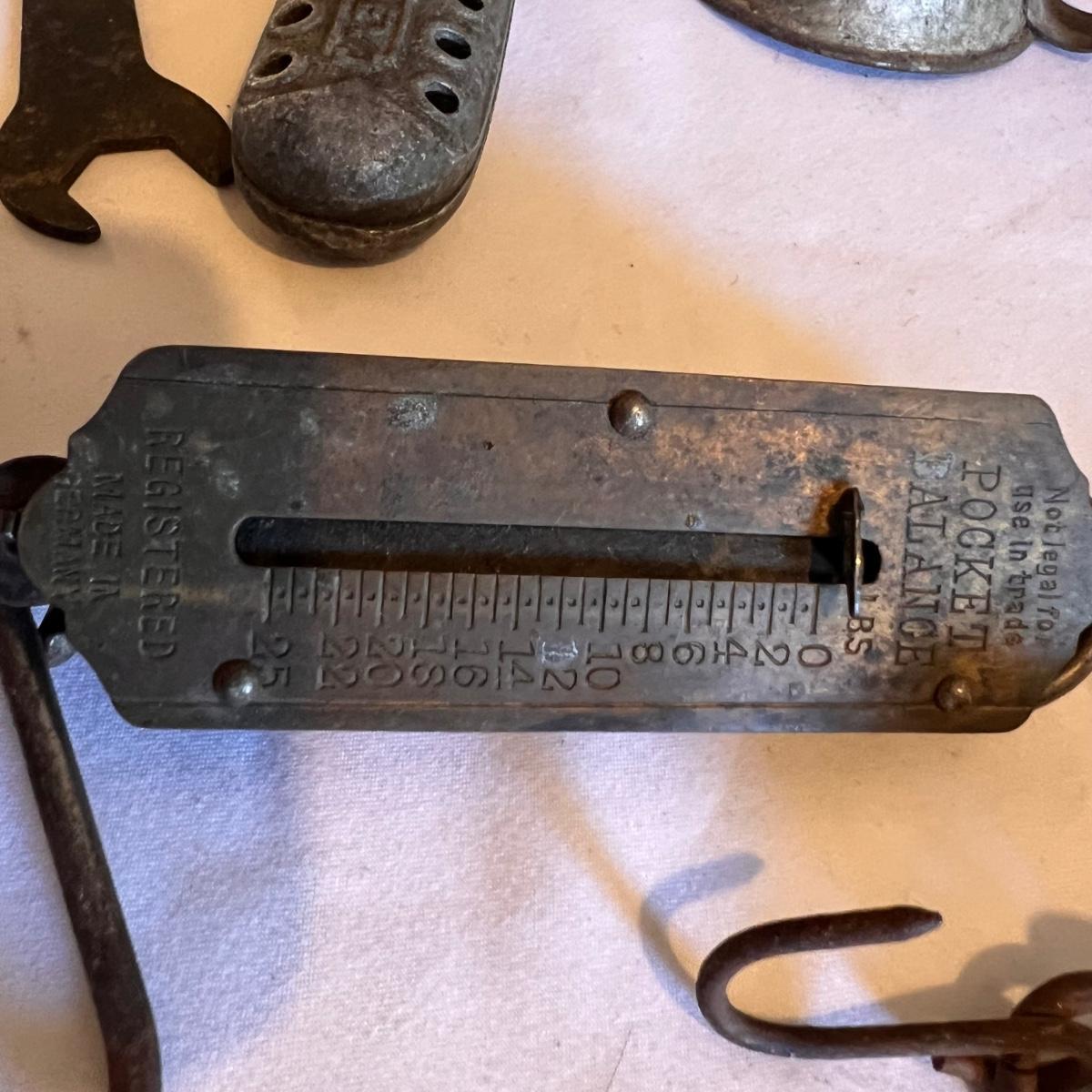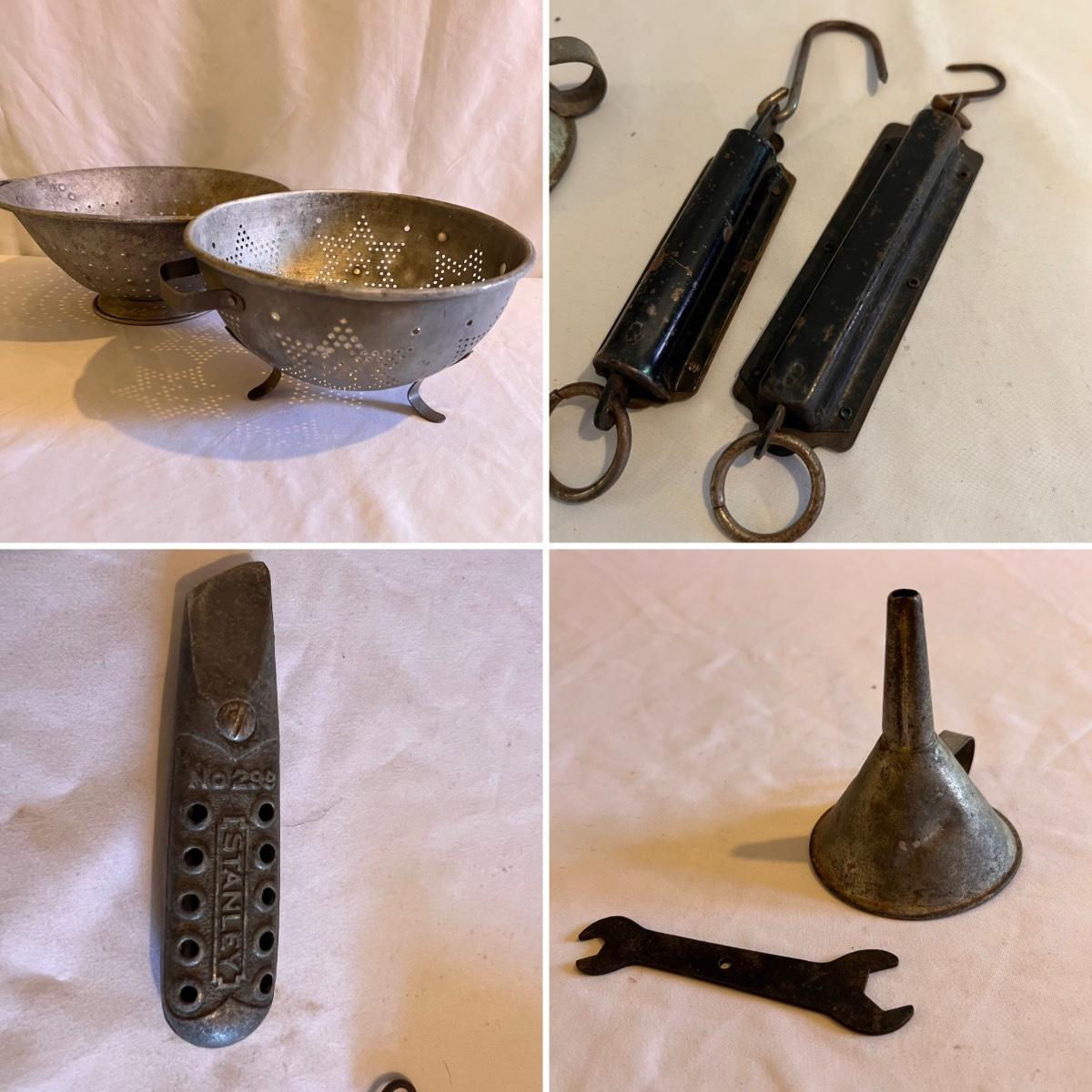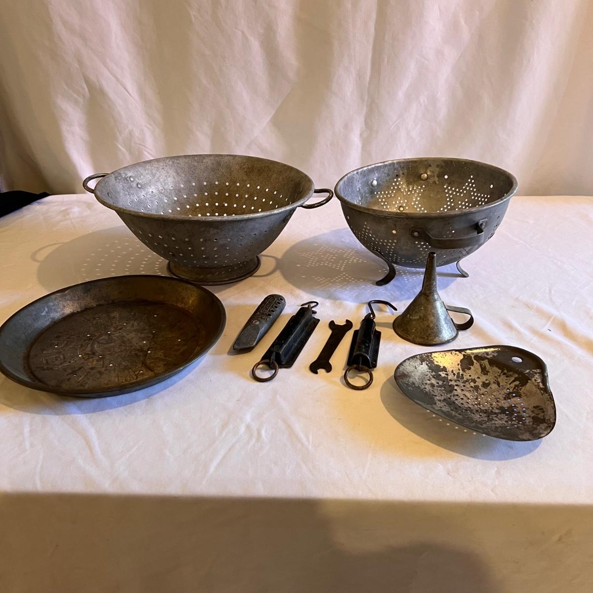 Nine items all with some age to them. The two spring balance scales are Central Scientific from Chicago and a Pocket Balance from Germany. Largest colander measures 12”D x 5”H.